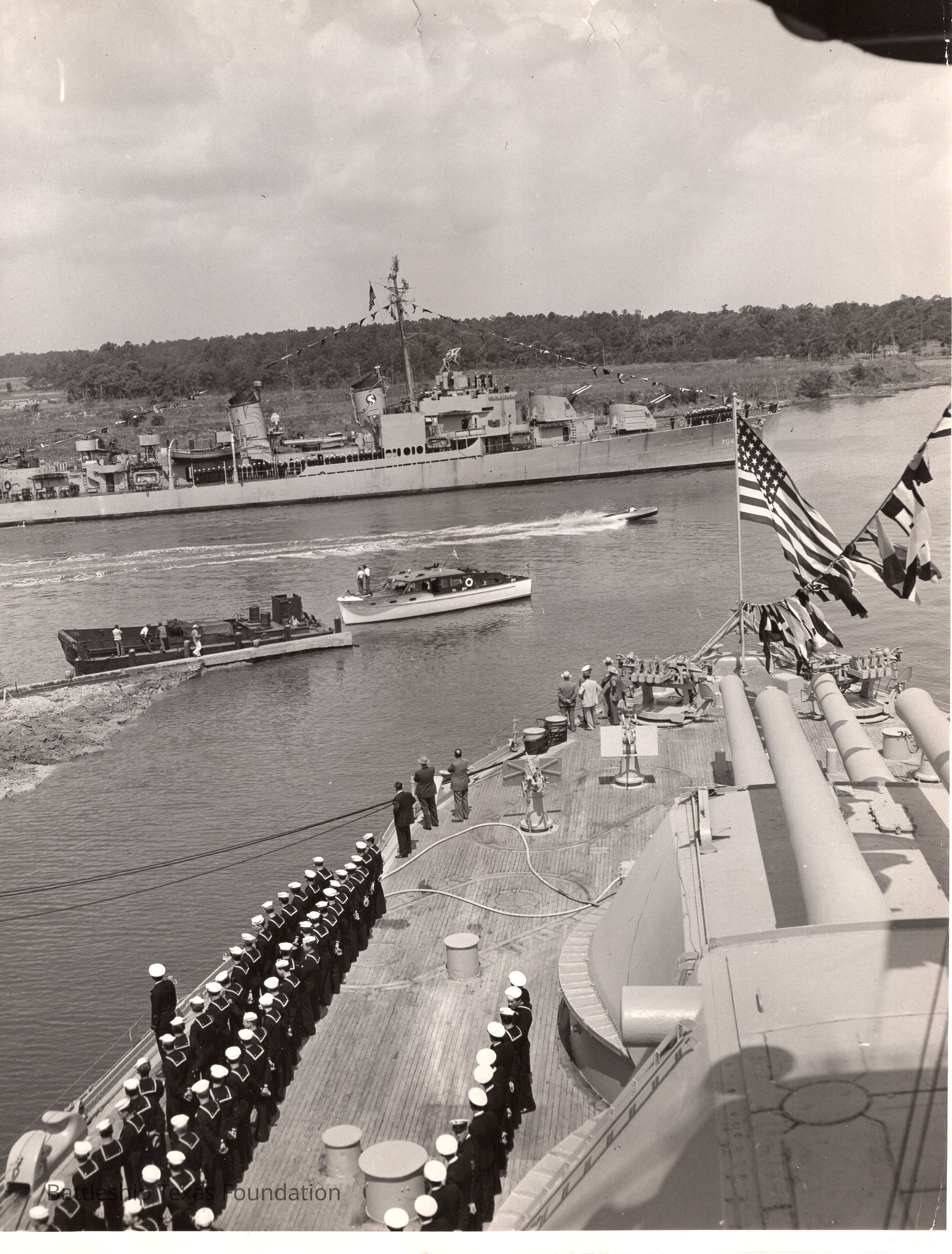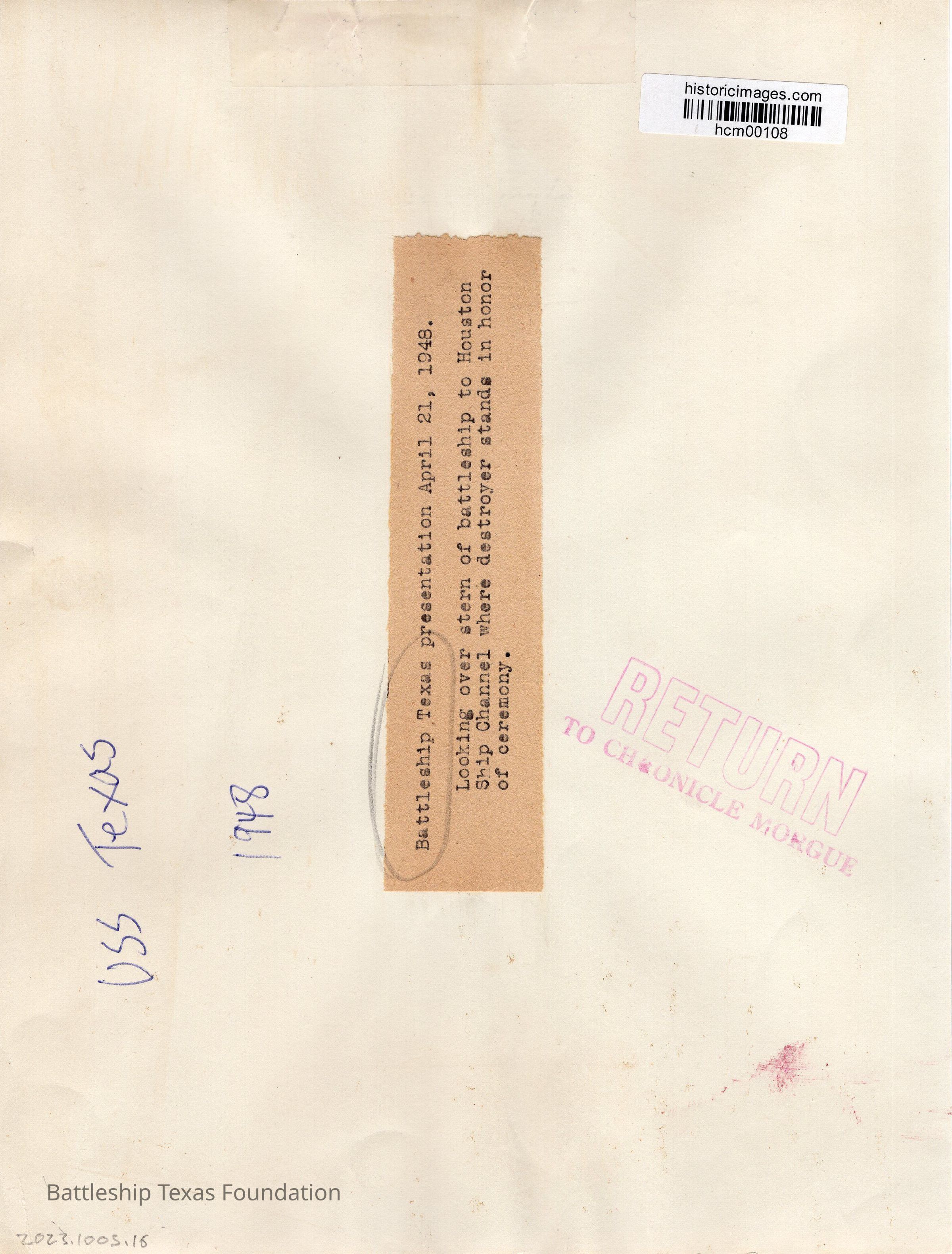 USS Borie (DD-704) sails to the right, passing behind Texas as several smaller craft sail between. Men stand at attention on the starboard side of Texas. Back has written in pen "USS Texas 1948" and dated to April 21, 1948.Context