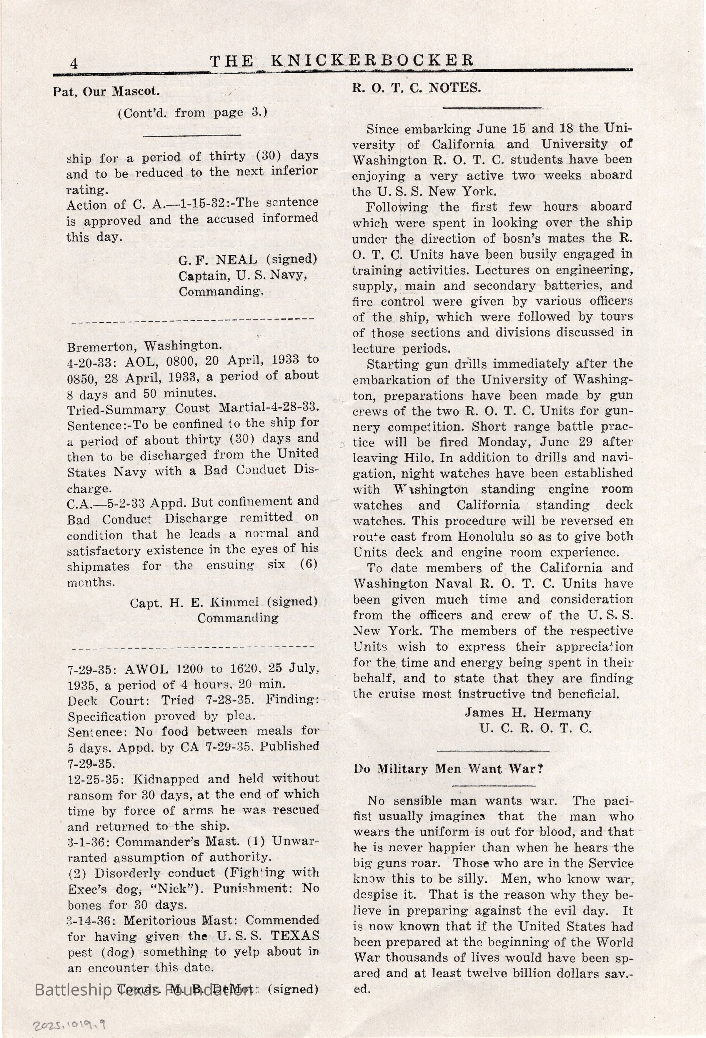 The Knickerbocker was a weekly paper published jointly by the midshipmen and enlisted men of Battleship New York.Collection
