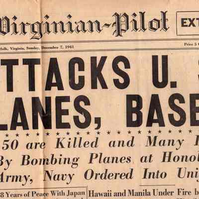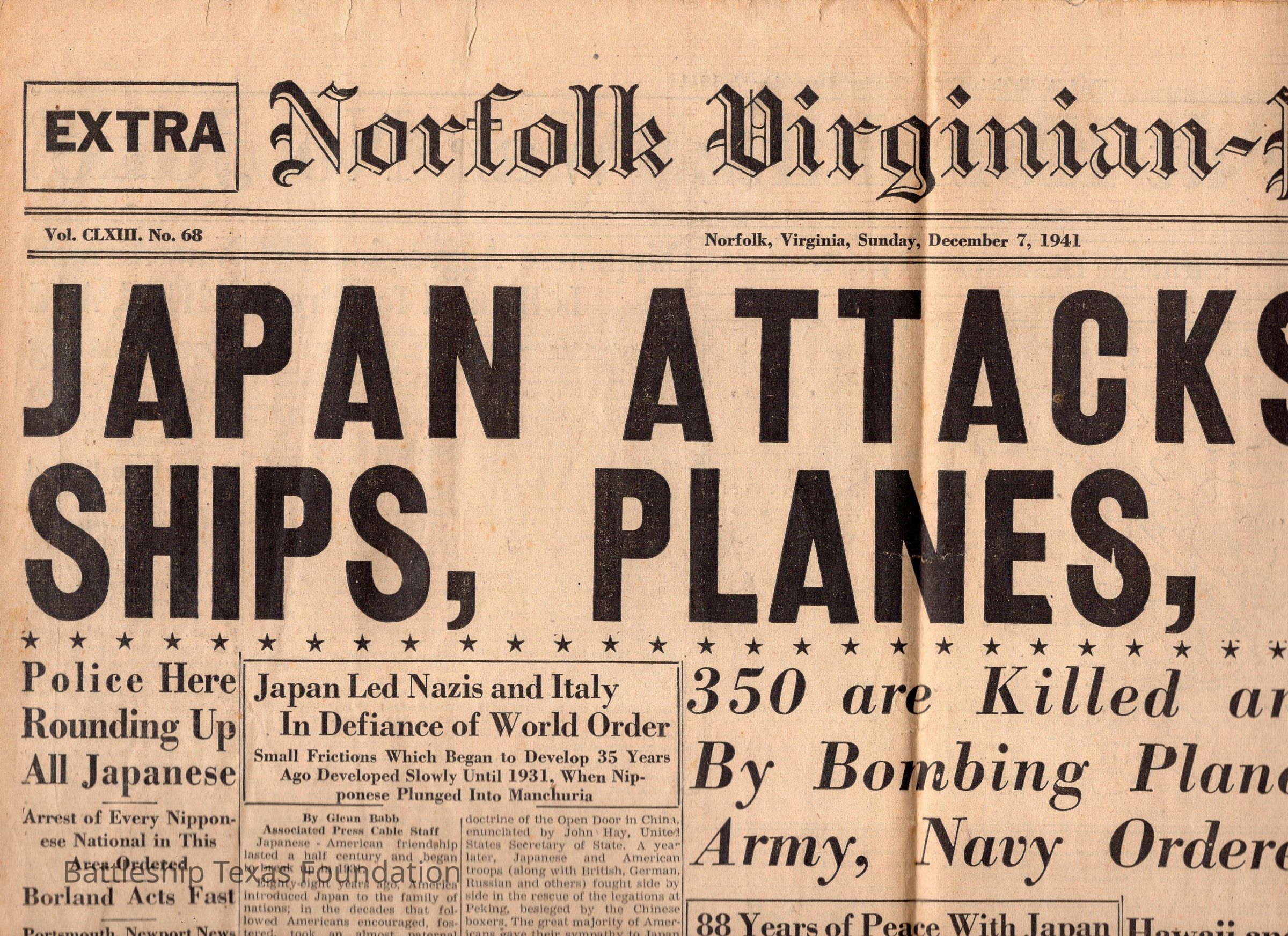 Front page of Norfolk Virginian-Pilot newspaper published on December 7, 1941 reporting the Japanese attack on Pearl Harbor.Context