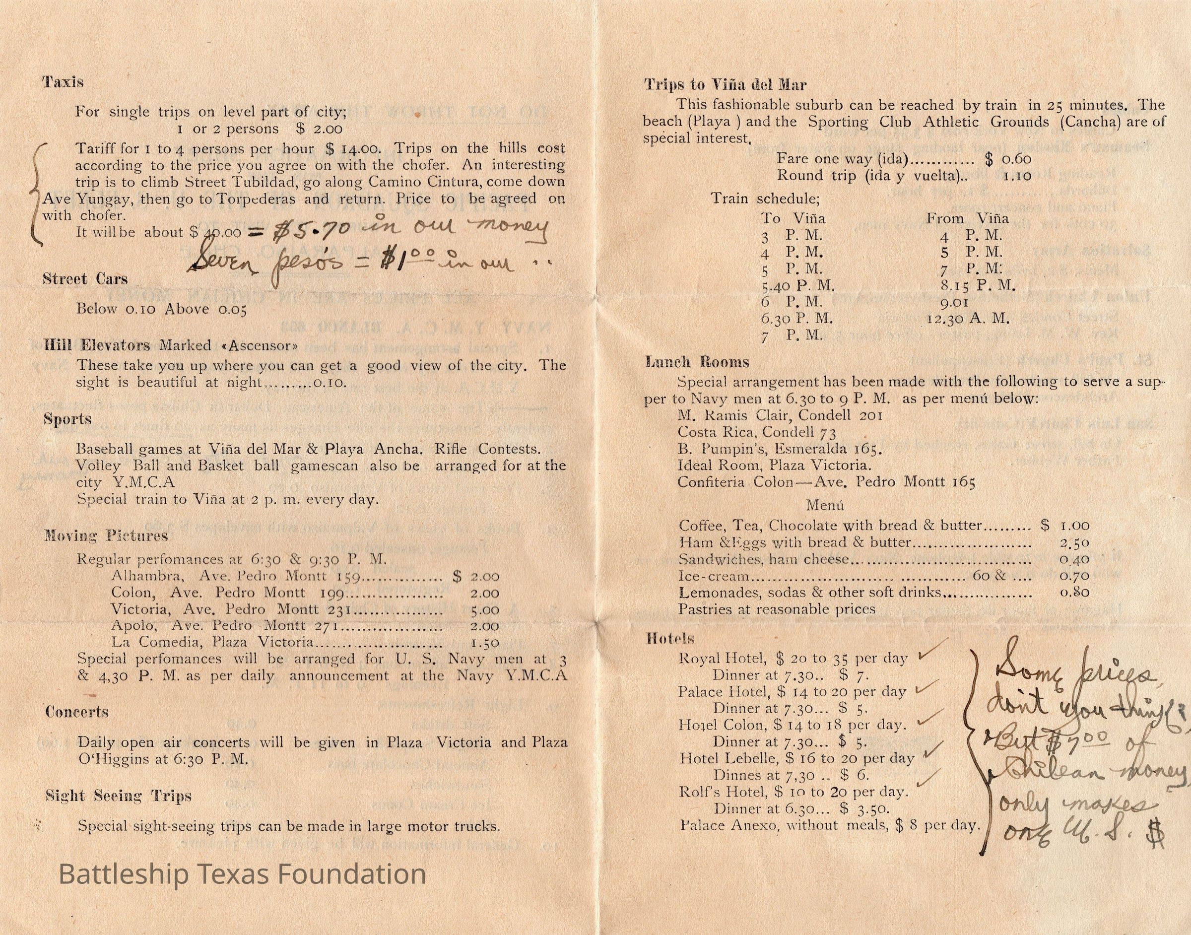 information sheet given to sailors and marines as they made port in Chile. Includes places of interest men can visit while on leave from recreation to religion.Context