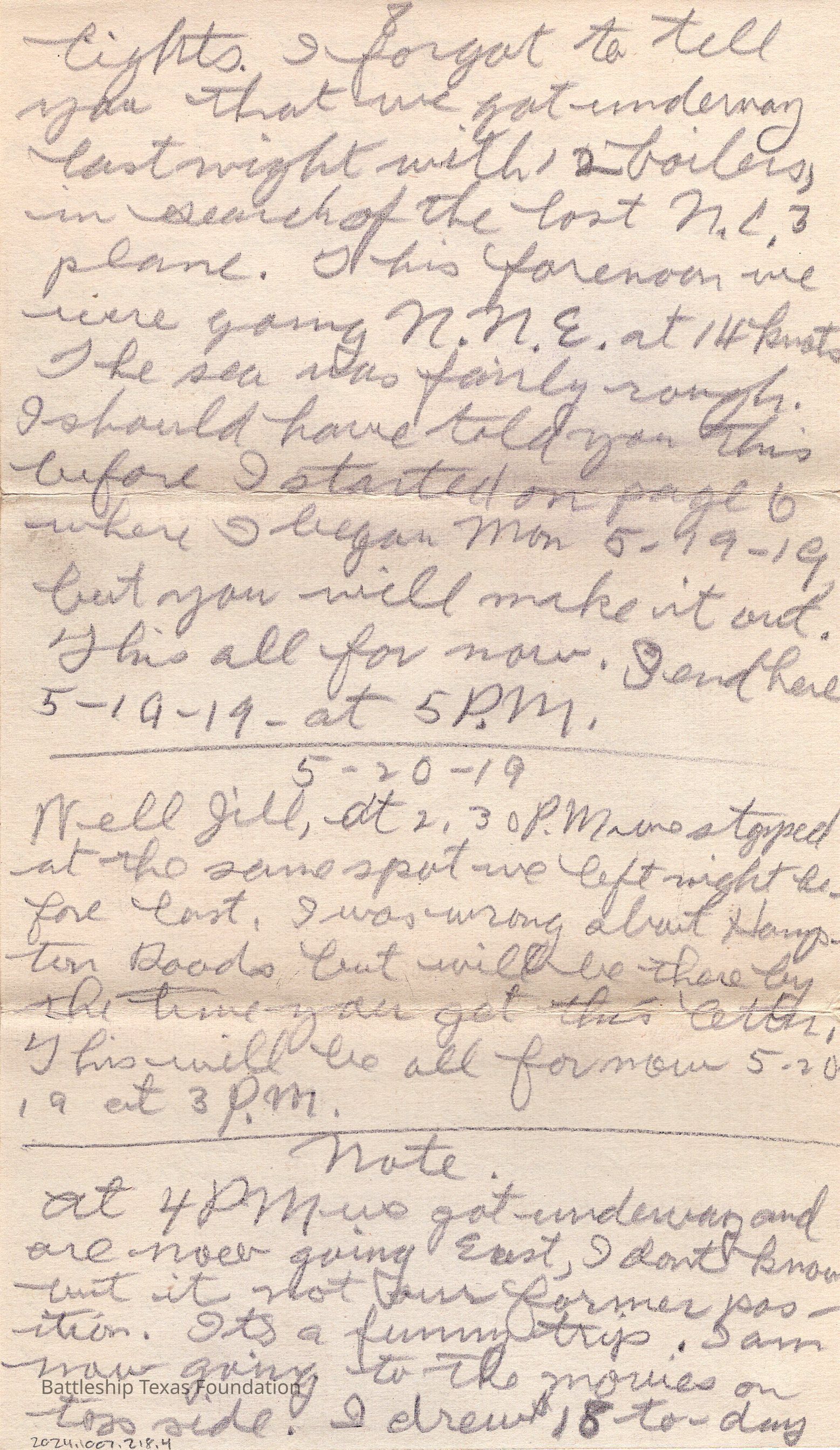 John Lamson was a MM1c on Battleship Texas from May 1917 to June 1919. Throughout his time on Texas, he sent a letter to his family at least once a week, often more. Longer stretches of absence are explained either by movement across the Atlantic, or with the Grand Fleet.