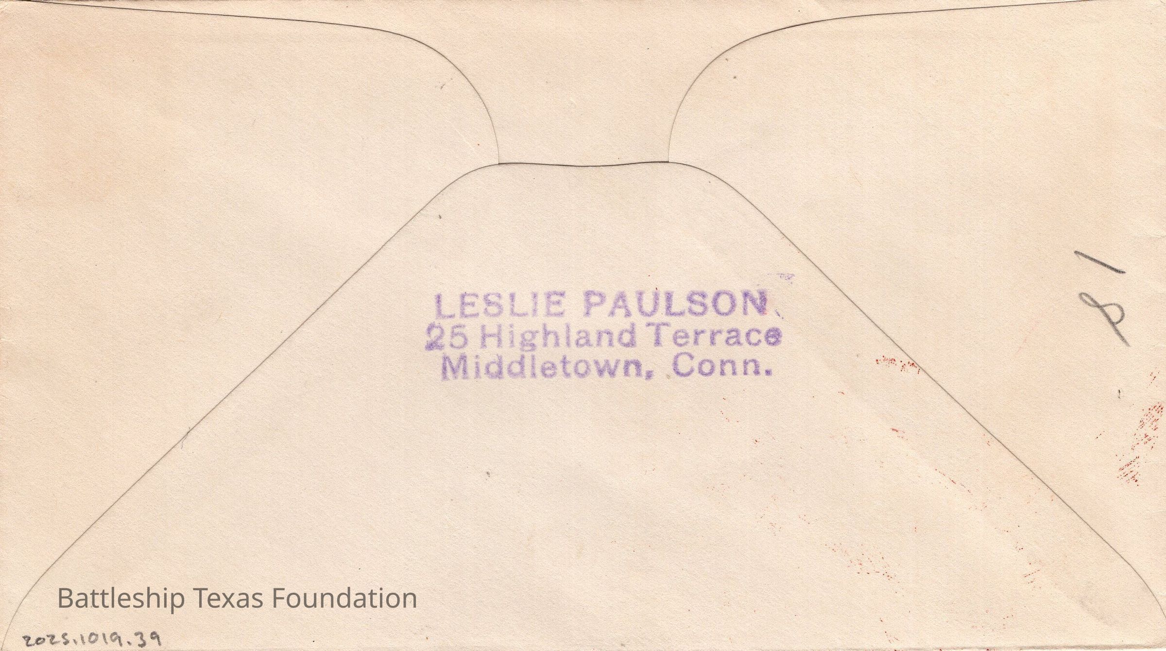 Addressed to Rosa Lee Ralph. Envelope sent from USS Texas on the afternoon of October 27, 1937, when the ship was in Baltimore, Maryland to Seattle, Washington. Features a large Navy Day stamp with an eagle spreading its wings peached in front of a ship's helm.Context