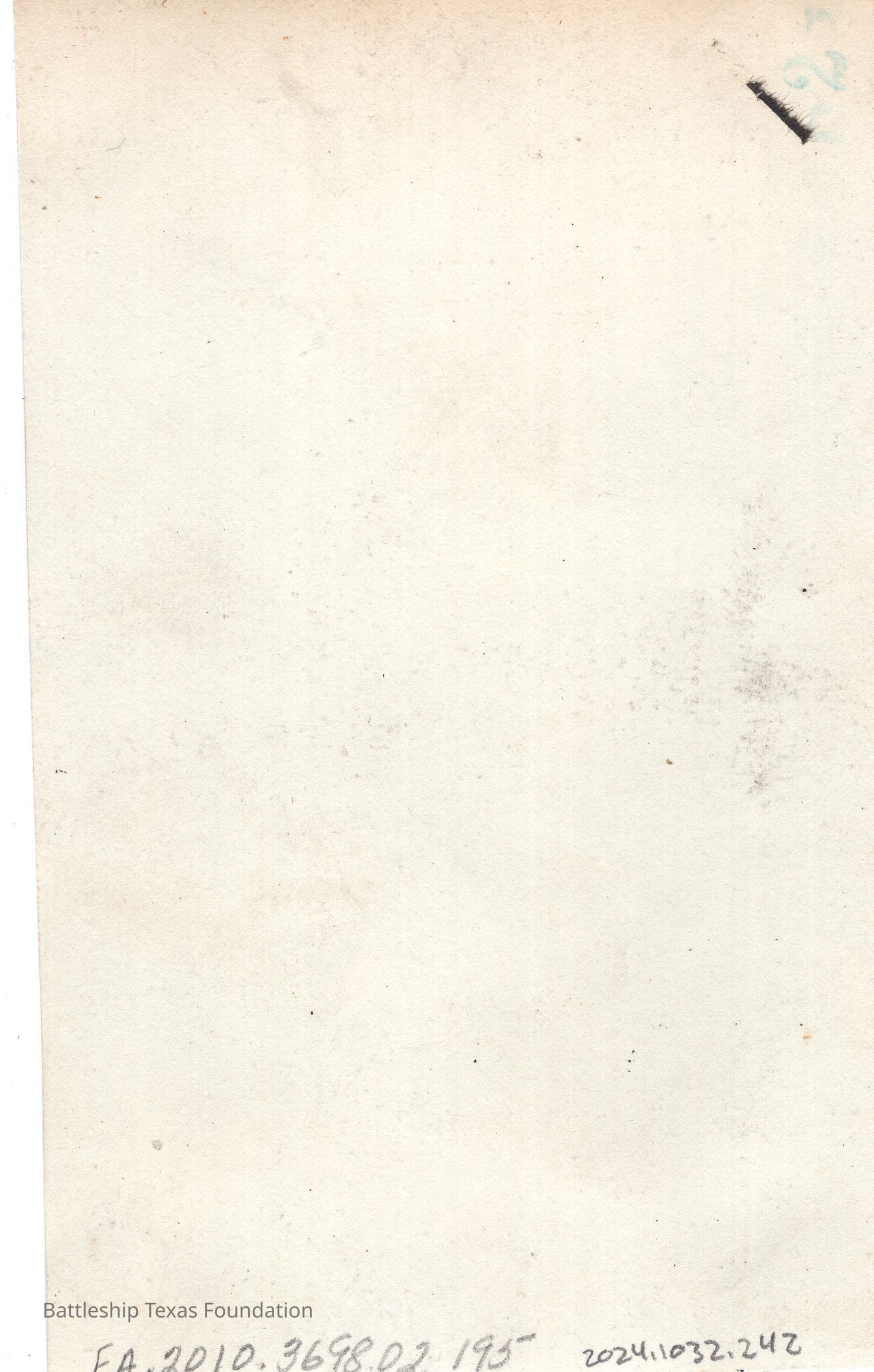 From a donated collection of individual photographs and pages out of a Texas crewmember's photo album. Items donated by the Los Angeles Maritime Museum.