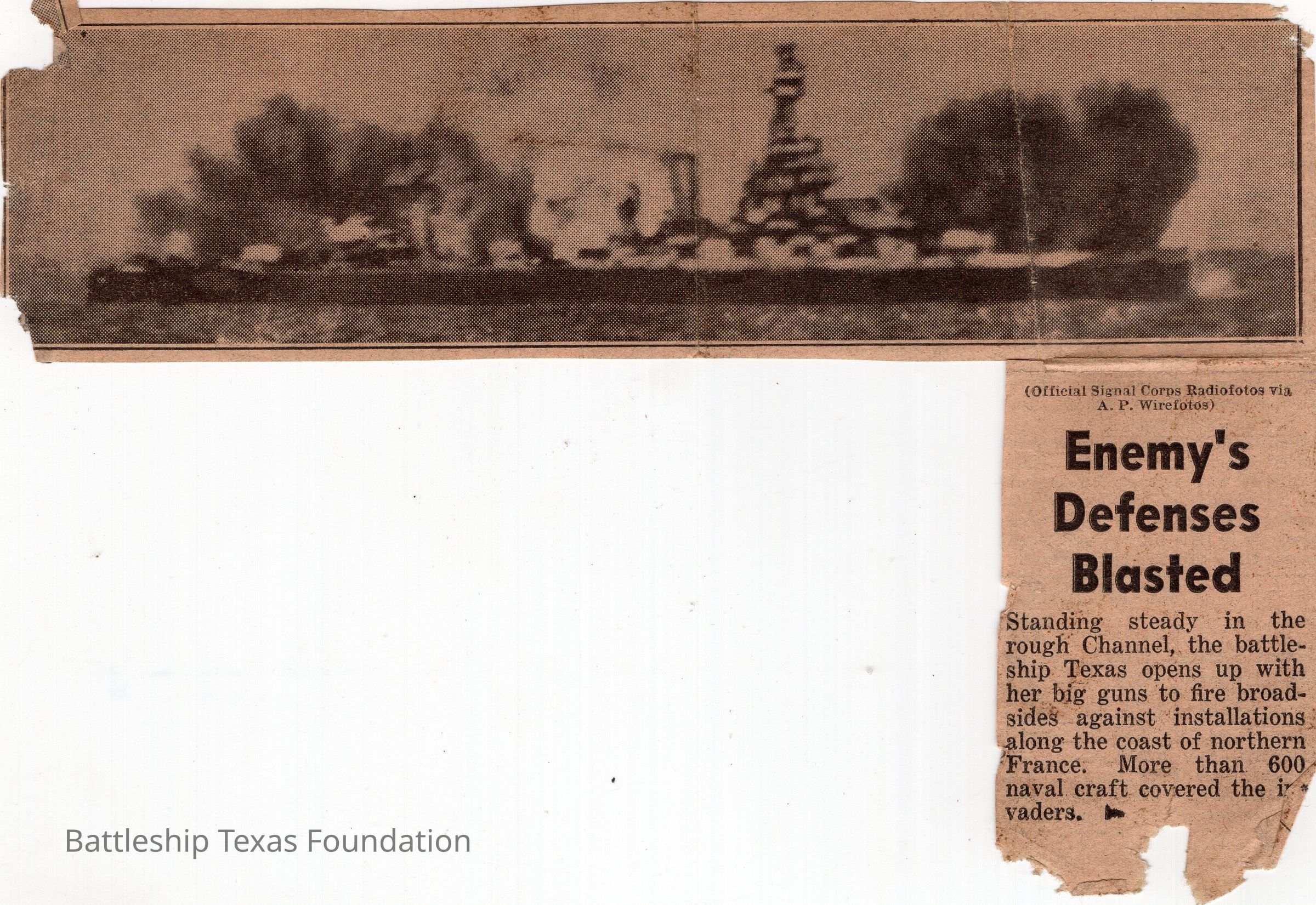 "L" shaped newspaper clipping of Battleship Texas' actions in North France in article titled "Enemy's Defenses Blasted" with photograph of Texas firing broadside.Context