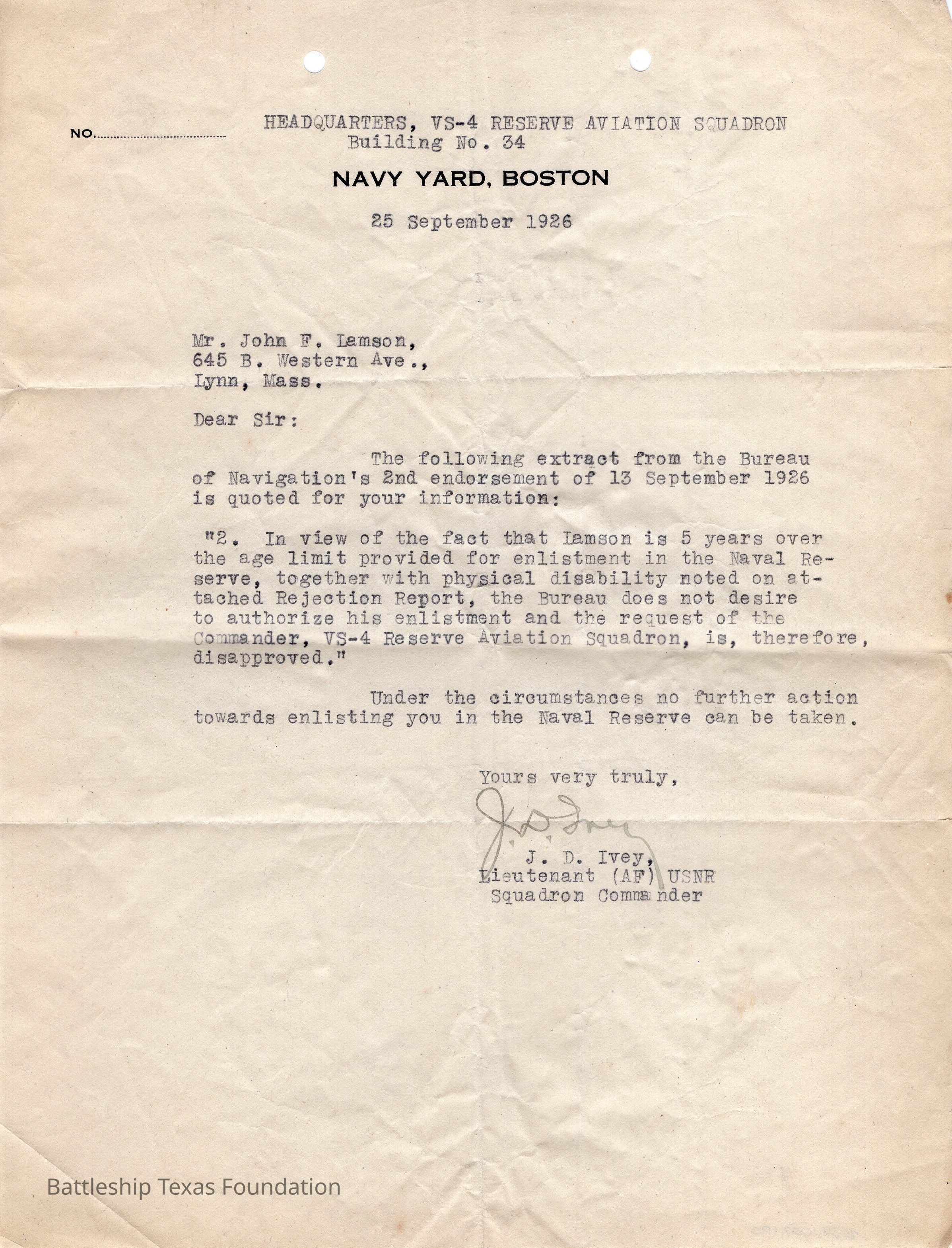 Letter to John Lamson disapproving of his further enlistment due to age and dissability. Dated @5 September 1926 from Navy Yard, Boston.Context