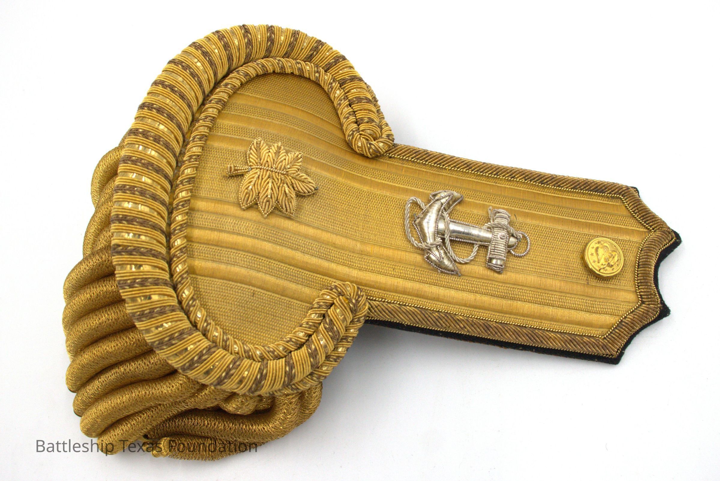 Right epaulette belonging to Charles Pratt. O-4 gold maple leaf below fouled anchorContext