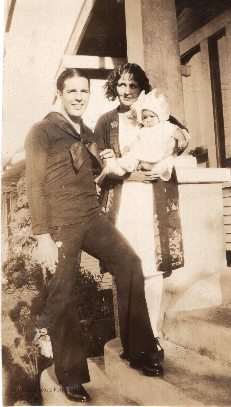 Features a sailor standing next to a woman holding a young child in front of a house.Context