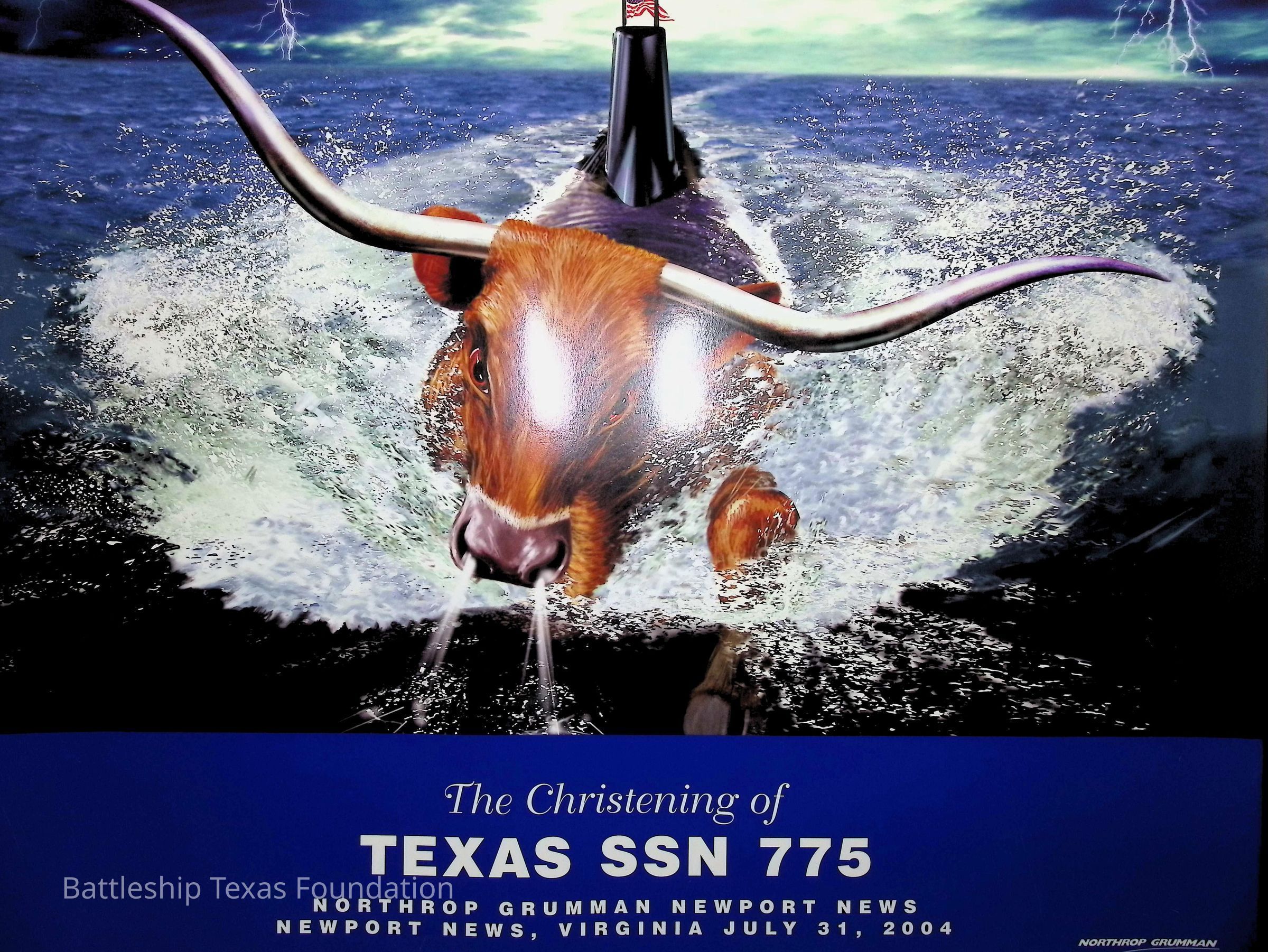 Large poster honoring the christening of the submarine USS Texas (SNN-775) made by Northrop Grumman in Newport News. Dated July 31, 2004. Poster depicts submarine with a longhorn head cutting through the water.Context