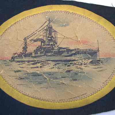 Green pennant with a dreadnought battleship pictured. Ship is meant to resemble Texas. Image next to large yellow letters spelling "U.S.NAVY". Picture is bordered with yellow fabric, as is the edge of the pennant.Context