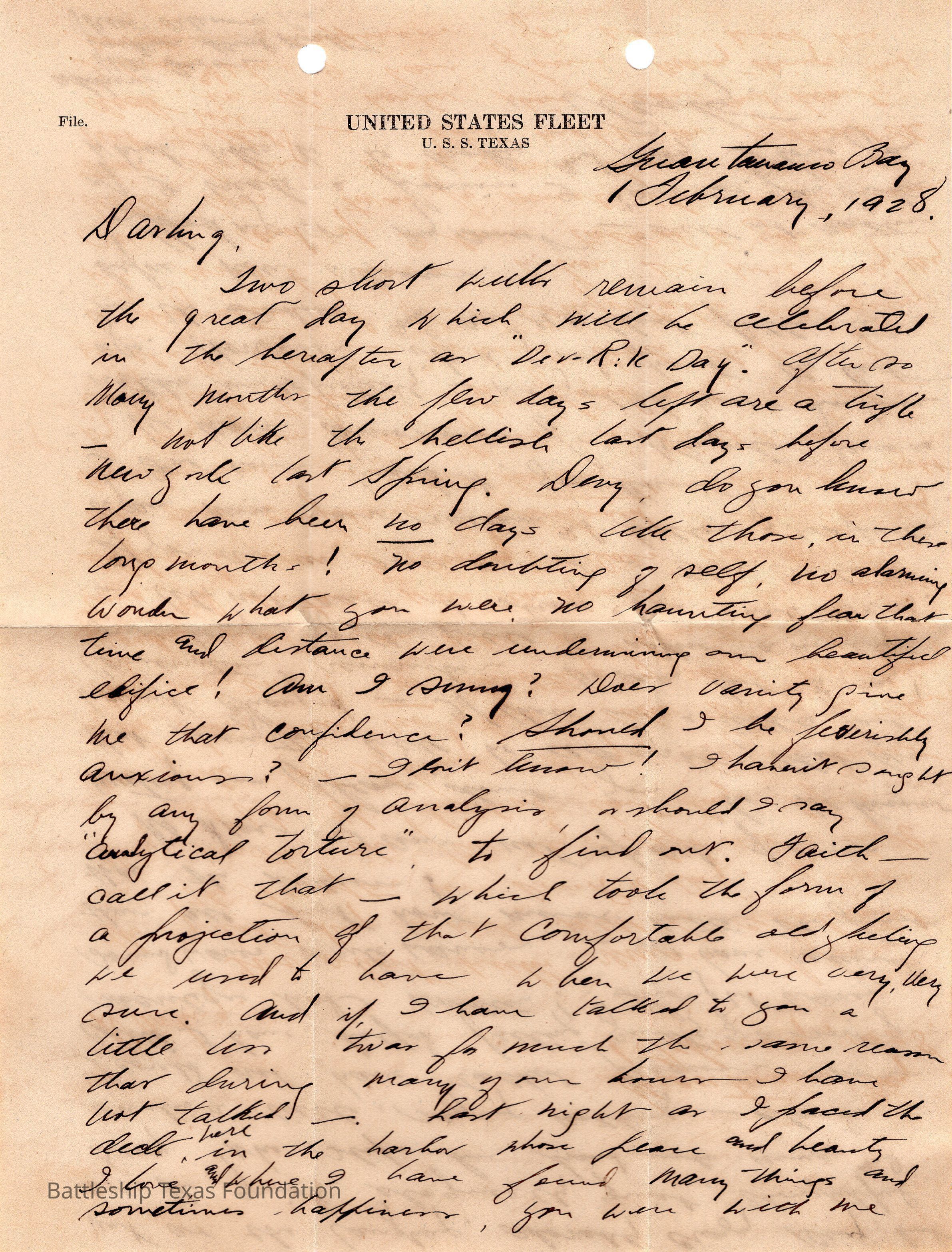 Letter addressed to Darling, from Guantanamo Bay, Cuba on ! February, 1928. "UNITED STATES FLEET U.S.S. TEXAS" letterheadContext