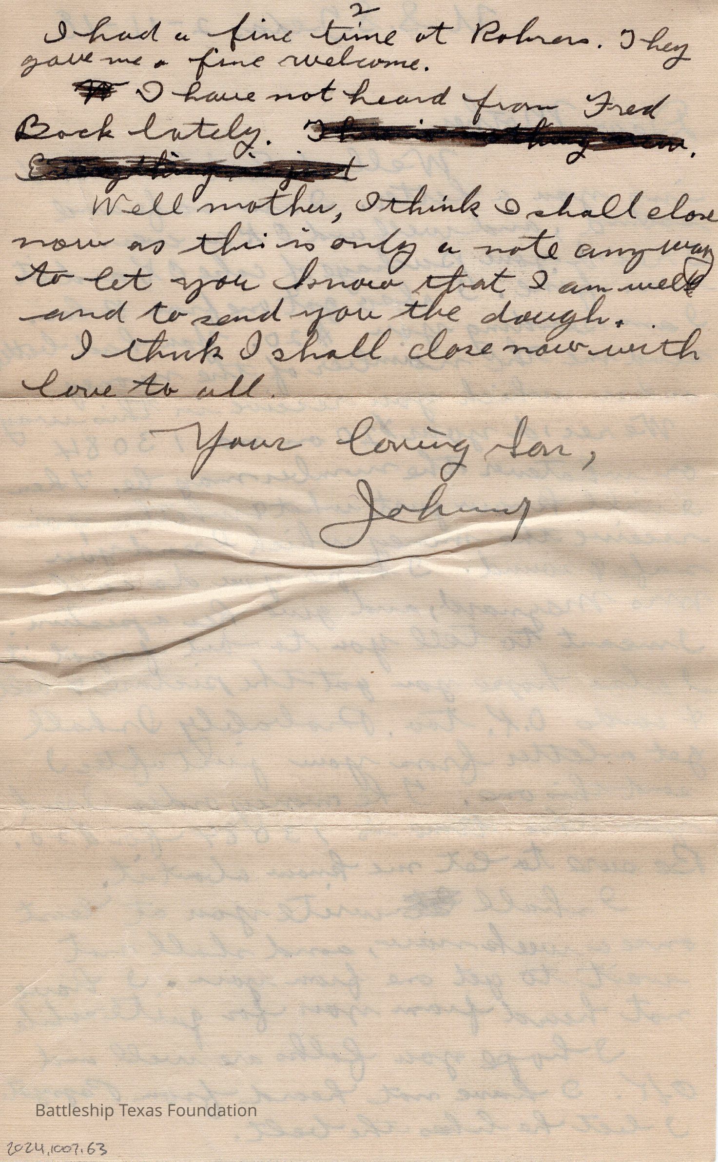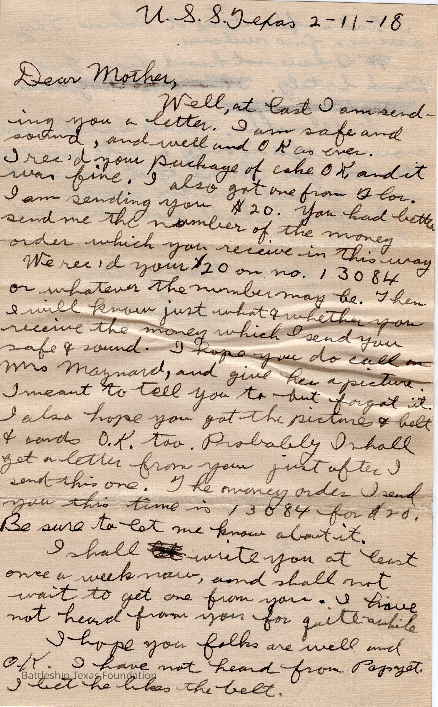 Letter dated 2-11-18 and addressed to mother. "U.S.S. Texas" written next to date. Line inked out on back.Context