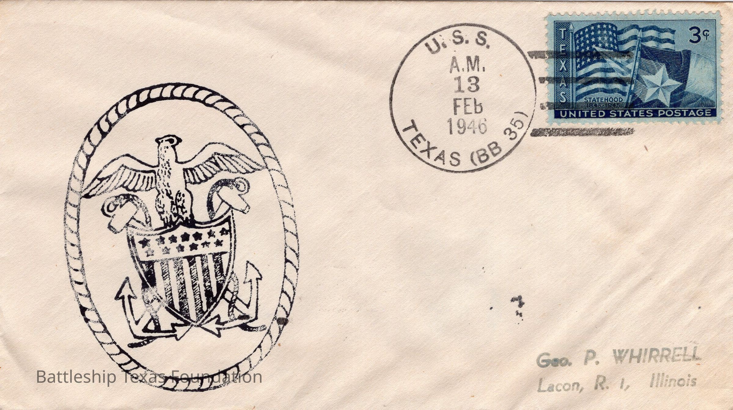Addressed to Geo. P. Whirrel. Envelope sent from USS Texas on the morning of February 13, 1946, to Lacon, Illinois. Features a stamp of the Naval Officer Crest with the eagle facing to the right, rather than the left, likely owing to the maker carving the stamp with the "correct" image, rather than its reflection.Context