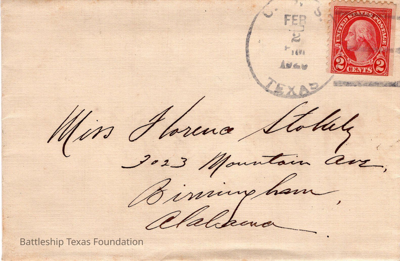 Envelope addressed to Miss Florence Stokely, stamped "U.S.S. FEB 2 1928 TEXAS" with a red Washington stamp.Context