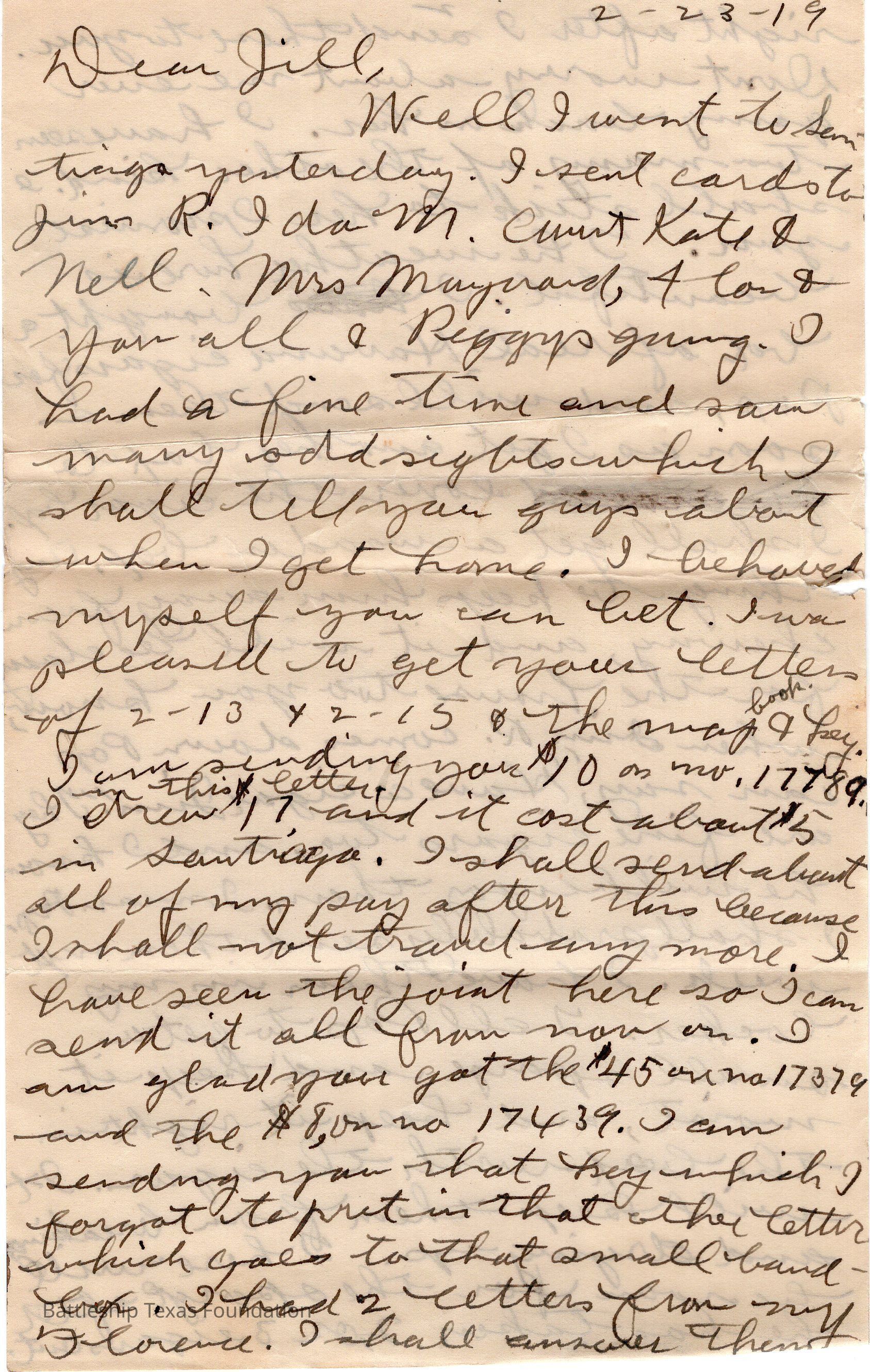 Letter dated February 23, 1919 and addressed to Jill.Context
