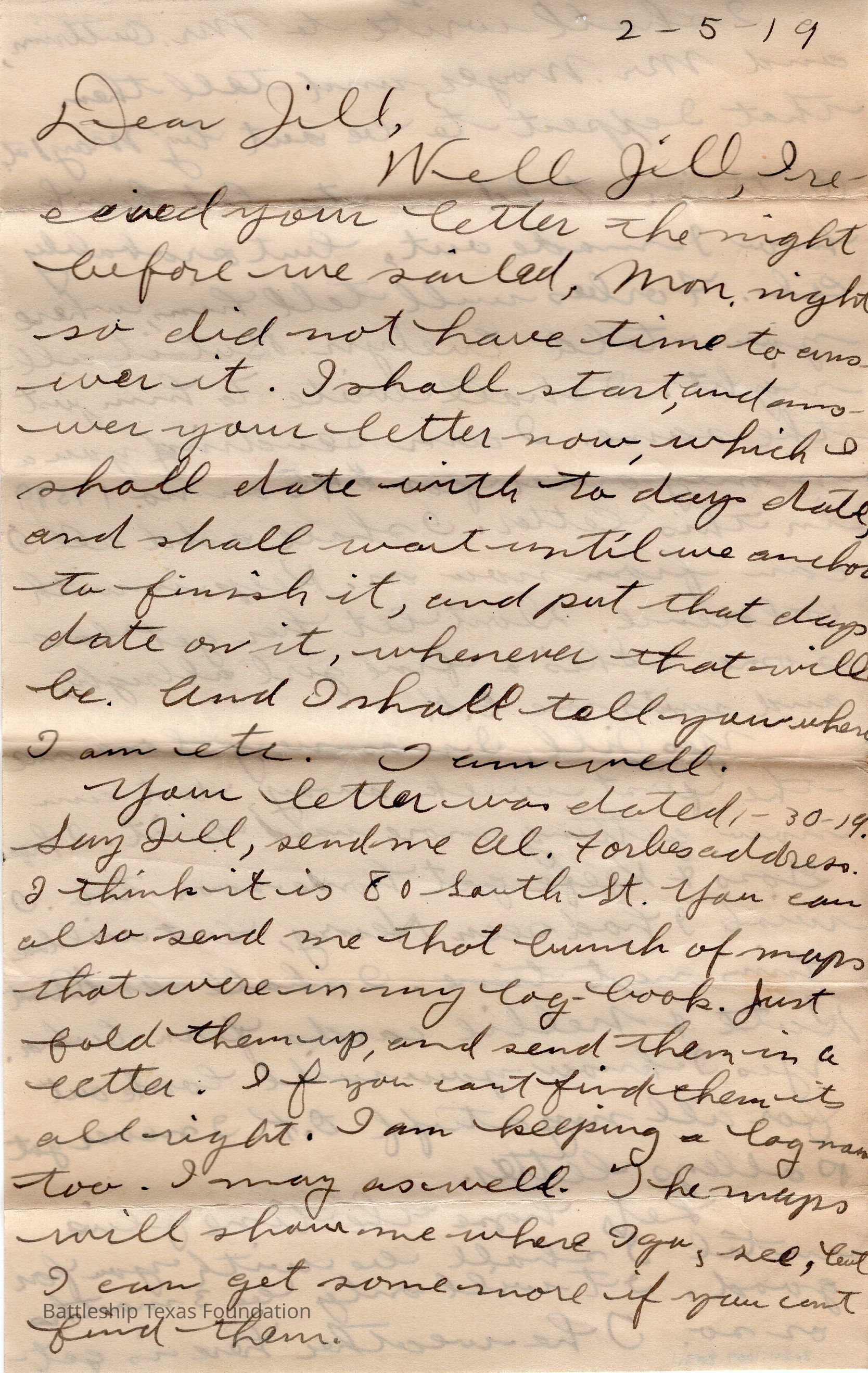 Letter dated February 5, 1919 and addressed to Jill.Context