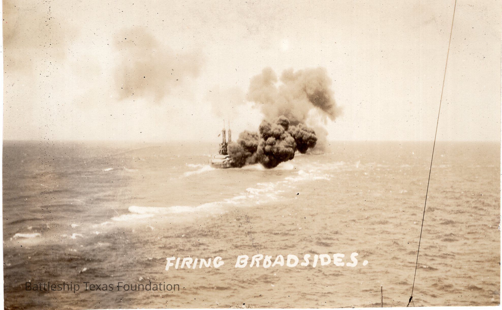 Features a battleship with cage masts firing to starboard.Context