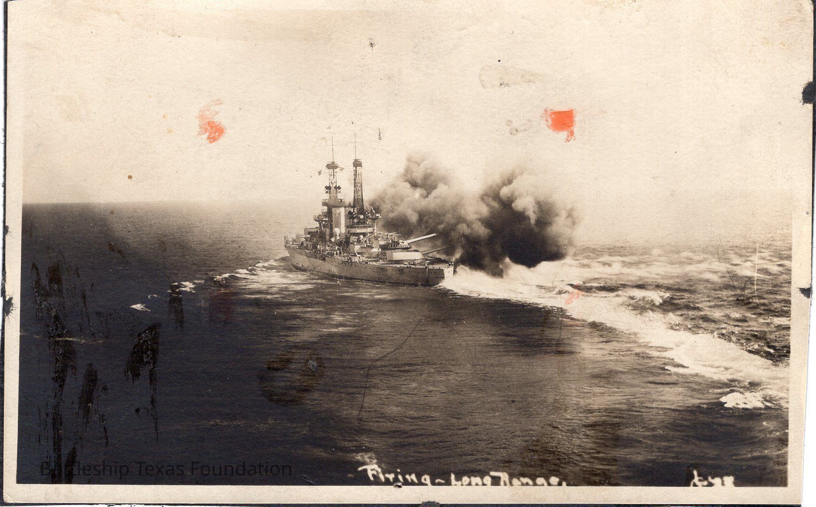 Photo removed from album. Texas firing broadside to starboard. Black backing from album.