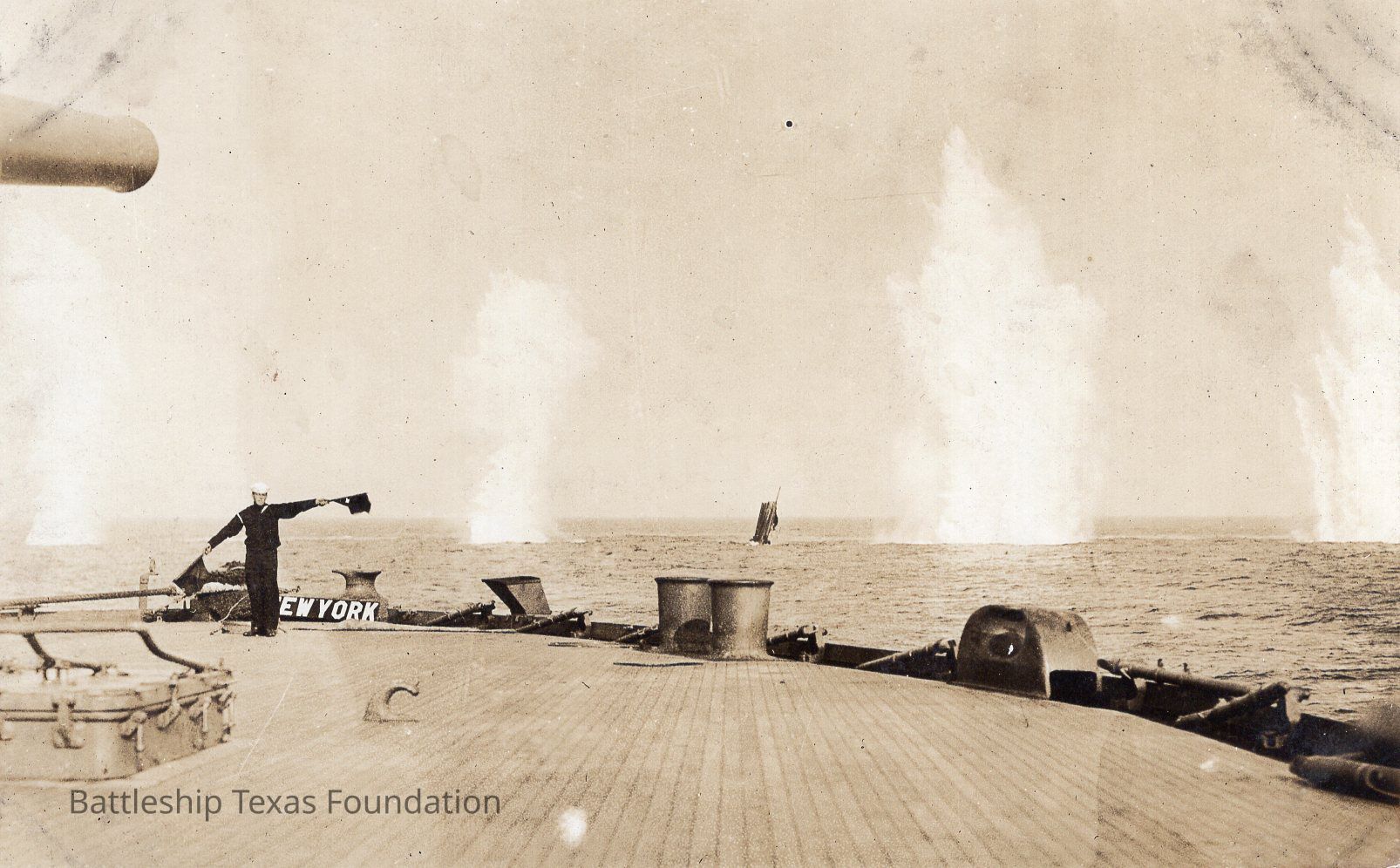 Sailor stands on the stern of the USS New York holding two flags. Water spouts rise in background.Context