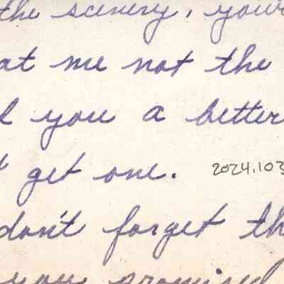 Features a woman standing in front of a tree with a car in the background. Back of the photo has a lot of writing, which has been cut off at the edges.