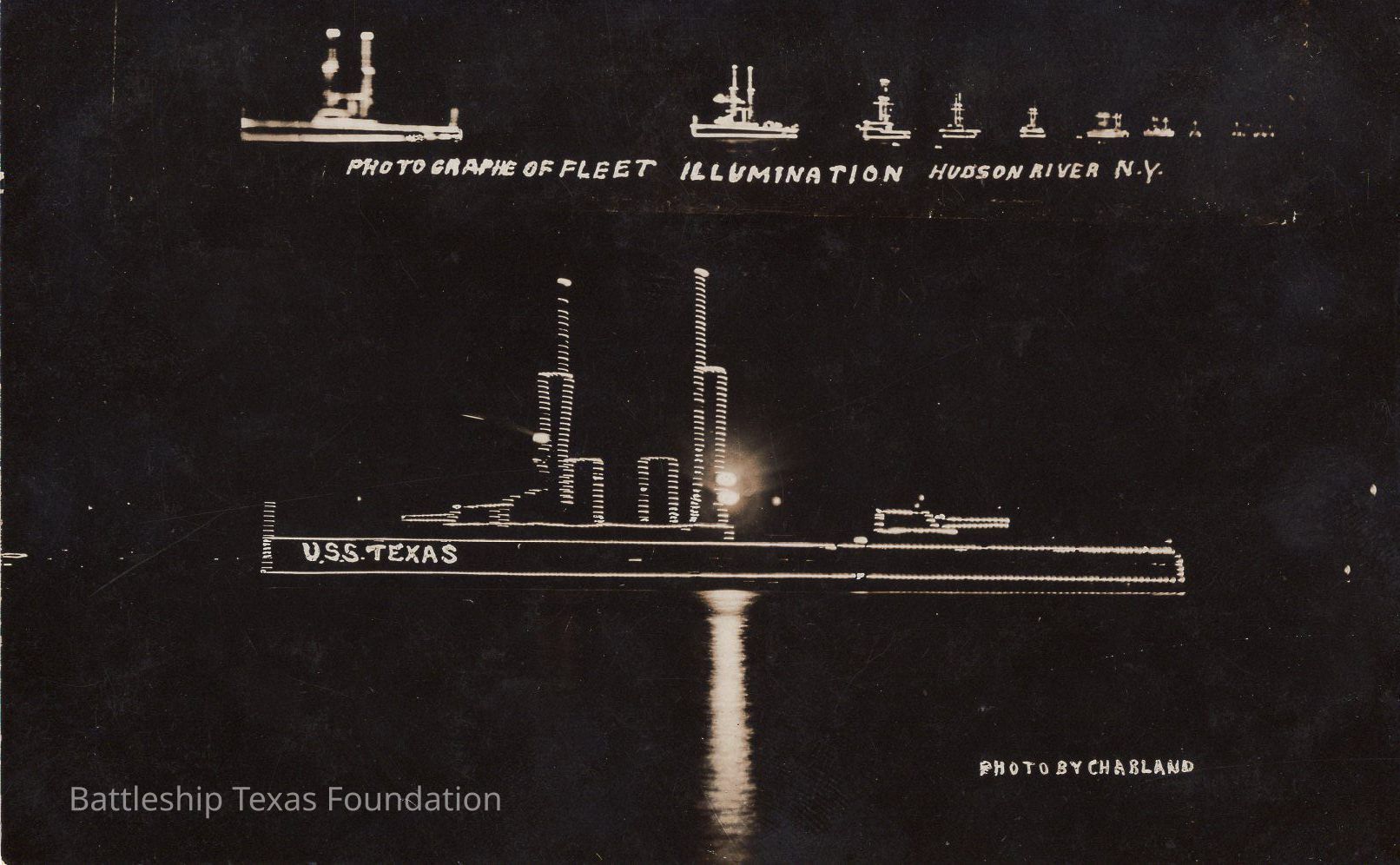 Texas illuminated on the Hudson River along with several other warships. Photo taken by Chabland. Written in white is "Photograph of fleet illumination Hudson River N.Y."Context