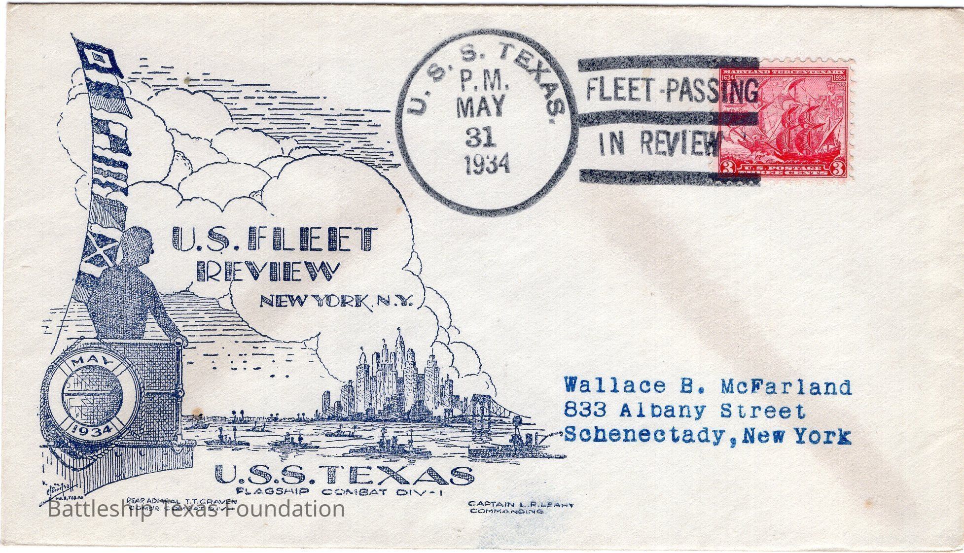 Envelope sent to Wallace B. McFarland from USS Texas on May 31, 1934, while the ship was in New York City for Fleet Review. Envelope features man looking over a ship-strewn harbor at city scape.Context