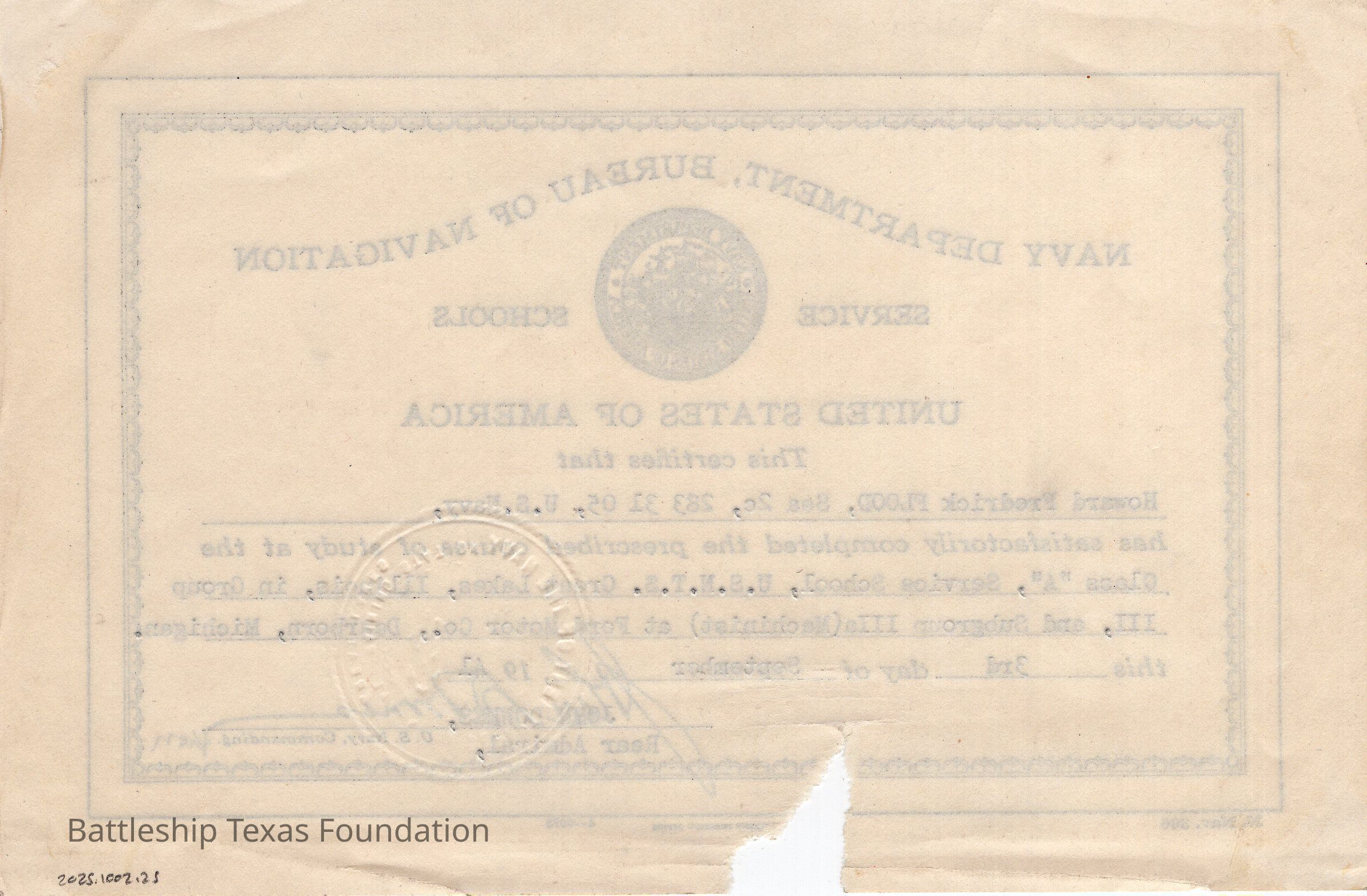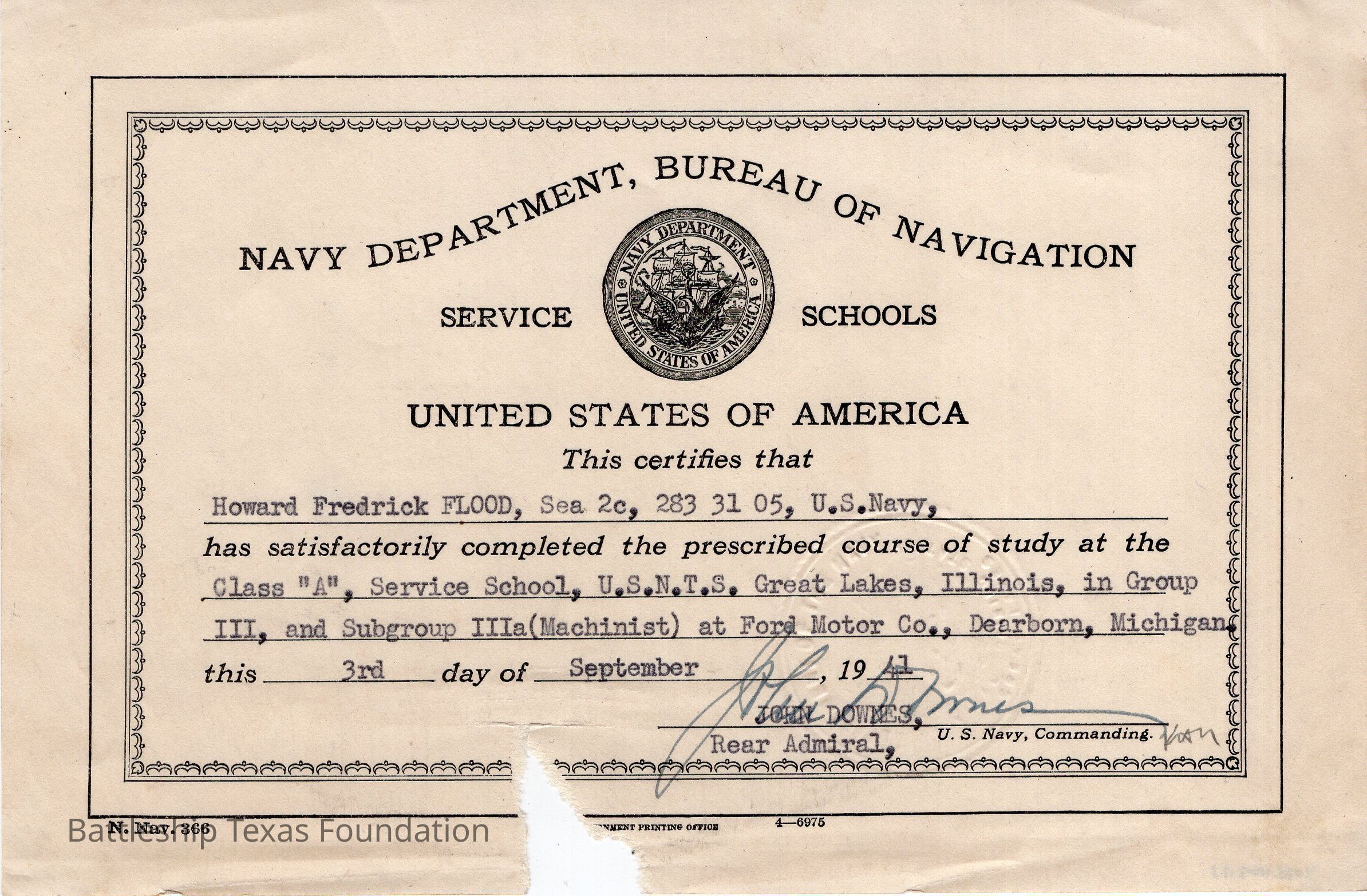Navy Department, Bureau of Navigation certificate awarded to Howard F. Flood Jr. on September 3, 1941 for completion of classes taken at Ford Motor Company in Dearborn Michigan. Triangular portion of the center bottom missing.Context