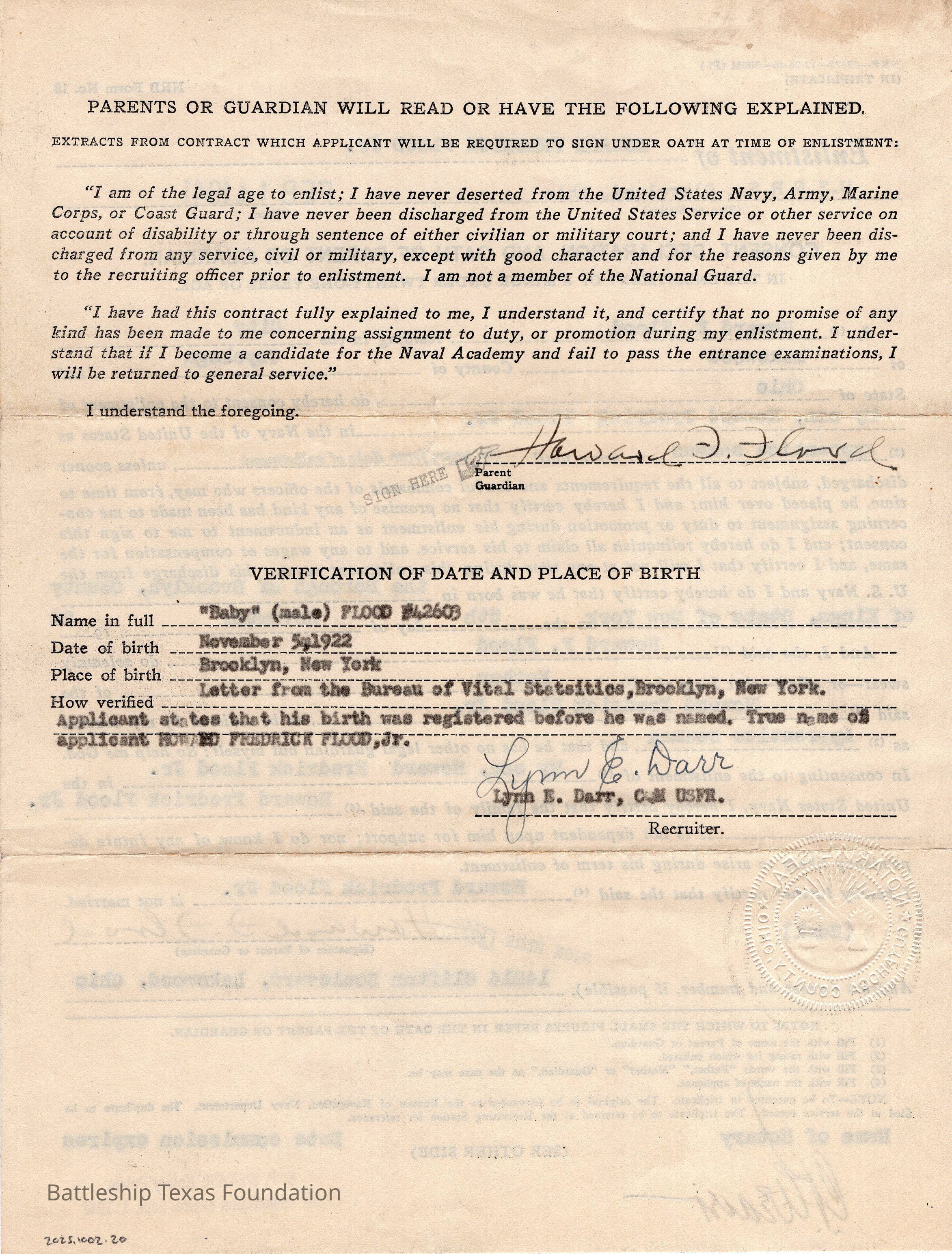Howard Flood Jr's parents' consent form allowing their son to enlist in the US Navy Reserves.Context