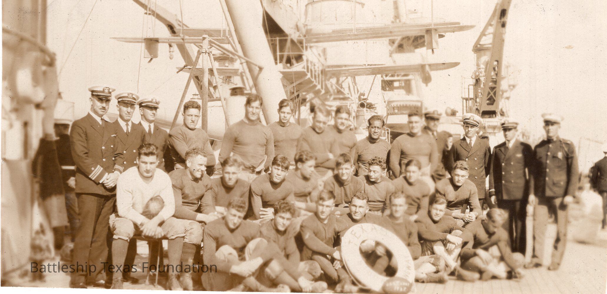 Features football team in three rows with three officers on either side. Life preserver front and center.Context