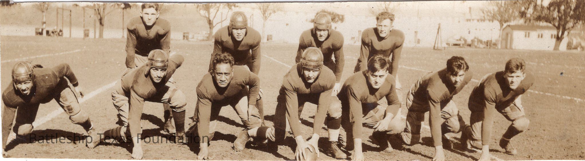 Features a football team set for hike. Seven men in front row, four in back.Context