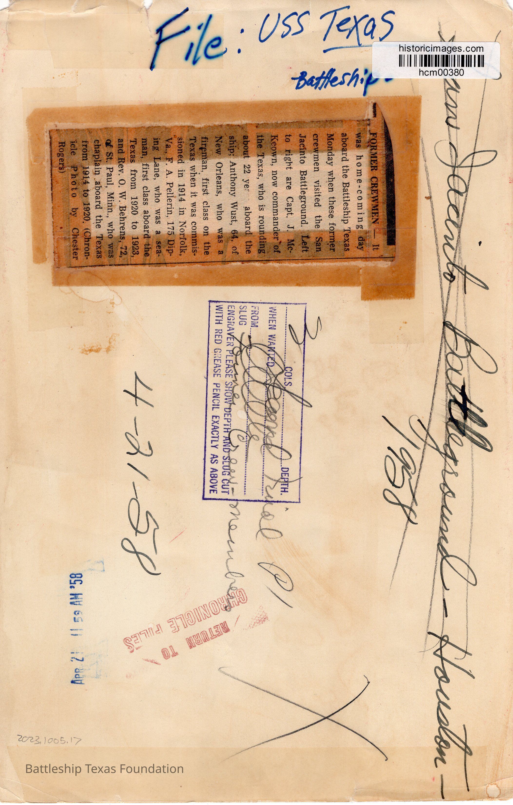 Four crewmembers on the bow of Texas. Left to right: J. McKeown(pointing), Anthony Wust, F. A. Pellerin, O. W. Behrens. Propeller in background behind men. back has written in large letters "San Jacinto Battleground - Houston - 1958"Context