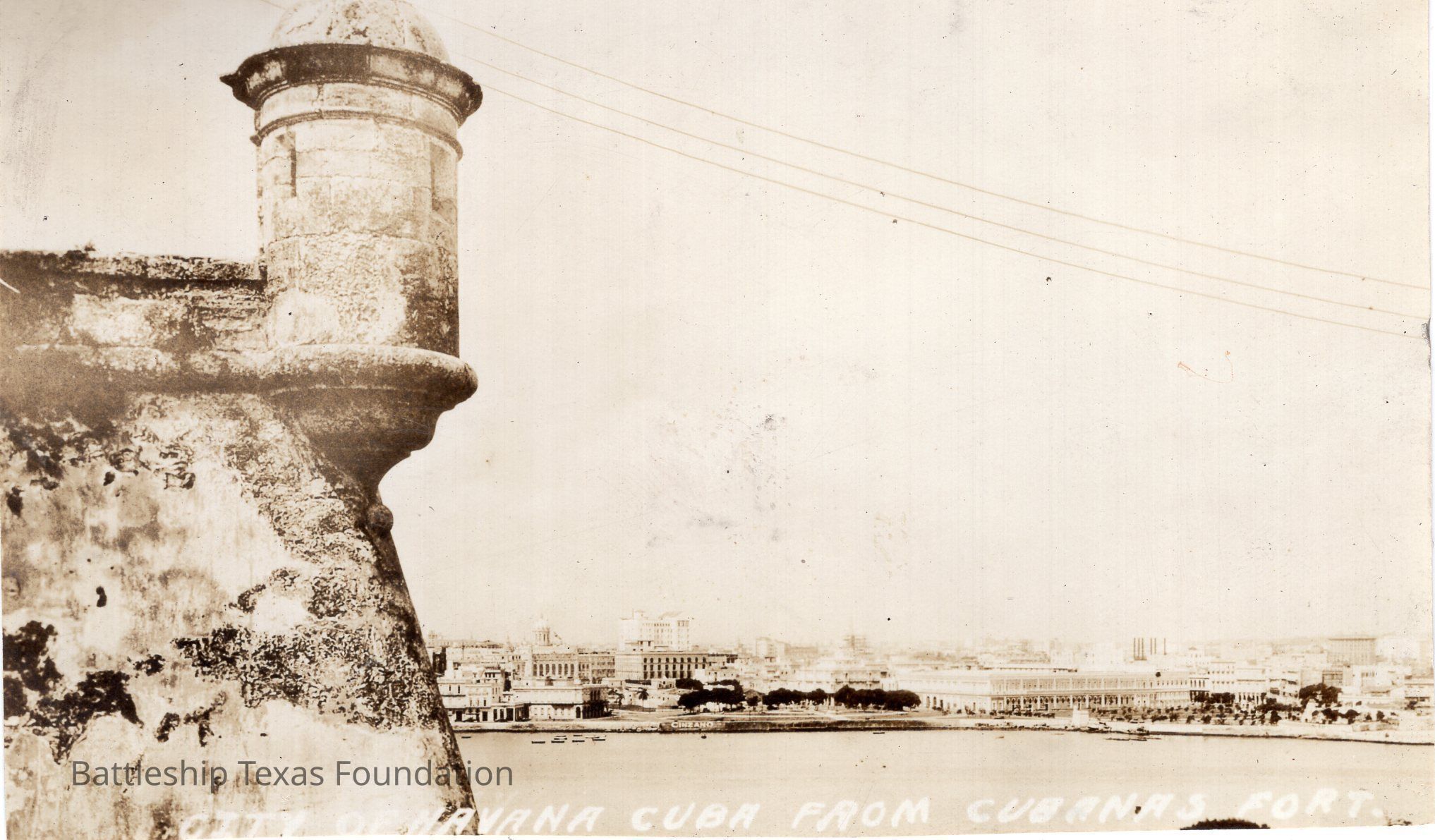 Features a corner of a Spanish fort on the left side of the photograph and a city in the background. Photo captioned, "City of Havana Cuba from Cubanas Fort."Context