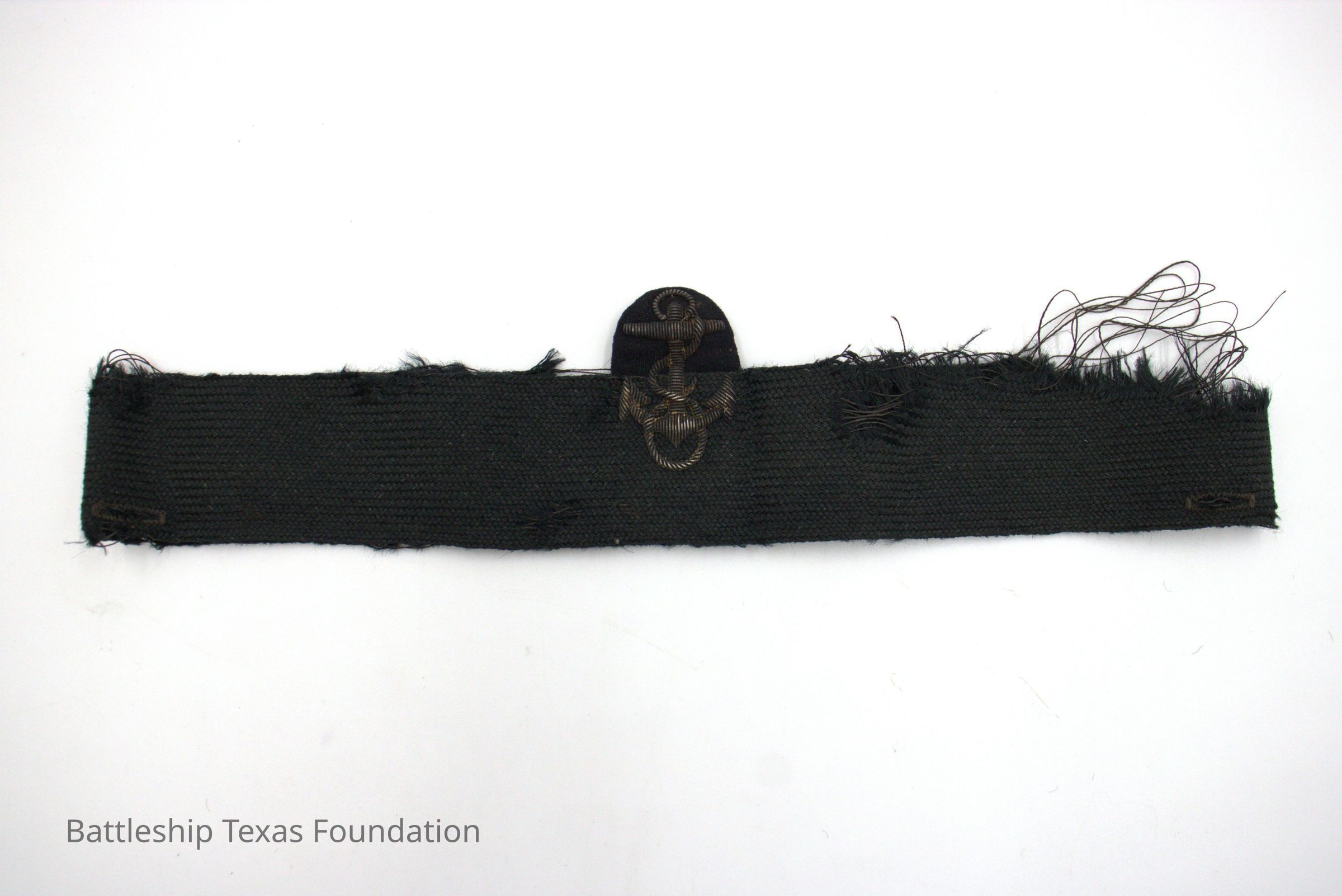 Black hatband with significant fraying. Features a raised fouled anchor that is tarnished.Context