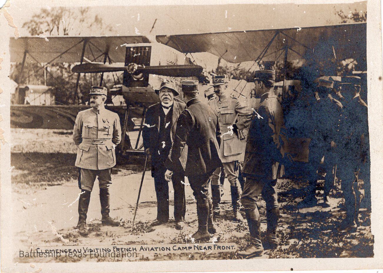 Captioned "Clemenceau Visiting French aviation camp near front" with a plane in background. Right of photo saturated and people are made into silhouettes.Context