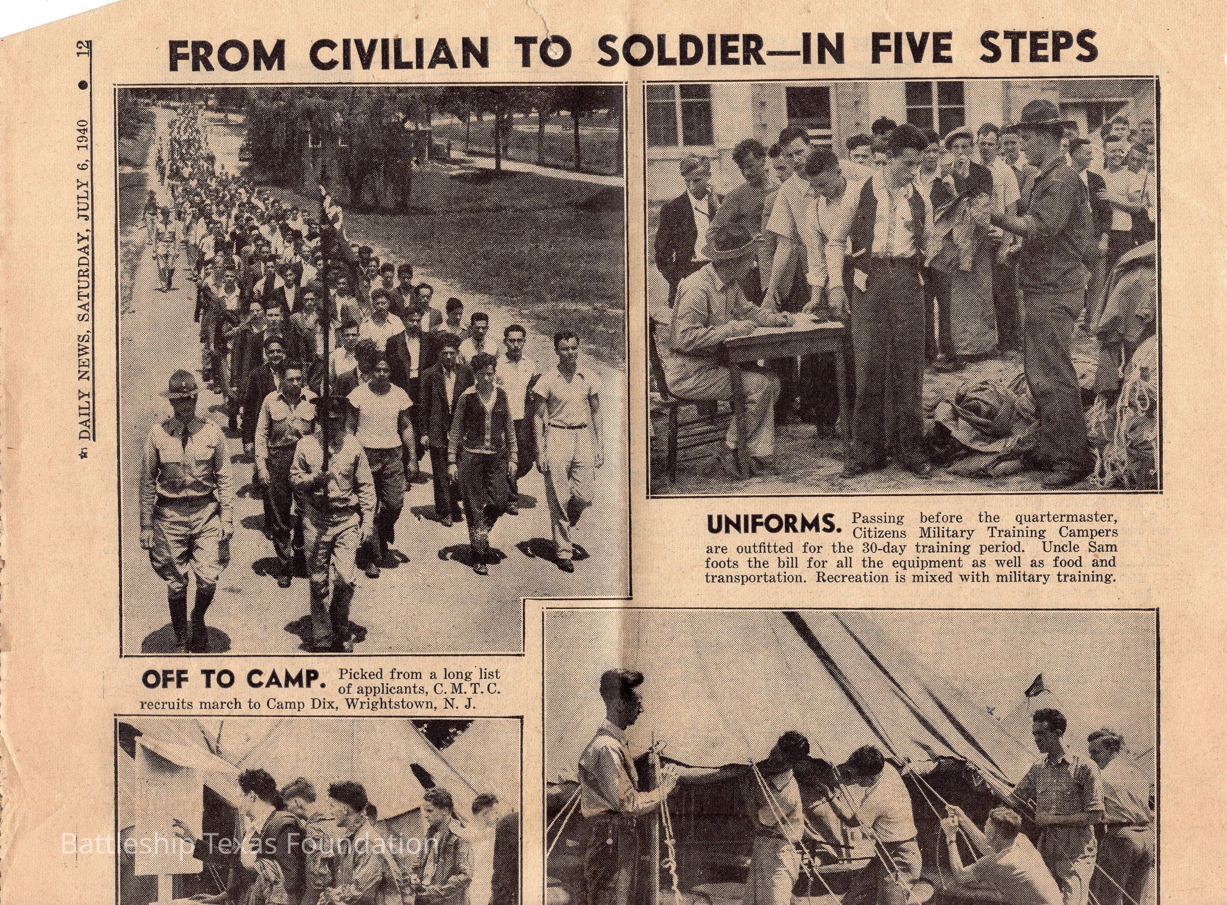 Newspaper page published by the Daily News on Saturday, July 6, 1940 titled "FROM CIVILIAN TO SOLDIER--IN FIVE STEPS" and depicts five images of men signing up for service and undergoing basic training.Context