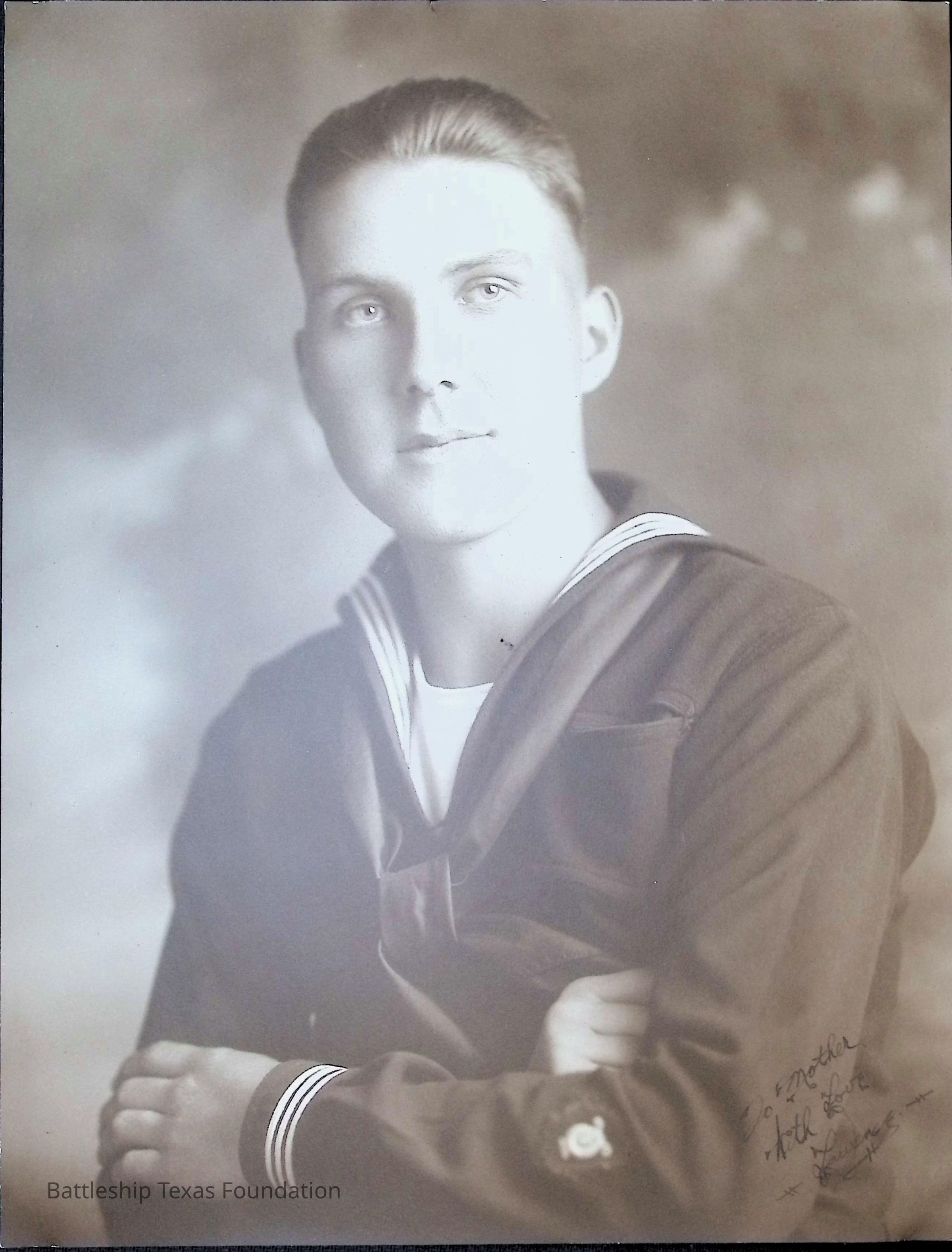 Portrait of Lawrence J. gaddis in his dress blues. Bottom right corner has a note