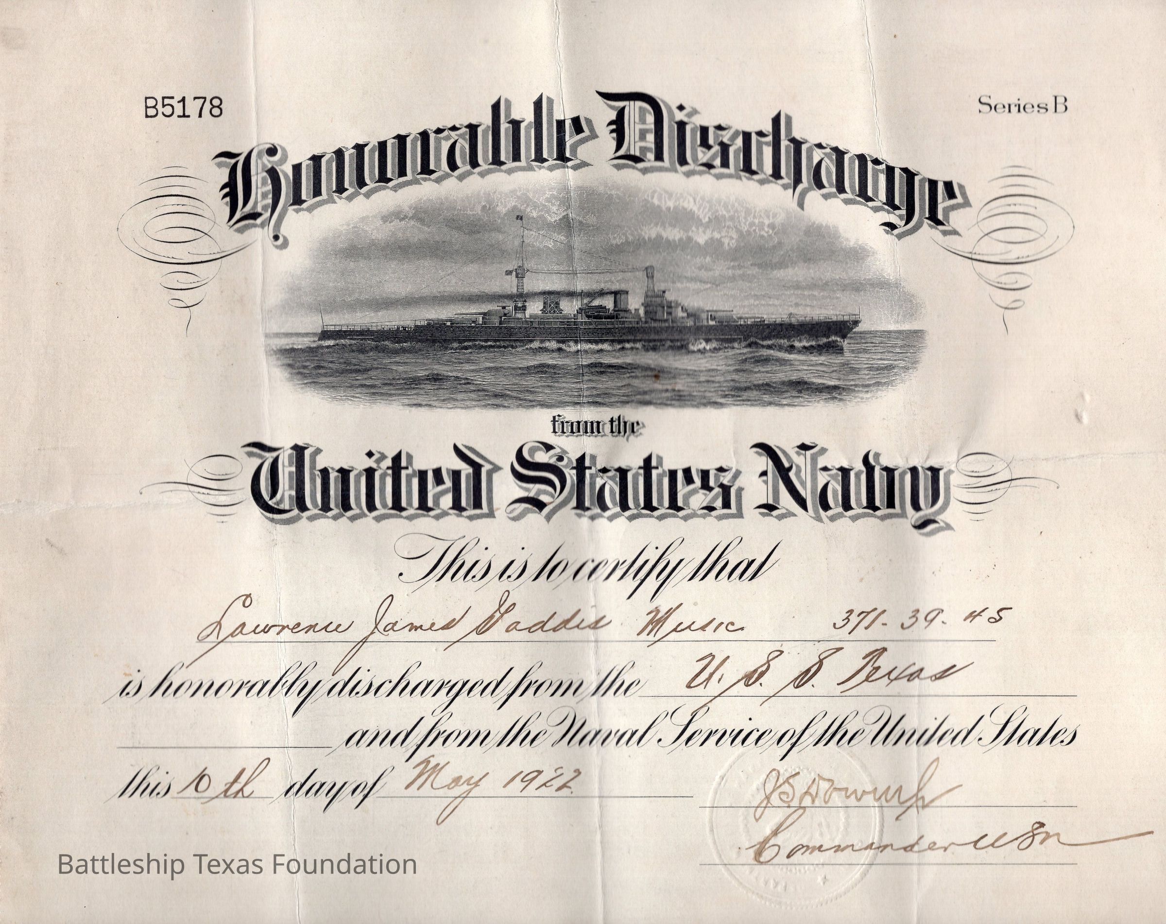 Lawrence James Gaddis's Honorable Discharge certificate awarded on USS Texas on May 10, 1922.Context