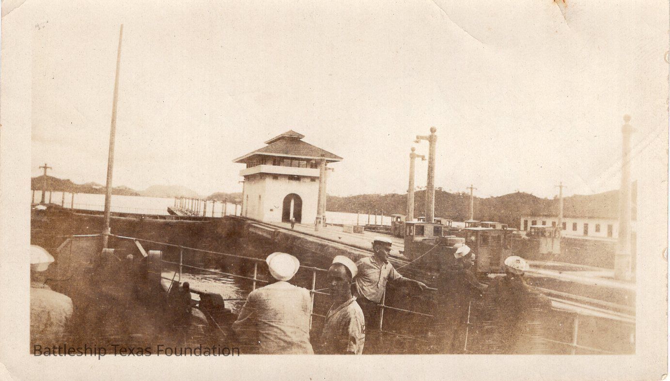 Shows men on edge of deck with Panama Canal gate in background