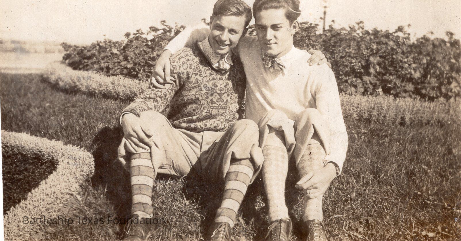 Features two men, labeled on the back as Jimmy and Ely, sitting on the grass with their arms over each other's shoulders.Context