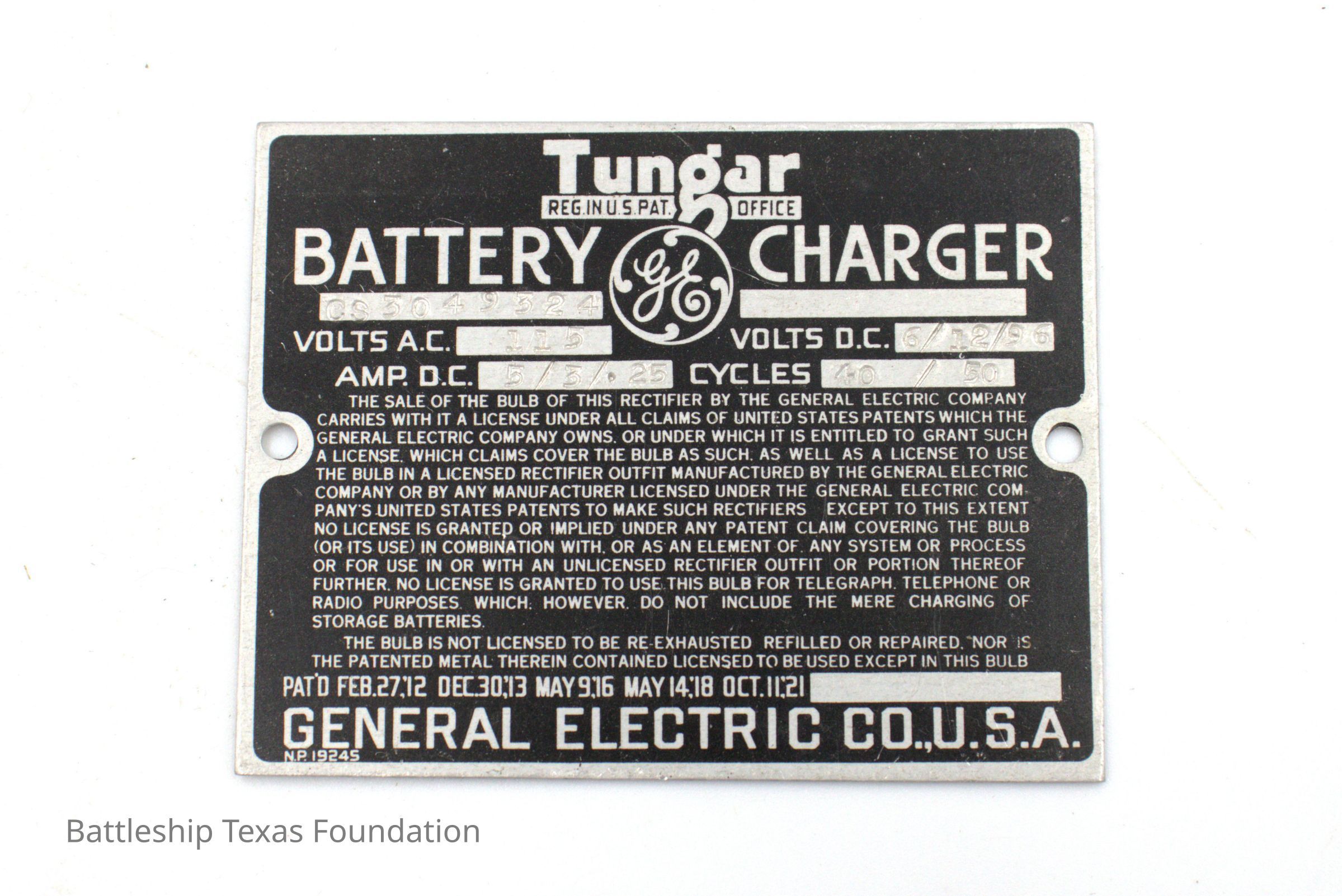 GE battery charger plaqueEntry/Object ID