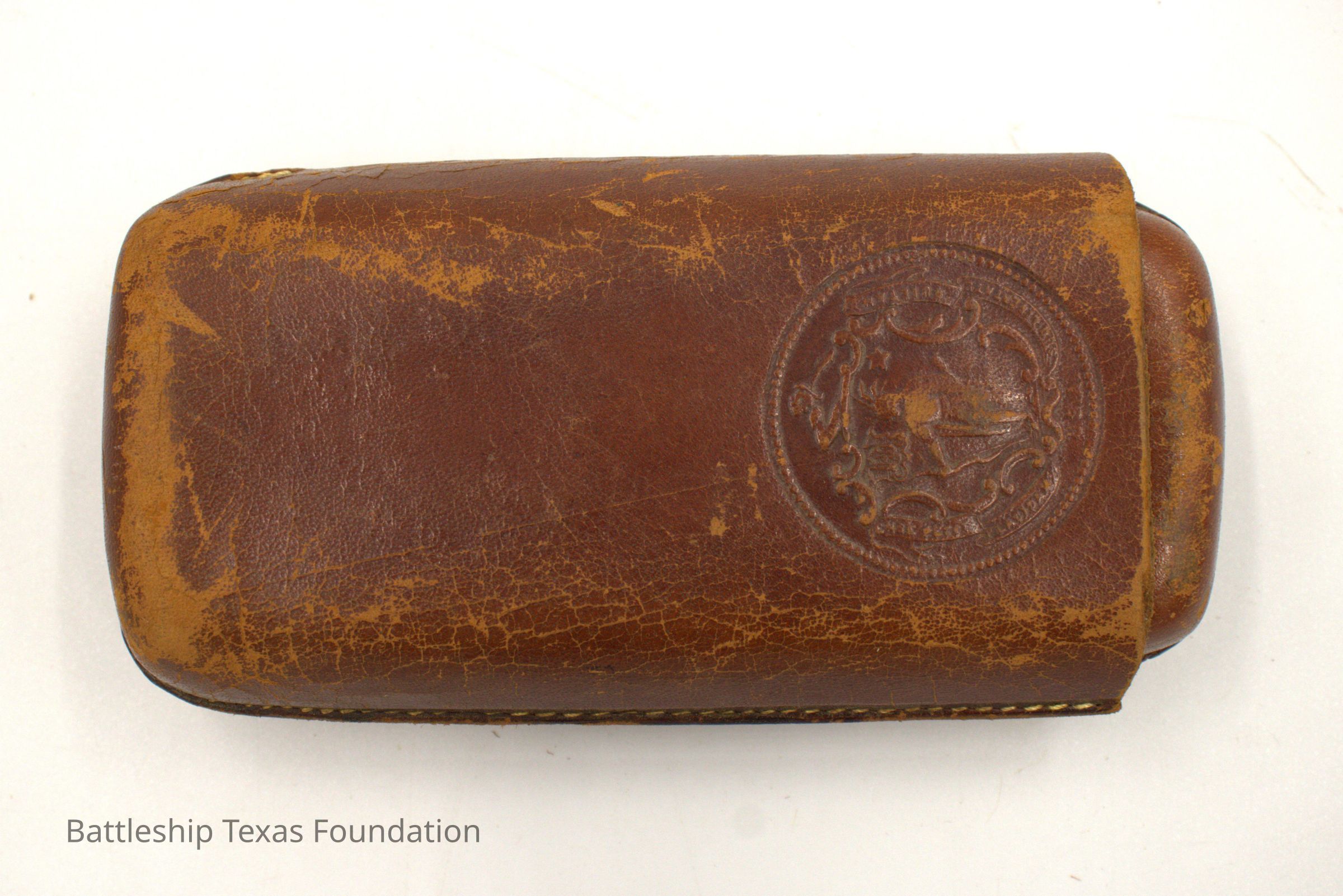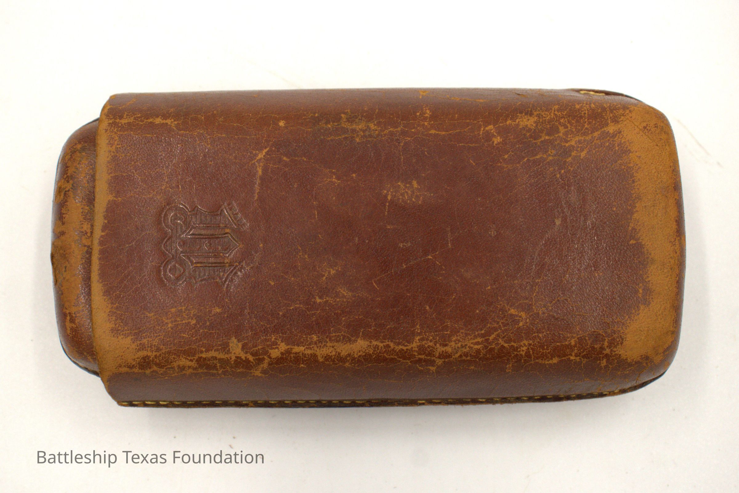 Leather glasses case stamped on front and back. Two pieces, the smaller meant to fit within the larger.Context
