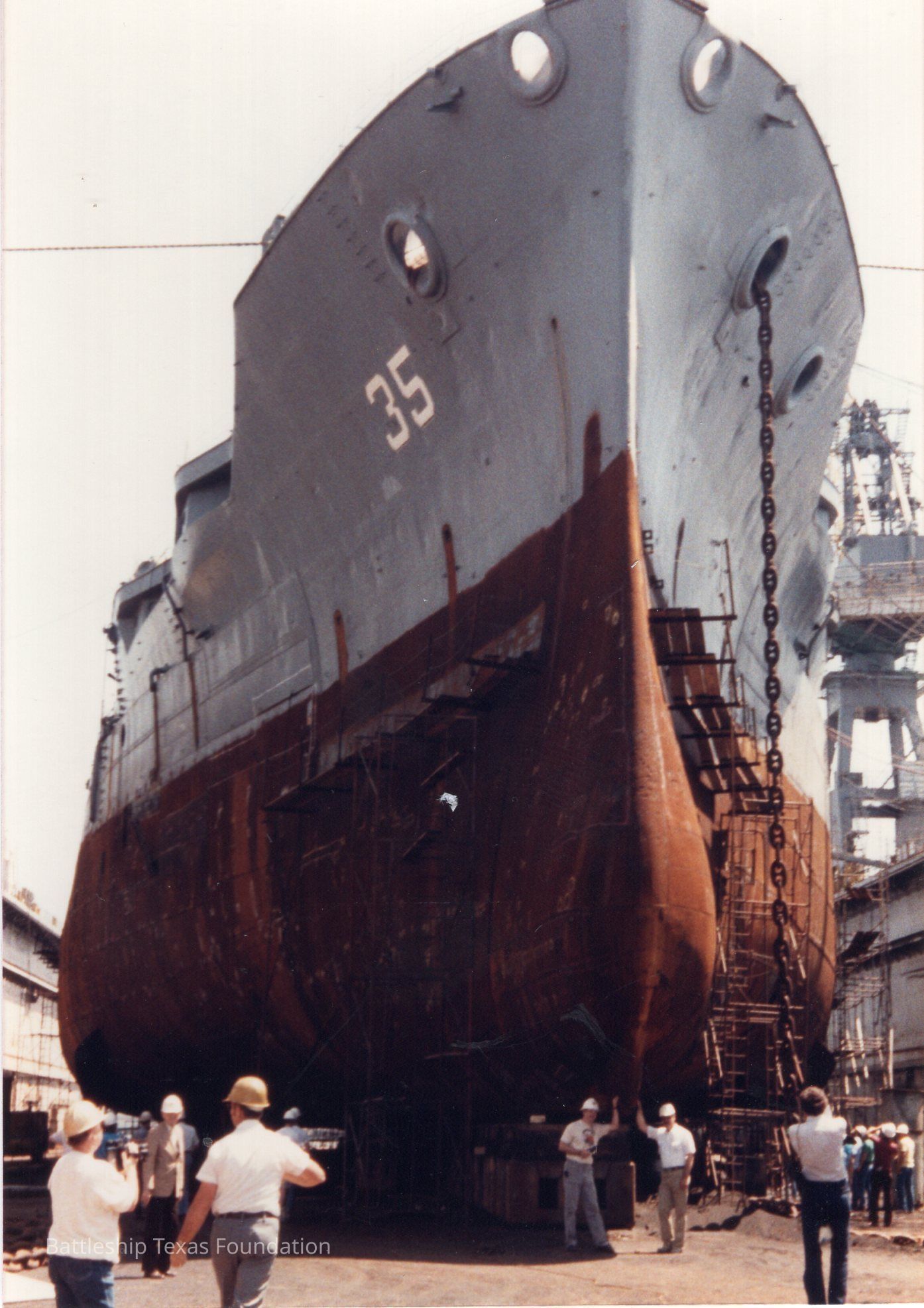 Texas in dry dock with several people on floor walking around and posing near the deadeye. Below the waterline is visibly rusted.Context
