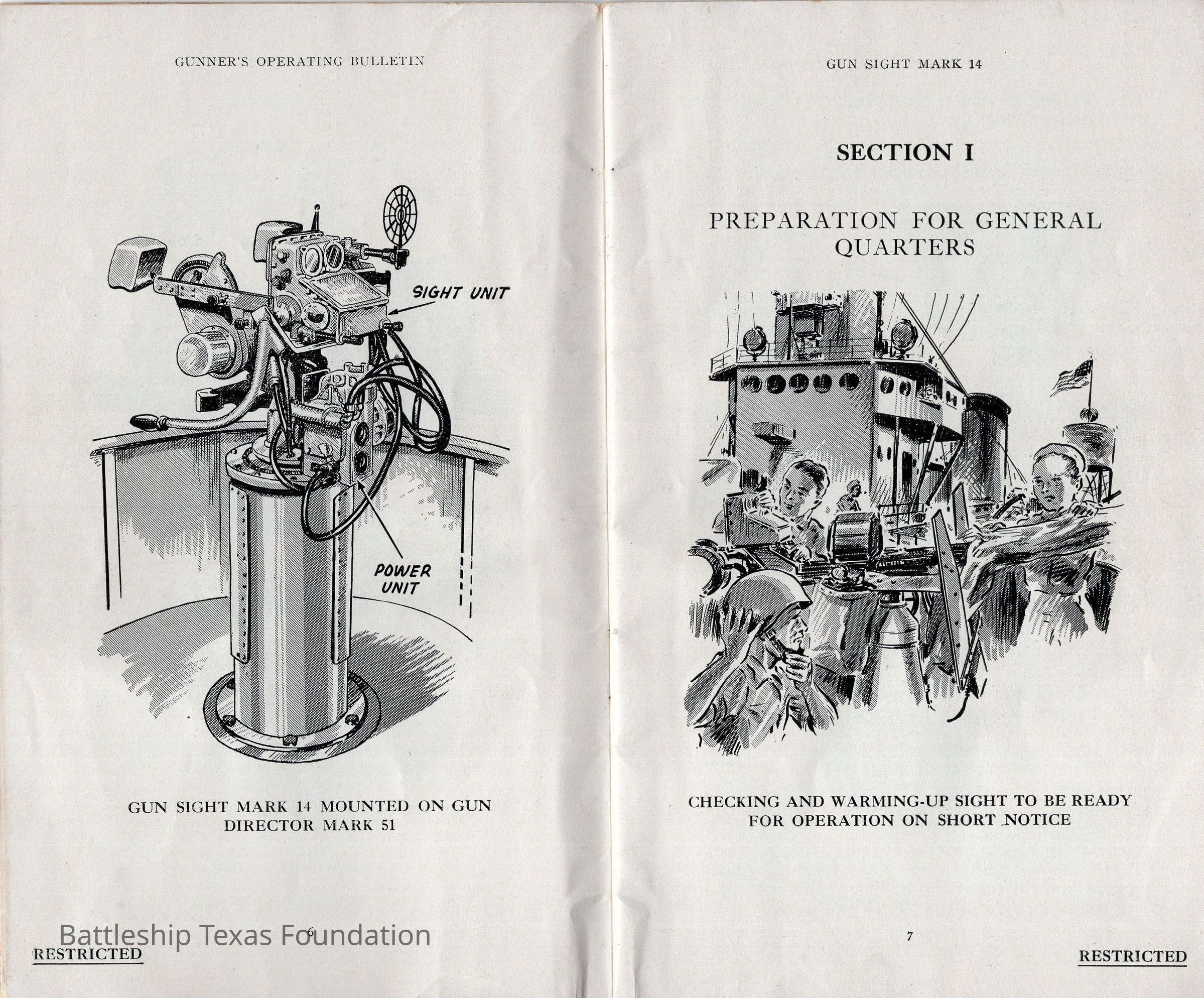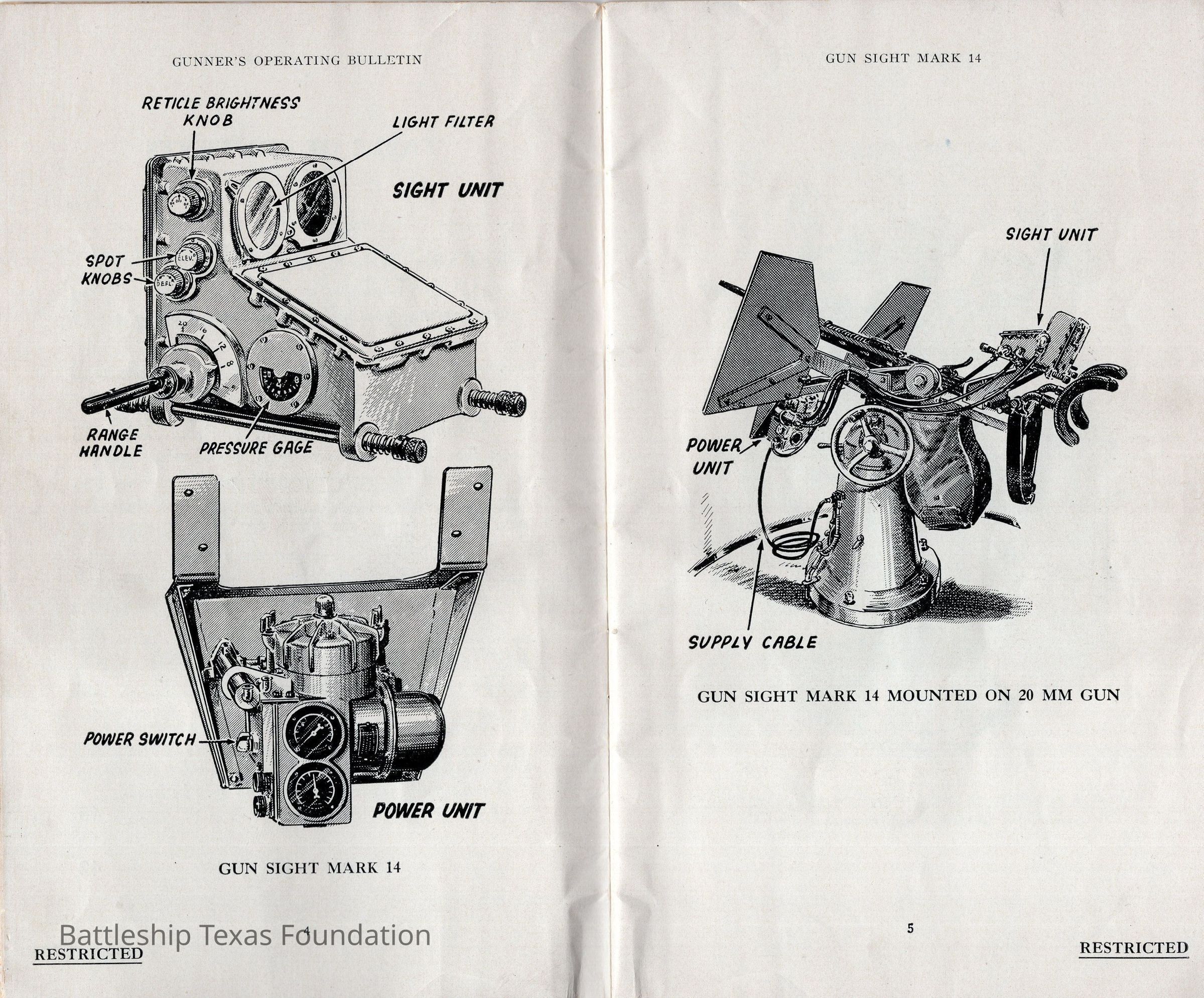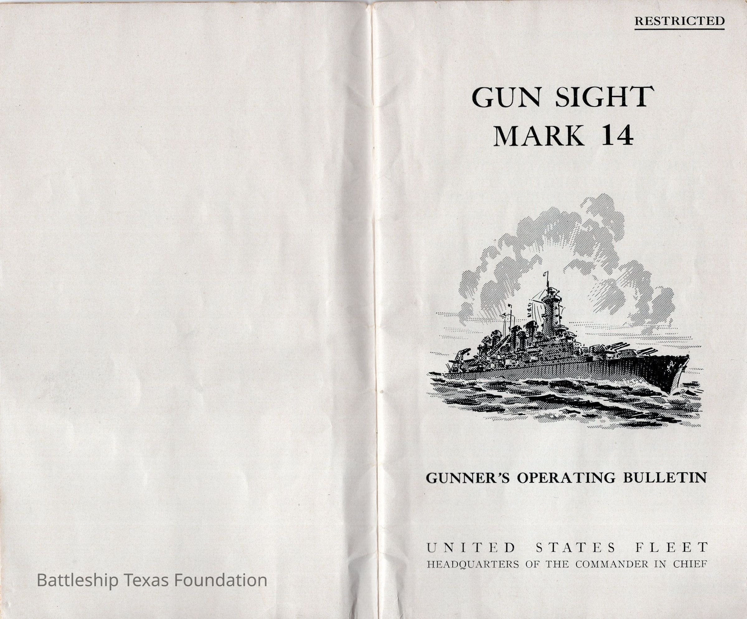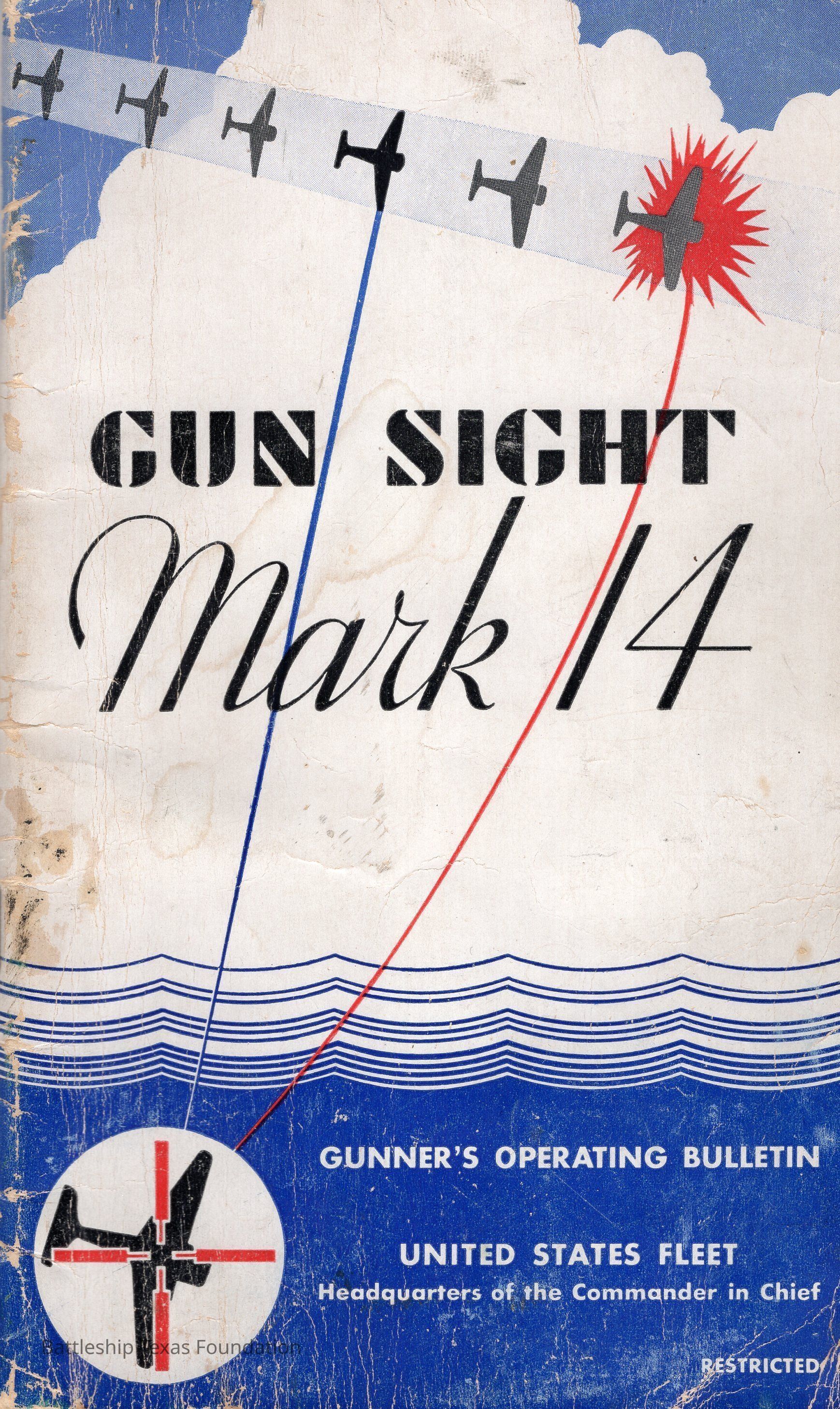 Booklet titled "Gun Sight Mark 14: Gunner's Operating Bulletin" made by the United States Fleet, headquarters of the Commander in Chief in 1943.Context