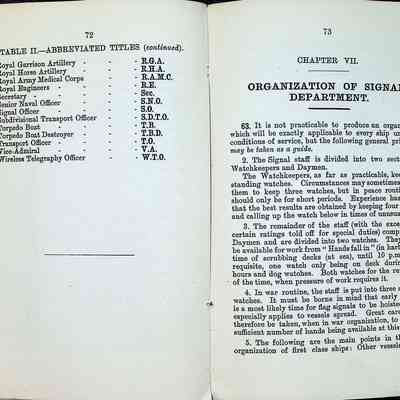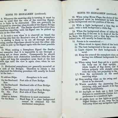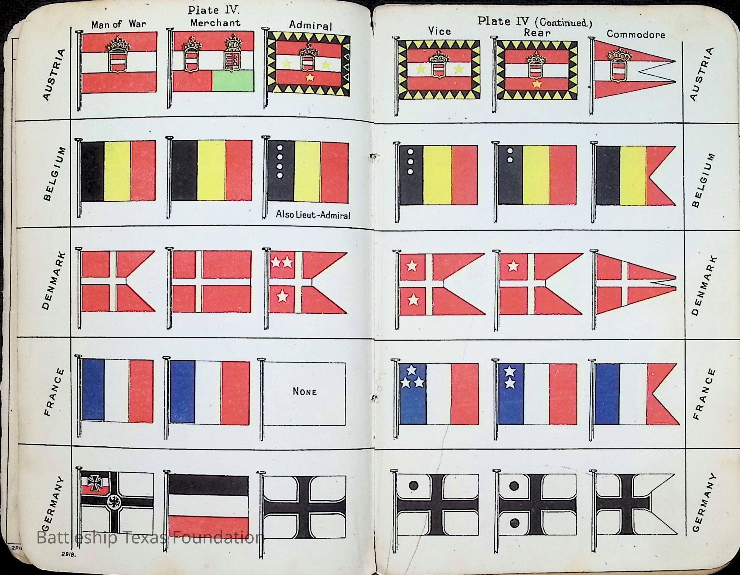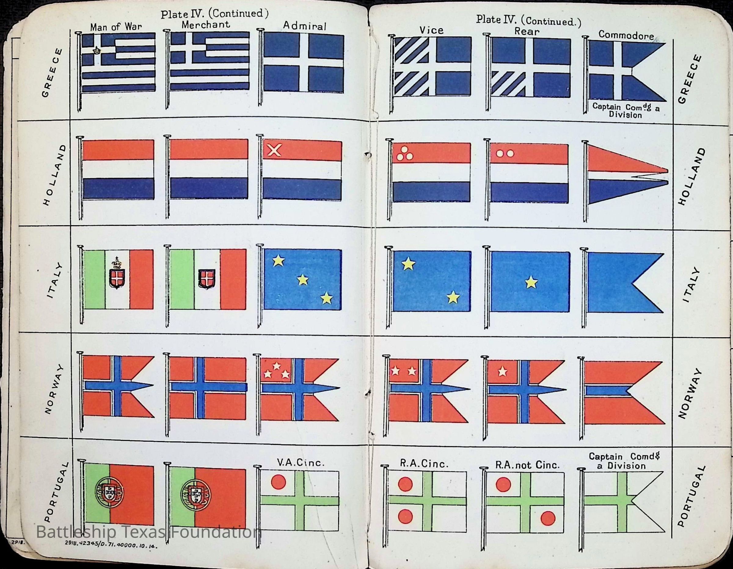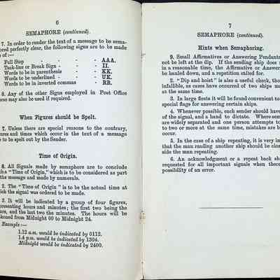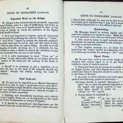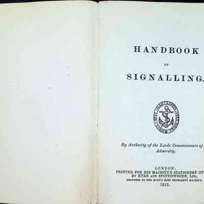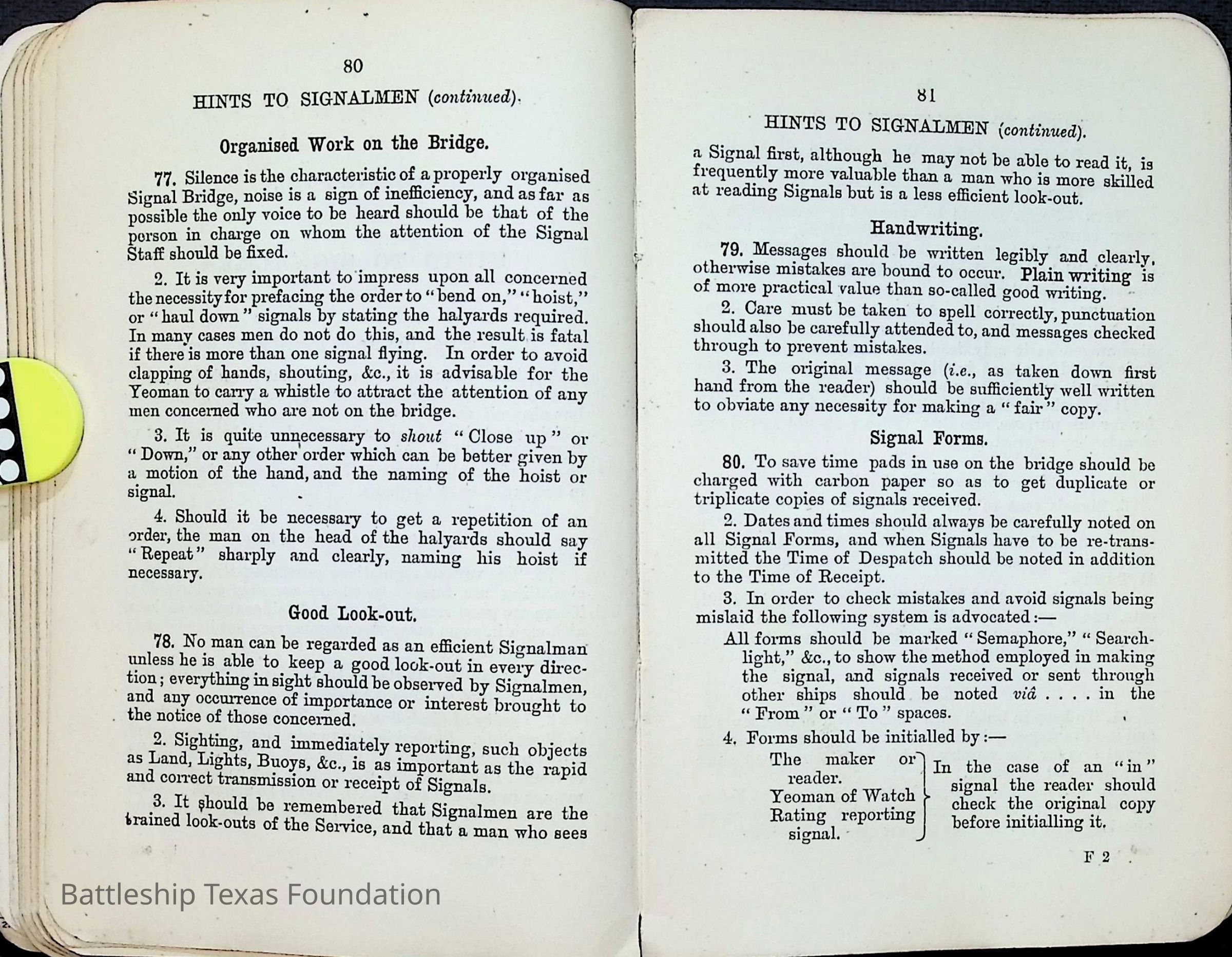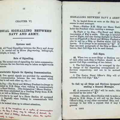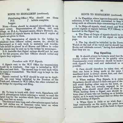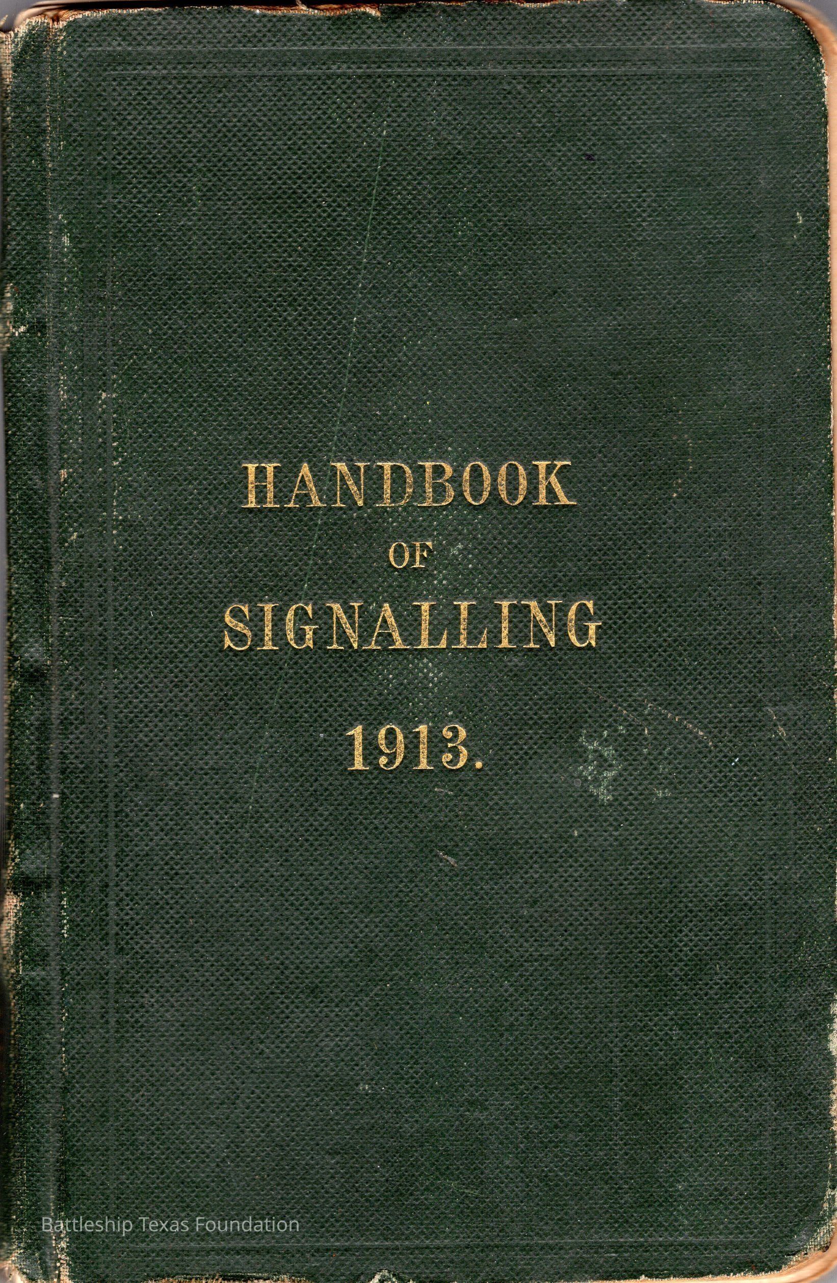 British Navy Handbook of Signalling 1913 owned by two Yeomen on USS Texas, humorously referred to as "HMS Texas" in the inside cover. Handbook was used during action with British Grand Fleet during World War One. Handbook received by crew members shortly after arriving in European waters in February 11. Dated February 24, 1918.Context