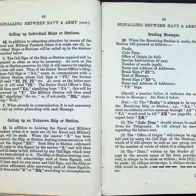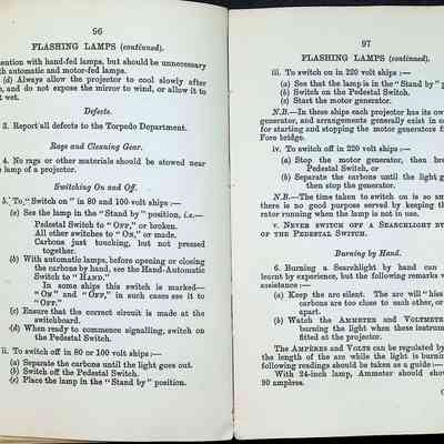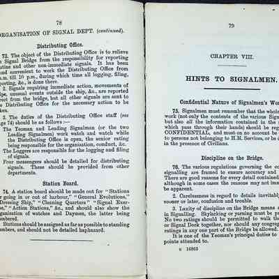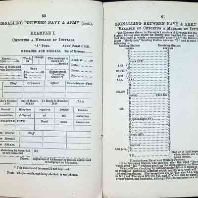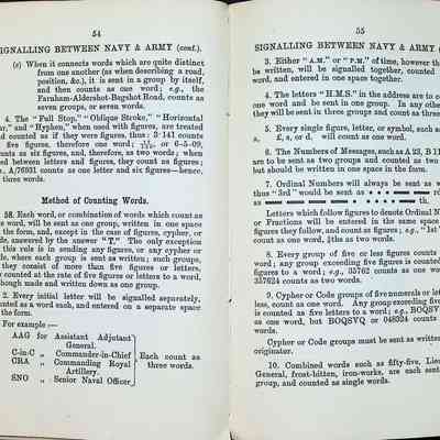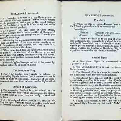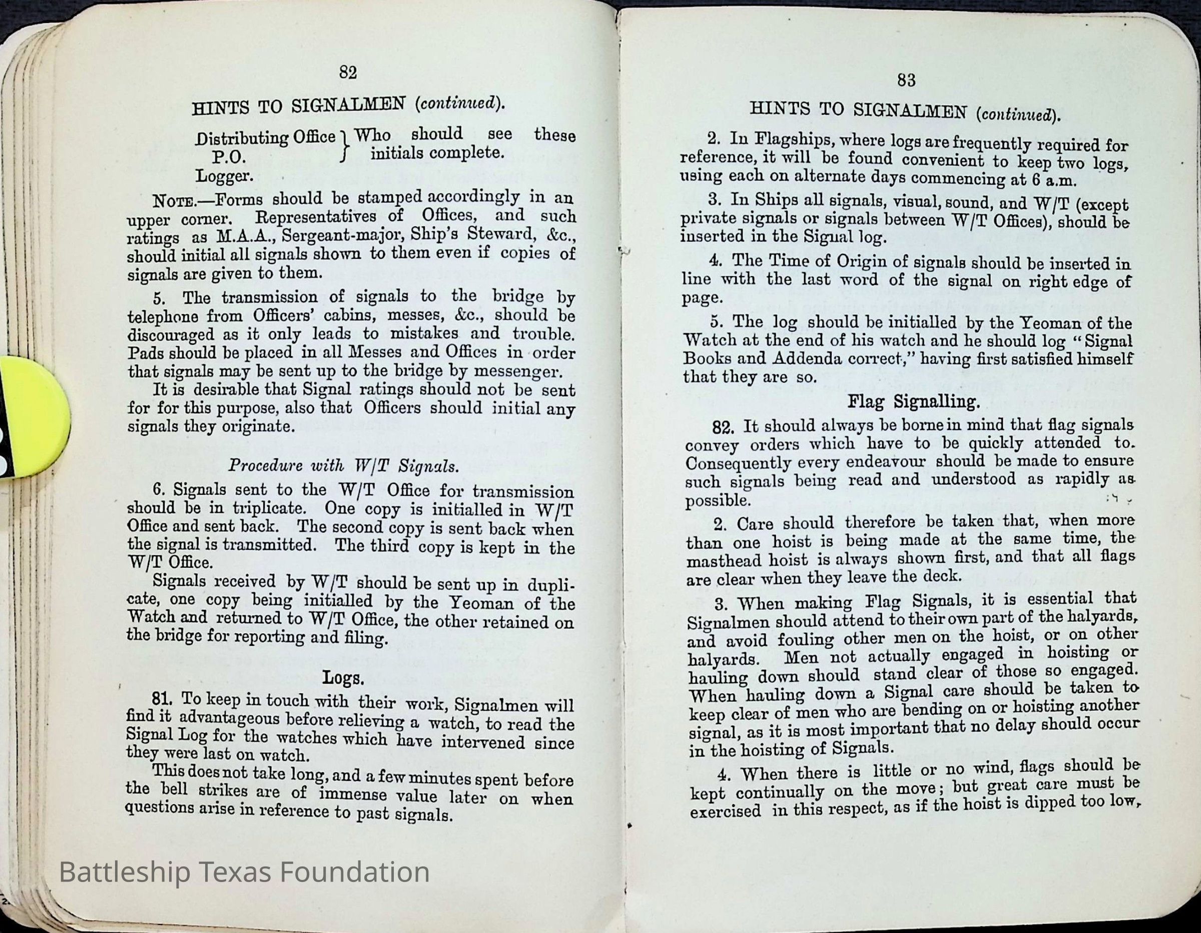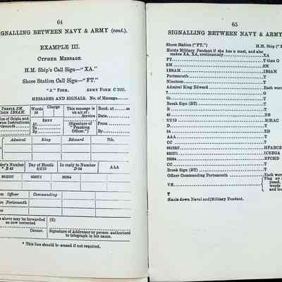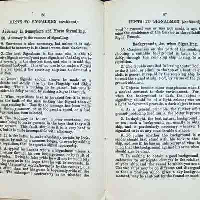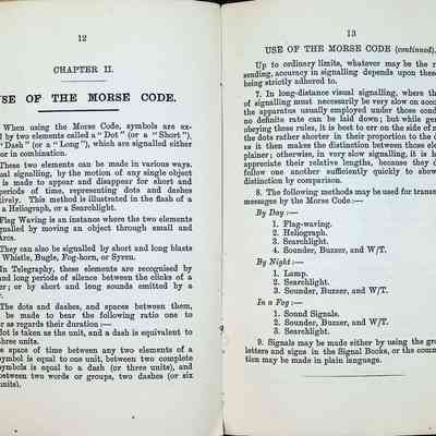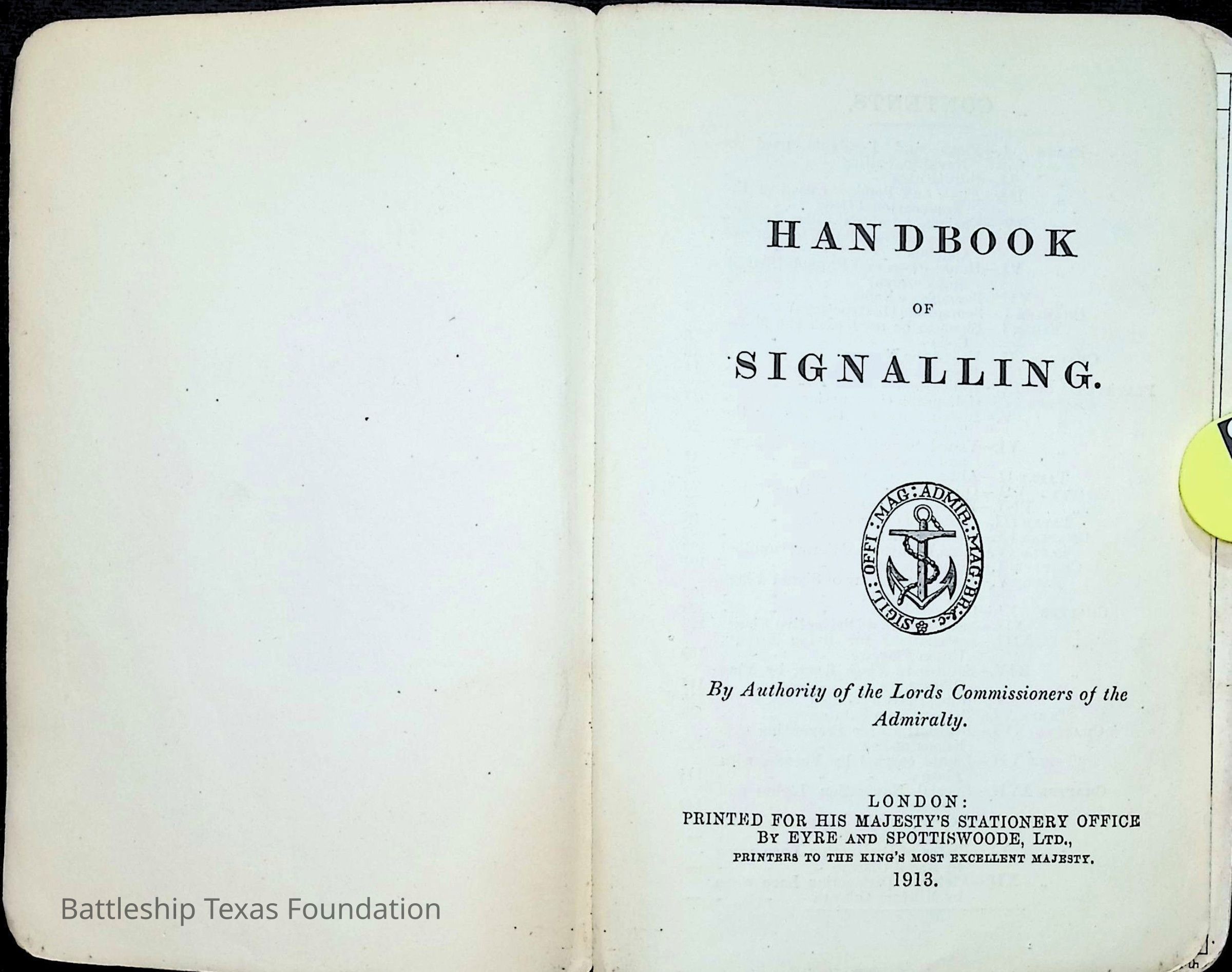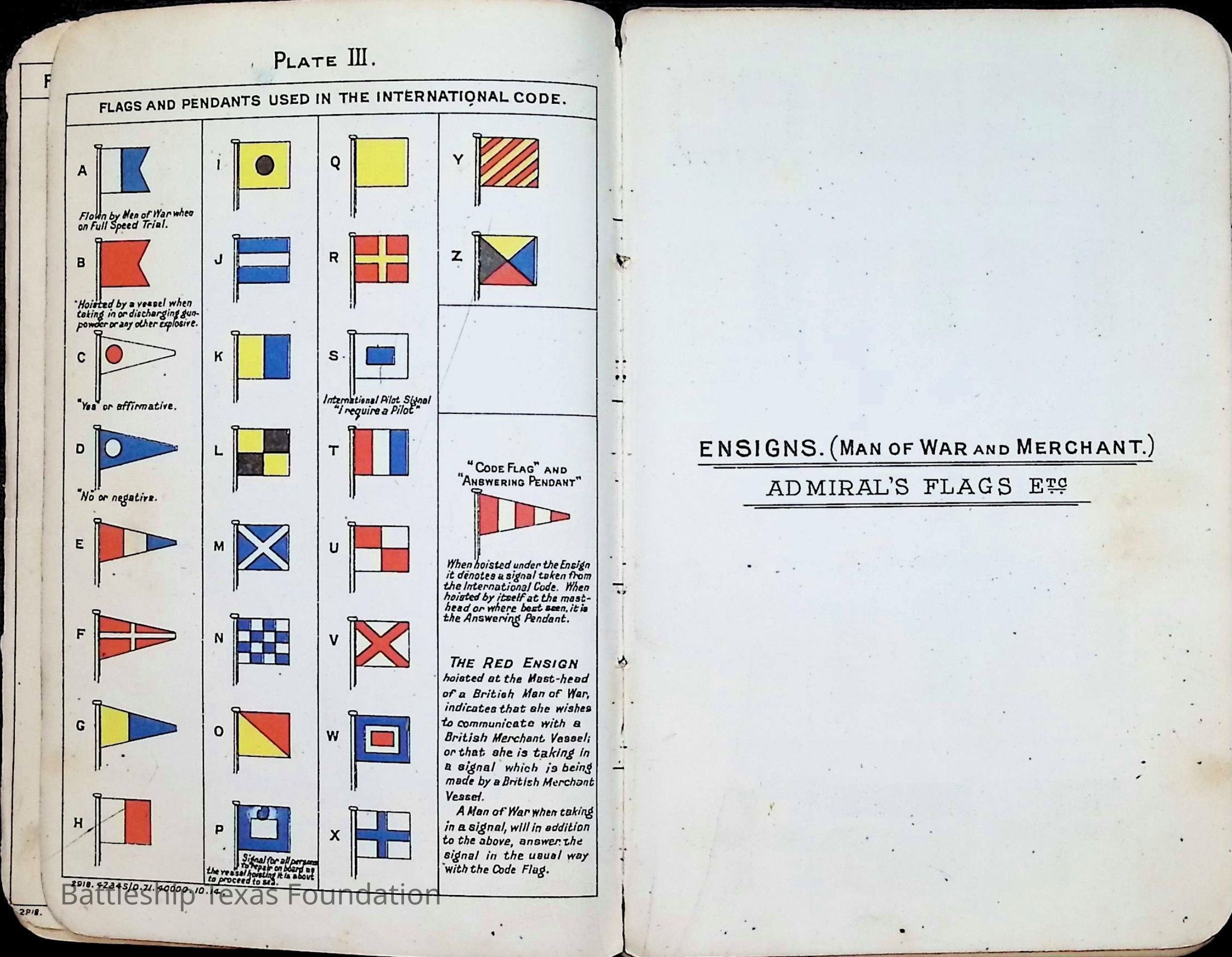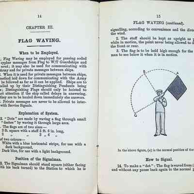 British Navy Handbook of Signalling 1913 owned by two Yeomen on USS Texas, humorously referred to as "HMS Texas" in the inside cover. Handbook was used during action with British Grand Fleet during World War One. Handbook received by crew members shortly after arriving in European waters in February 11. Dated February 24, 1918.Context