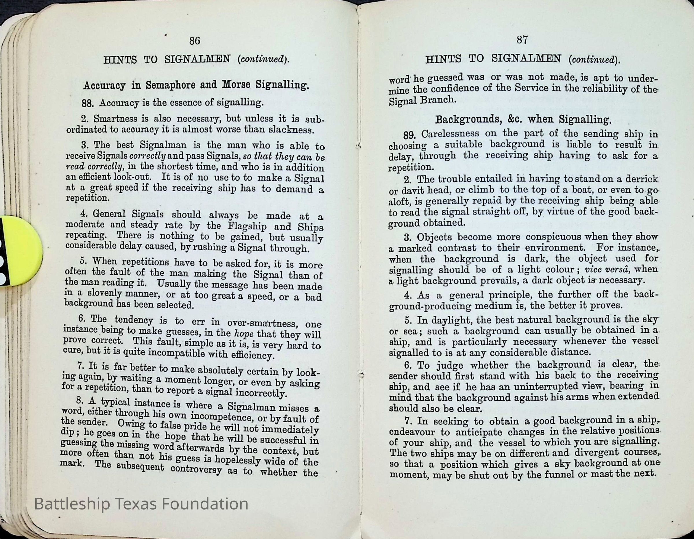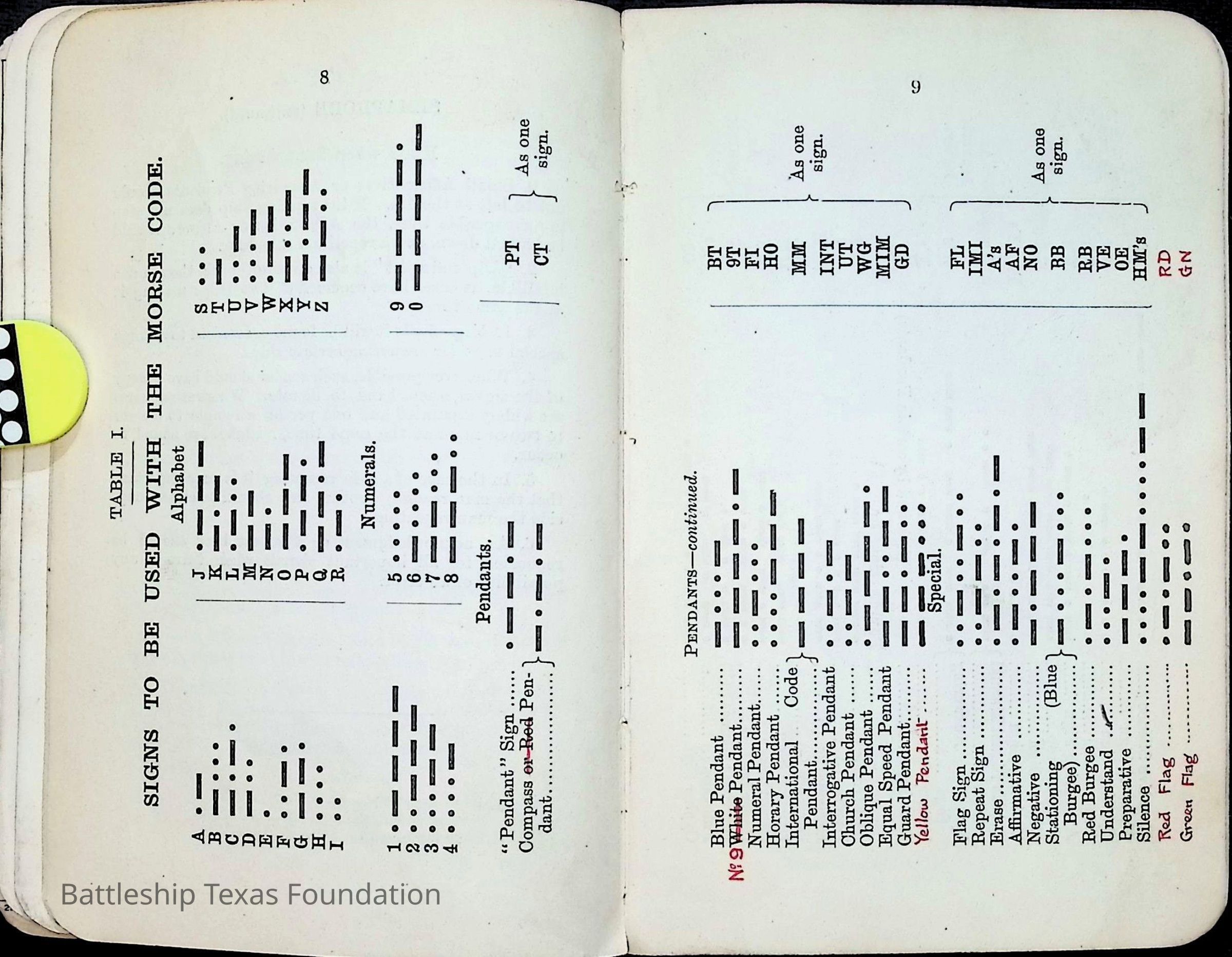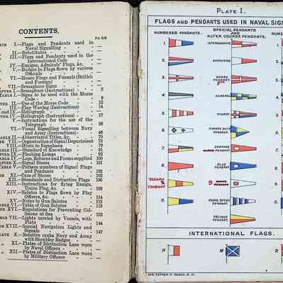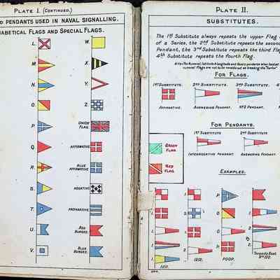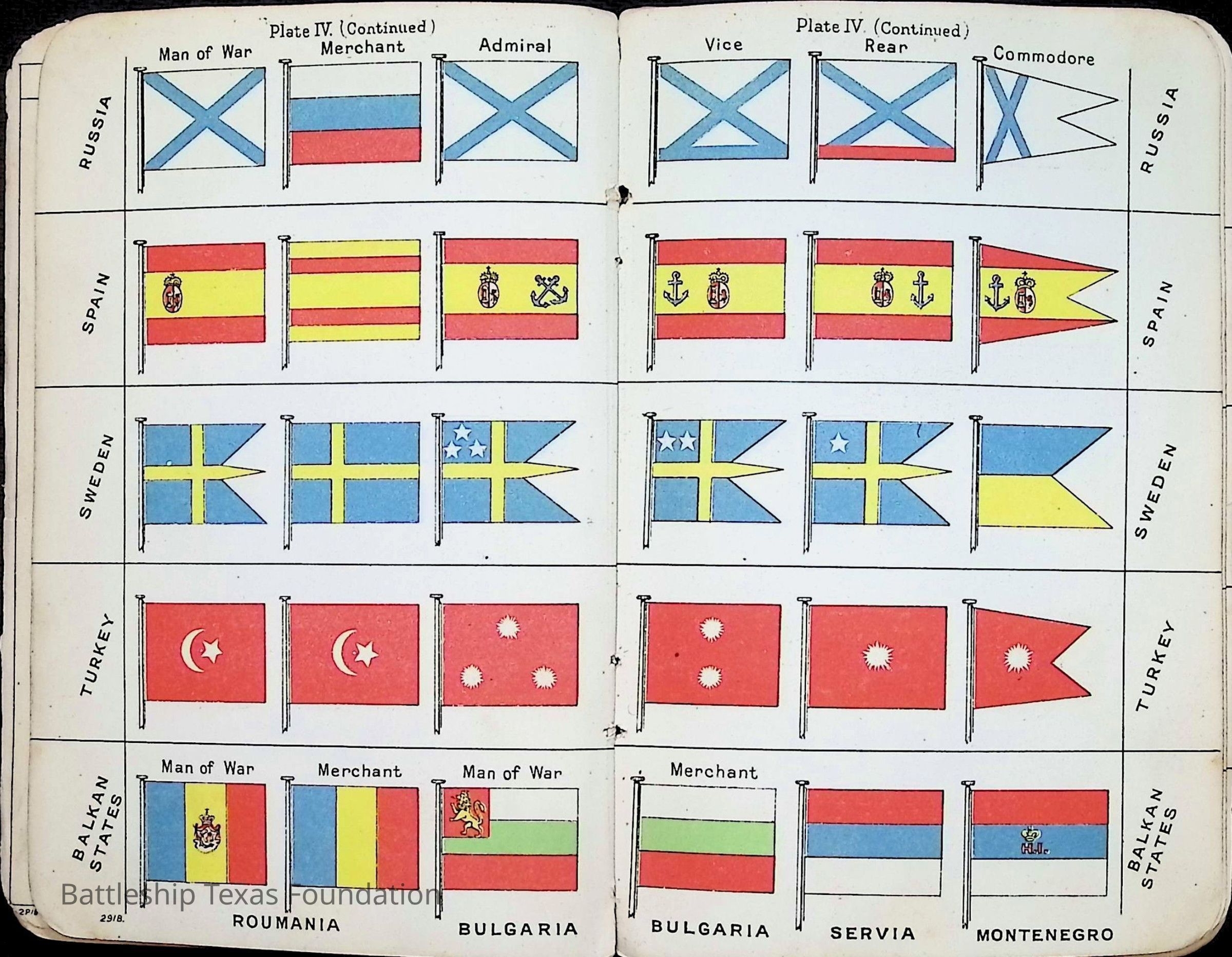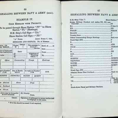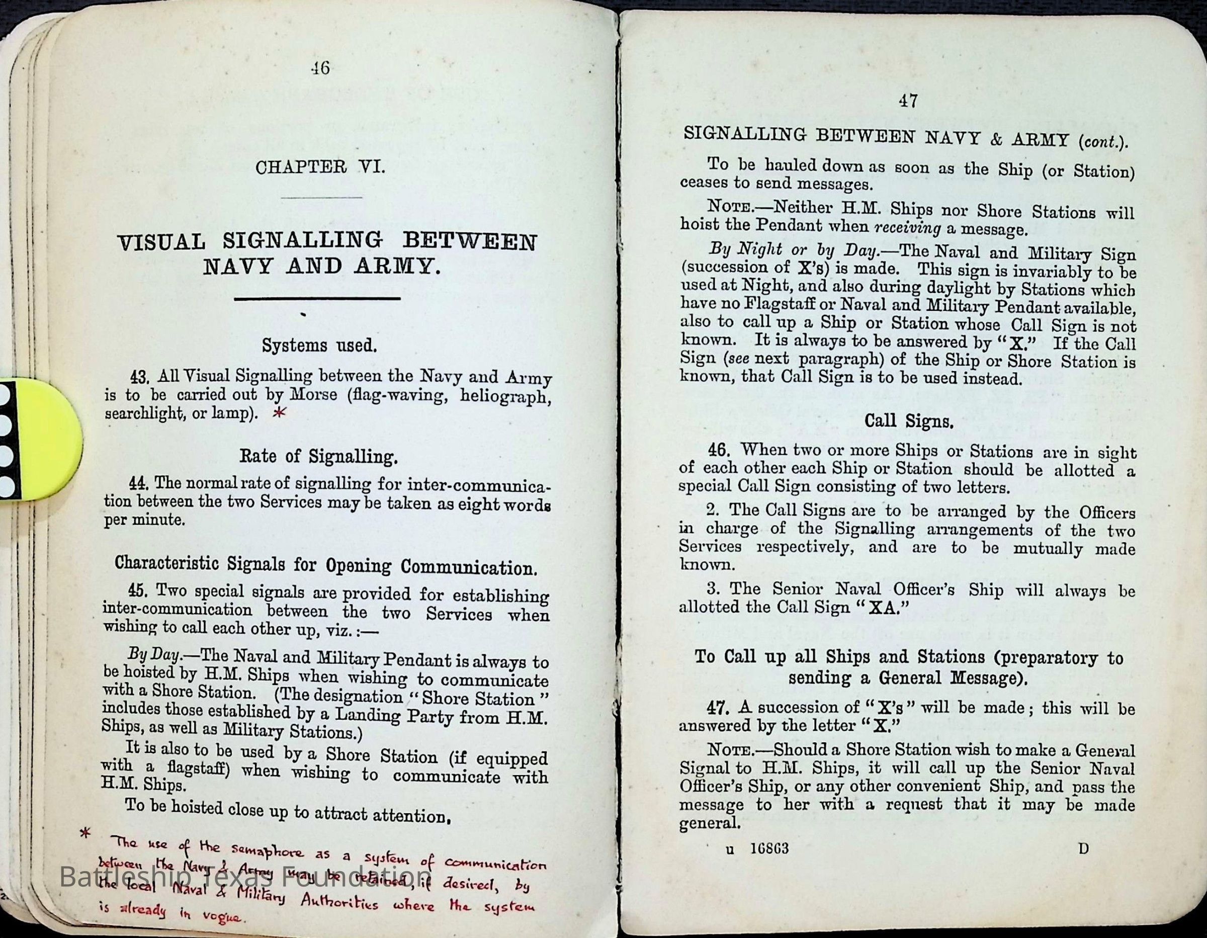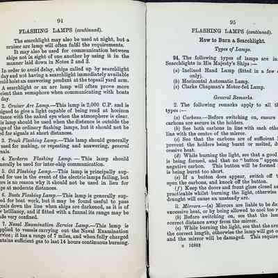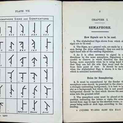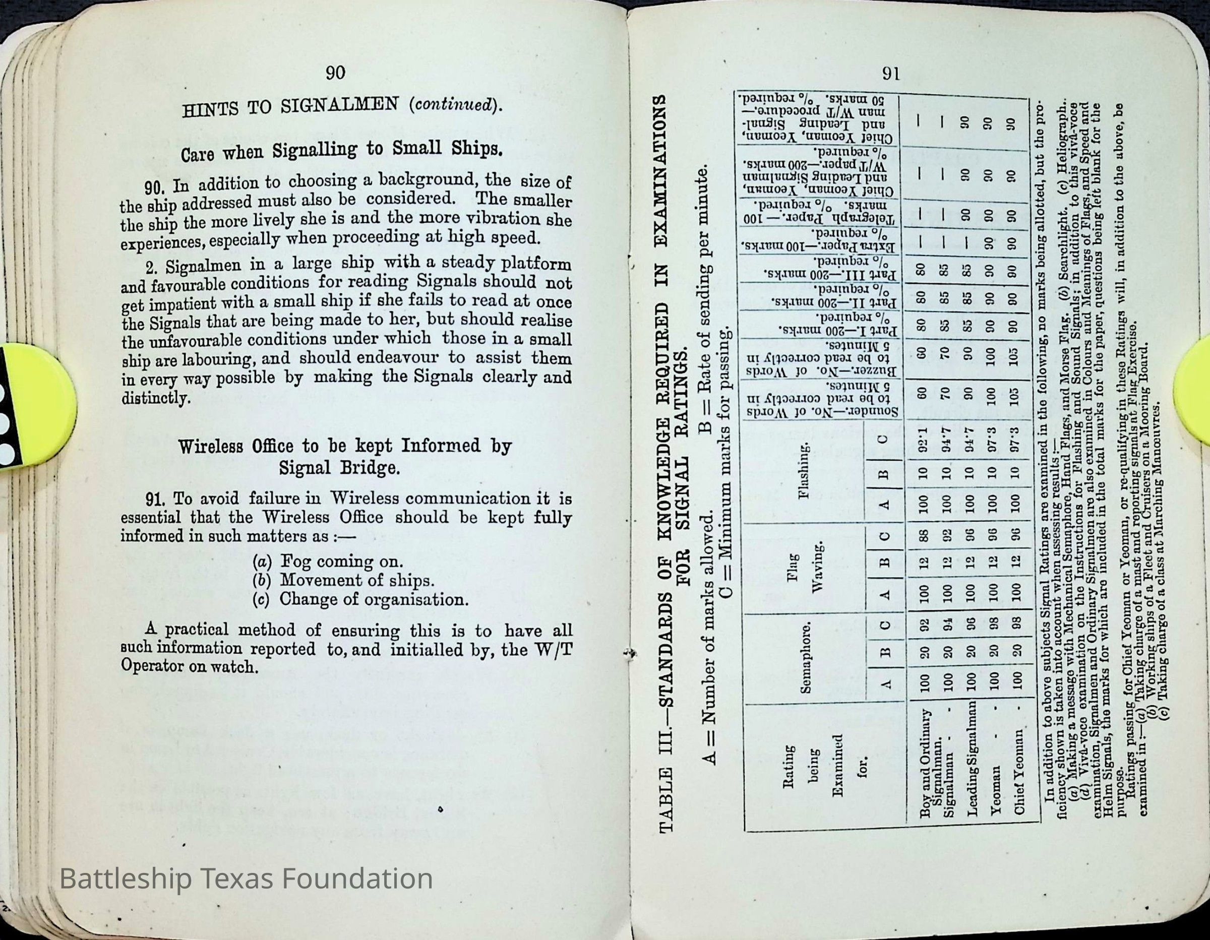 British Navy Handbook of Signalling 1913 owned by two Yeomen on USS Texas, humorously referred to as "HMS Texas" in the inside cover. Handbook was used during action with British Grand Fleet during World War One. Handbook received by crew members shortly after arriving in European waters in February 11. Dated February 24, 1918.Context