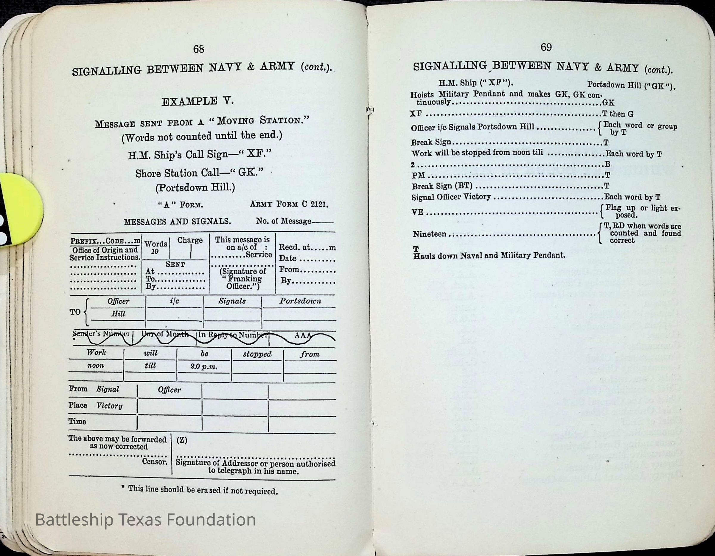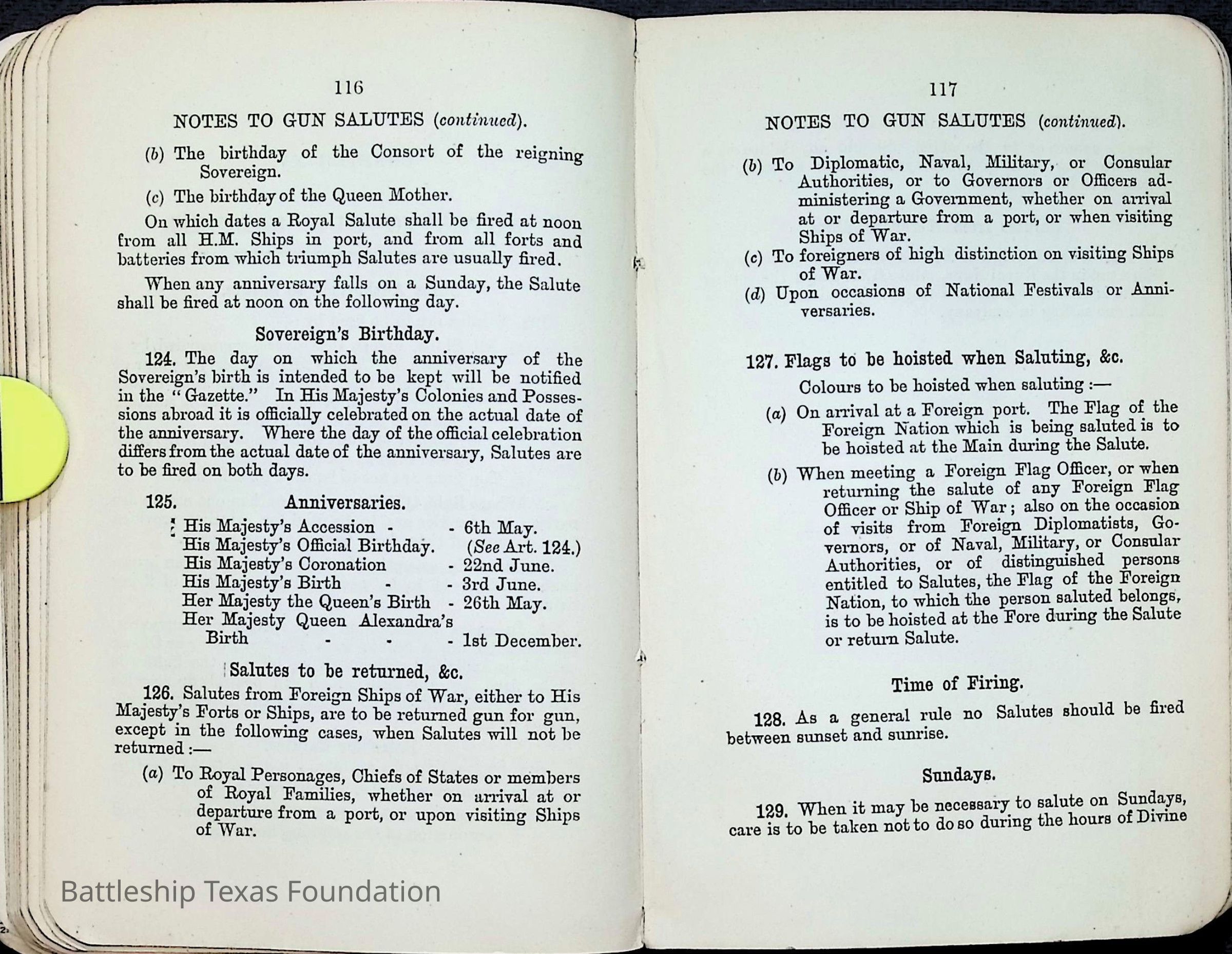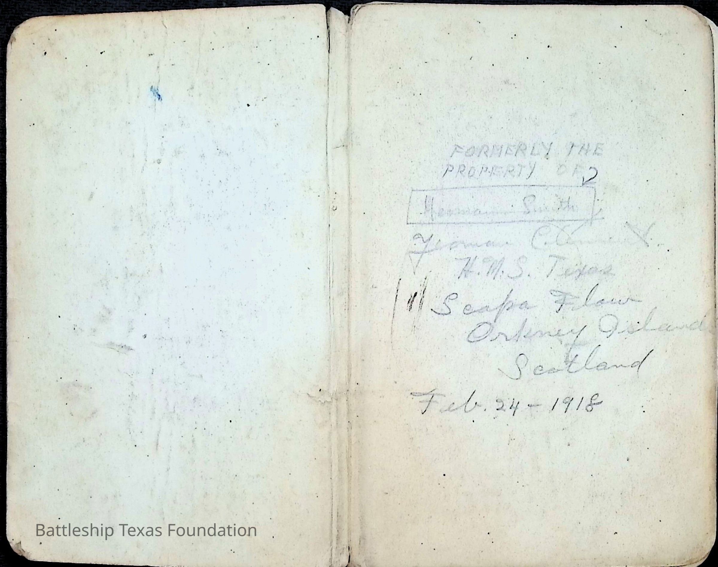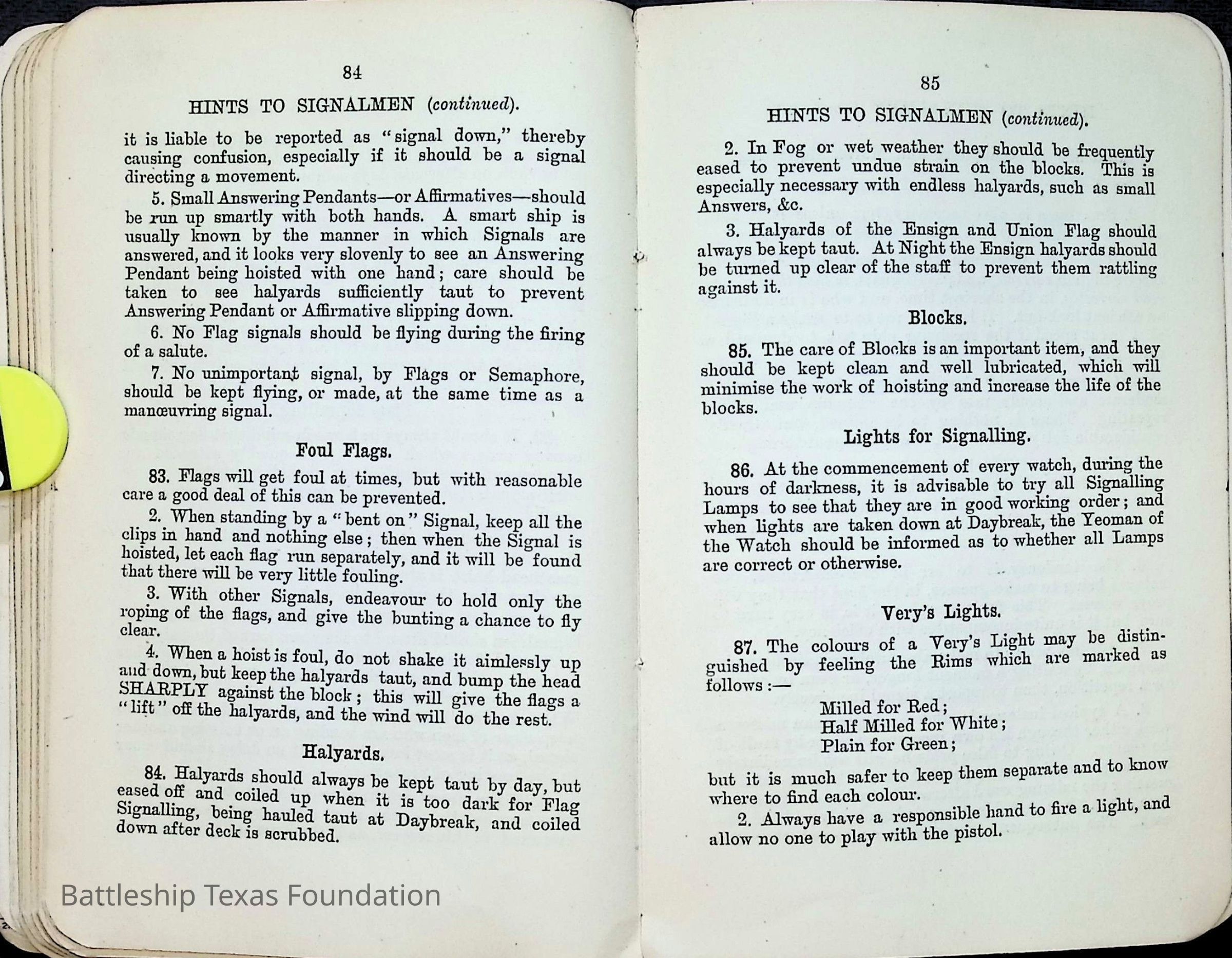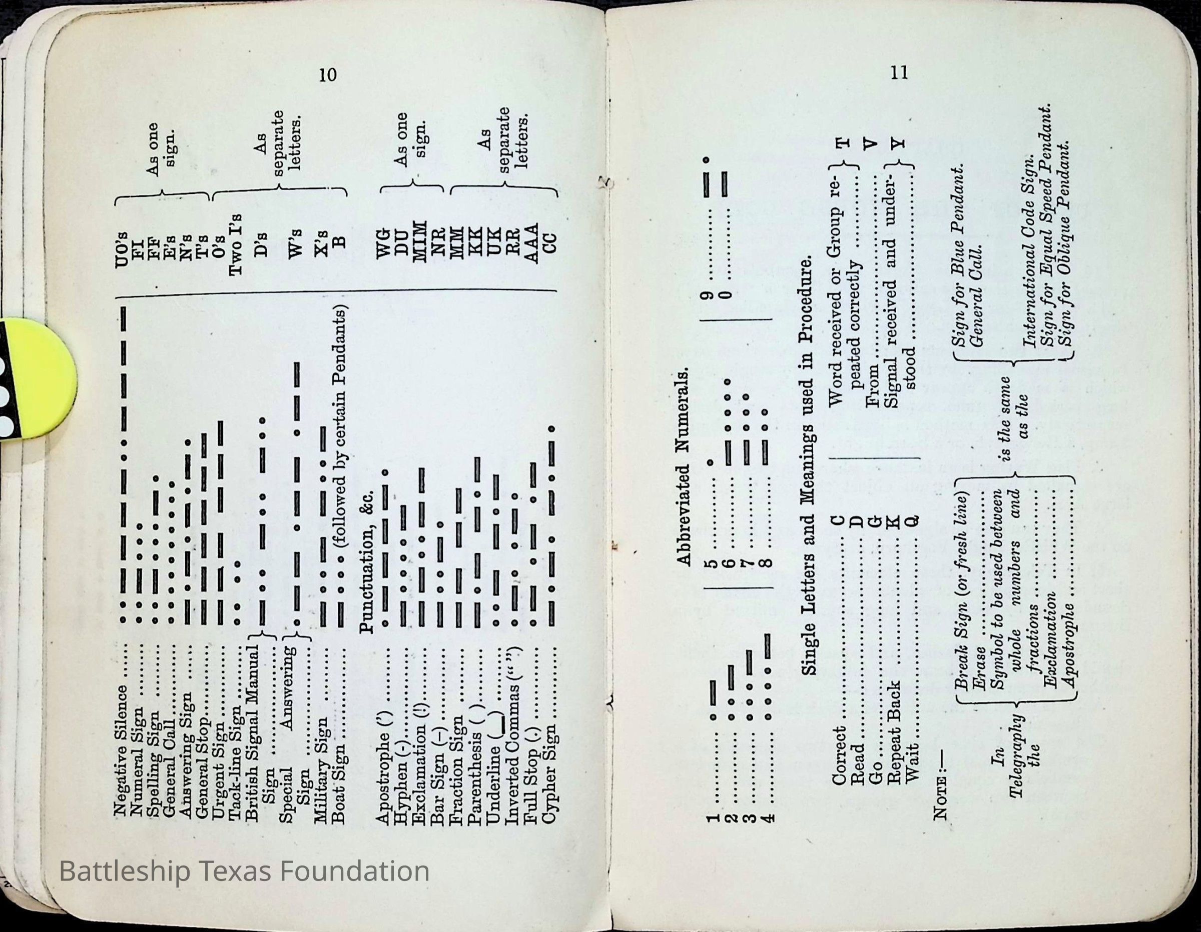 British Navy Handbook of Signalling 1913 owned by two Yeomen on USS Texas, humorously referred to as "HMS Texas" in the inside cover. Handbook was used during action with British Grand Fleet during World War One. Handbook received by crew members shortly after arriving in European waters in February 11. Dated February 24, 1918.Context