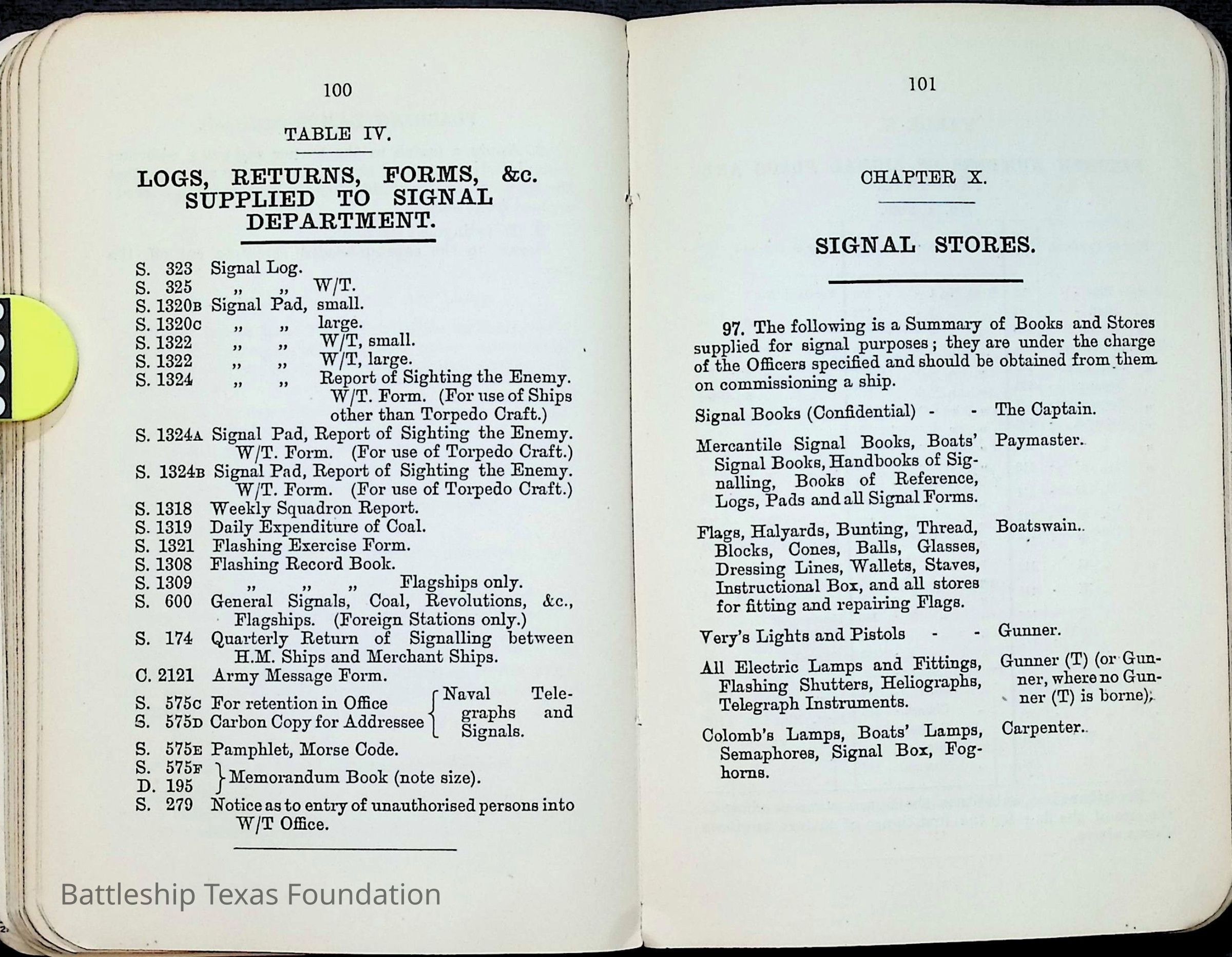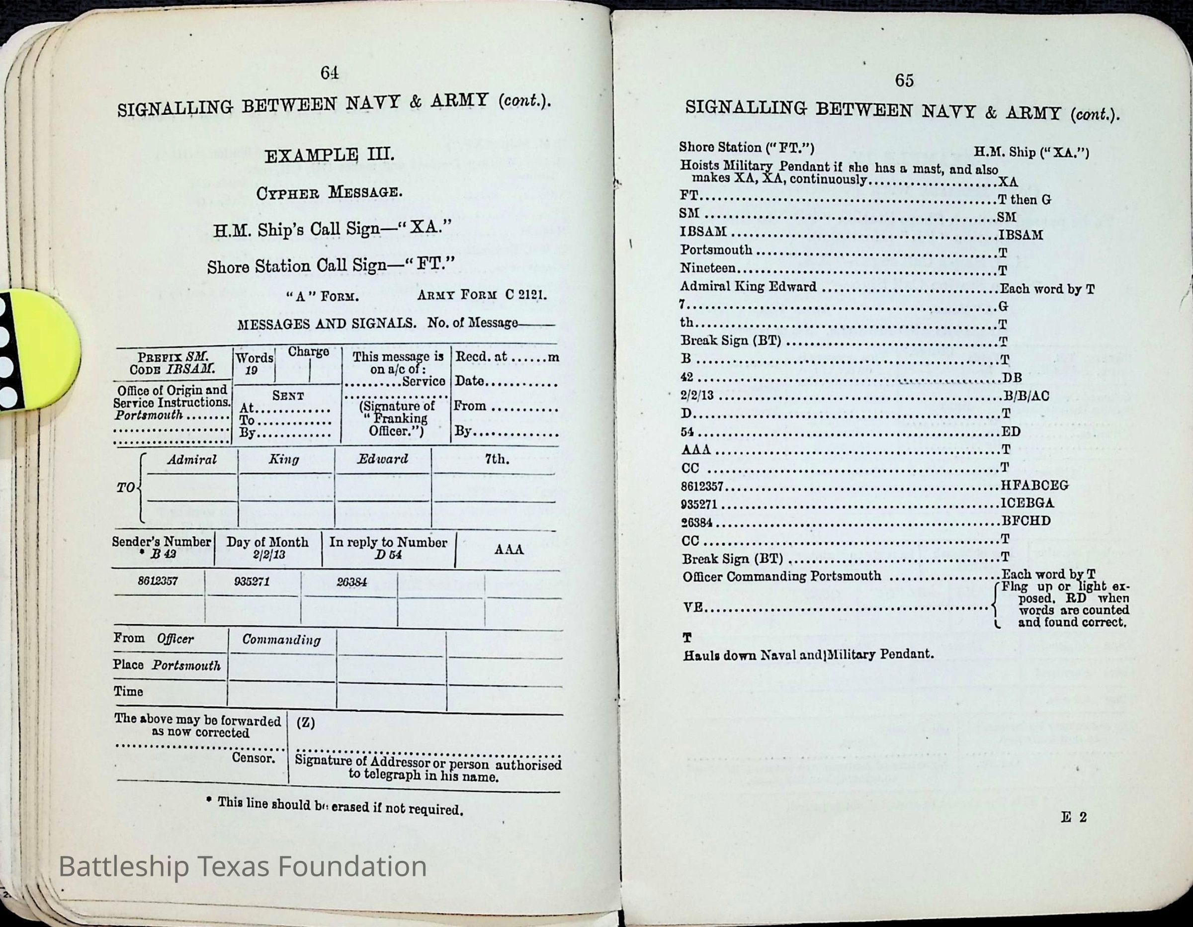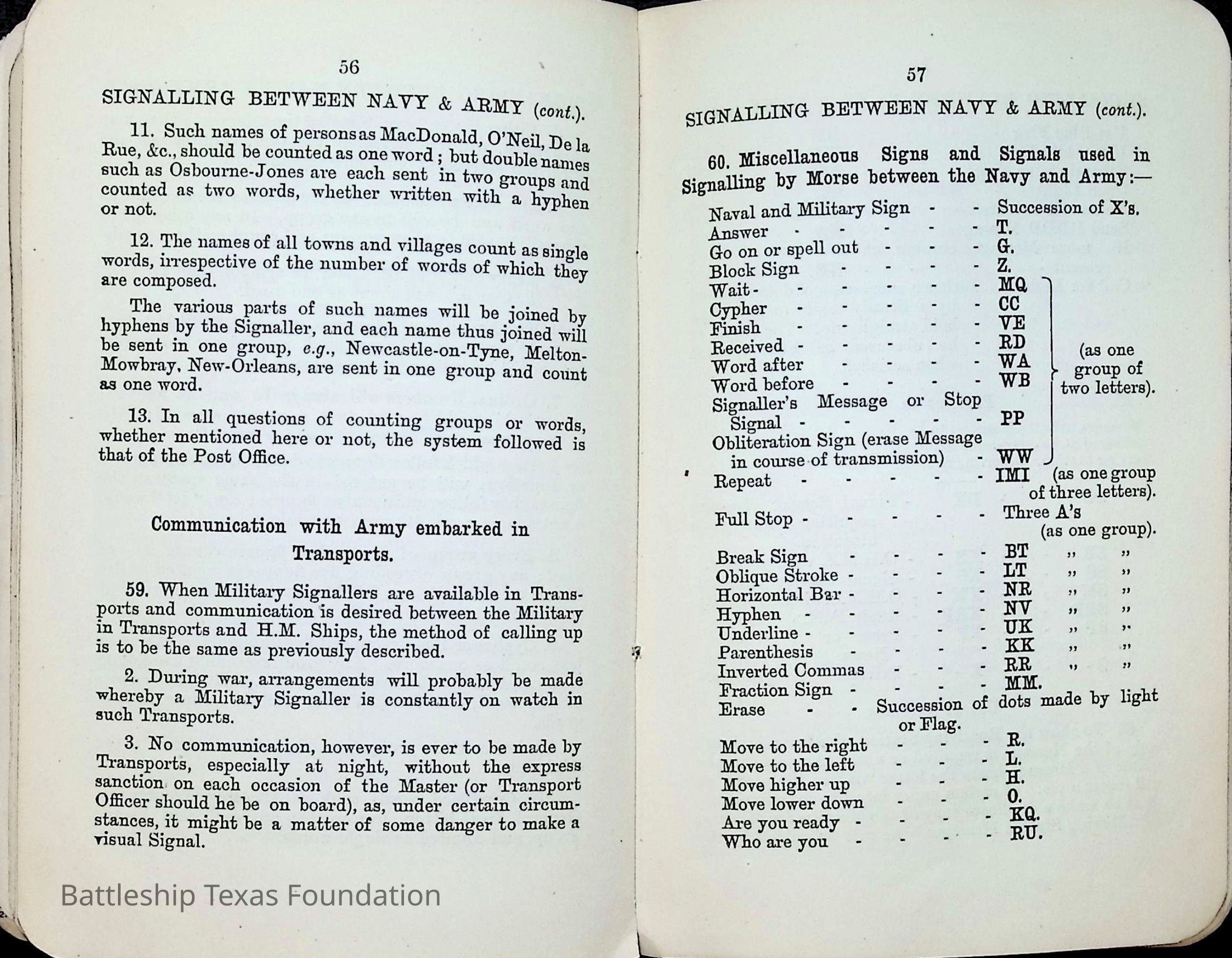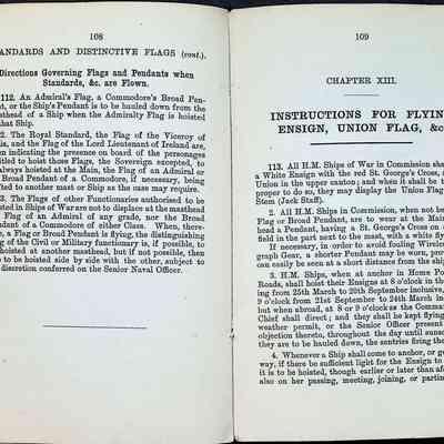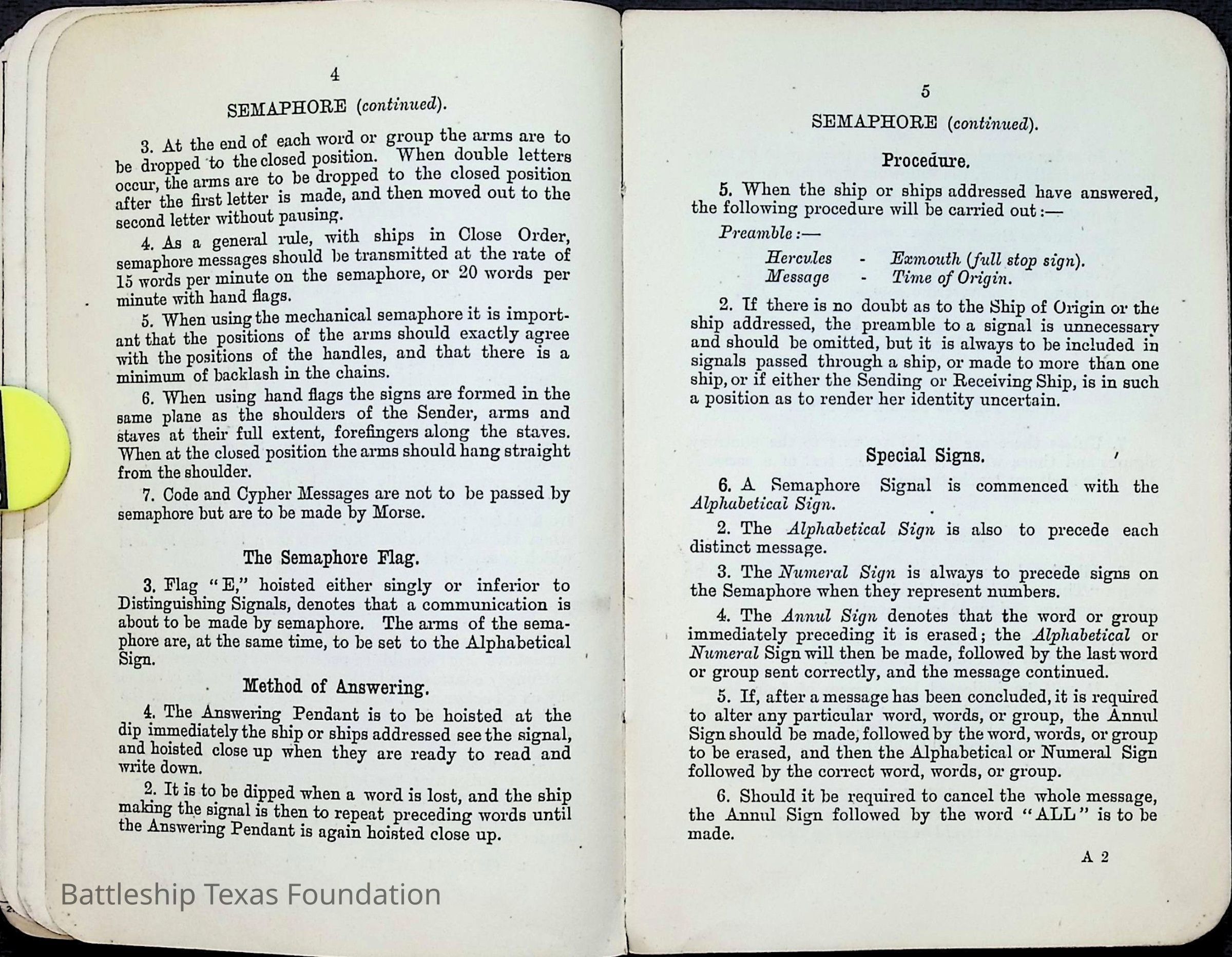 British Navy Handbook of Signalling 1913 owned by two Yeomen on USS Texas, humorously referred to as "HMS Texas" in the inside cover. Handbook was used during action with British Grand Fleet during World War One. Handbook received by crew members shortly after arriving in European waters in February 11. Dated February 24, 1918.Context