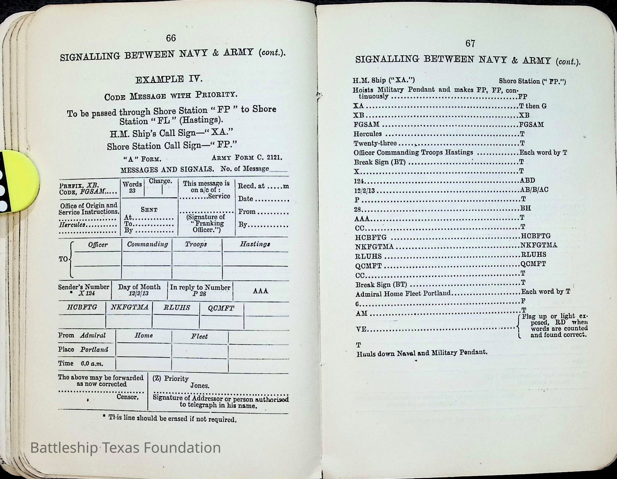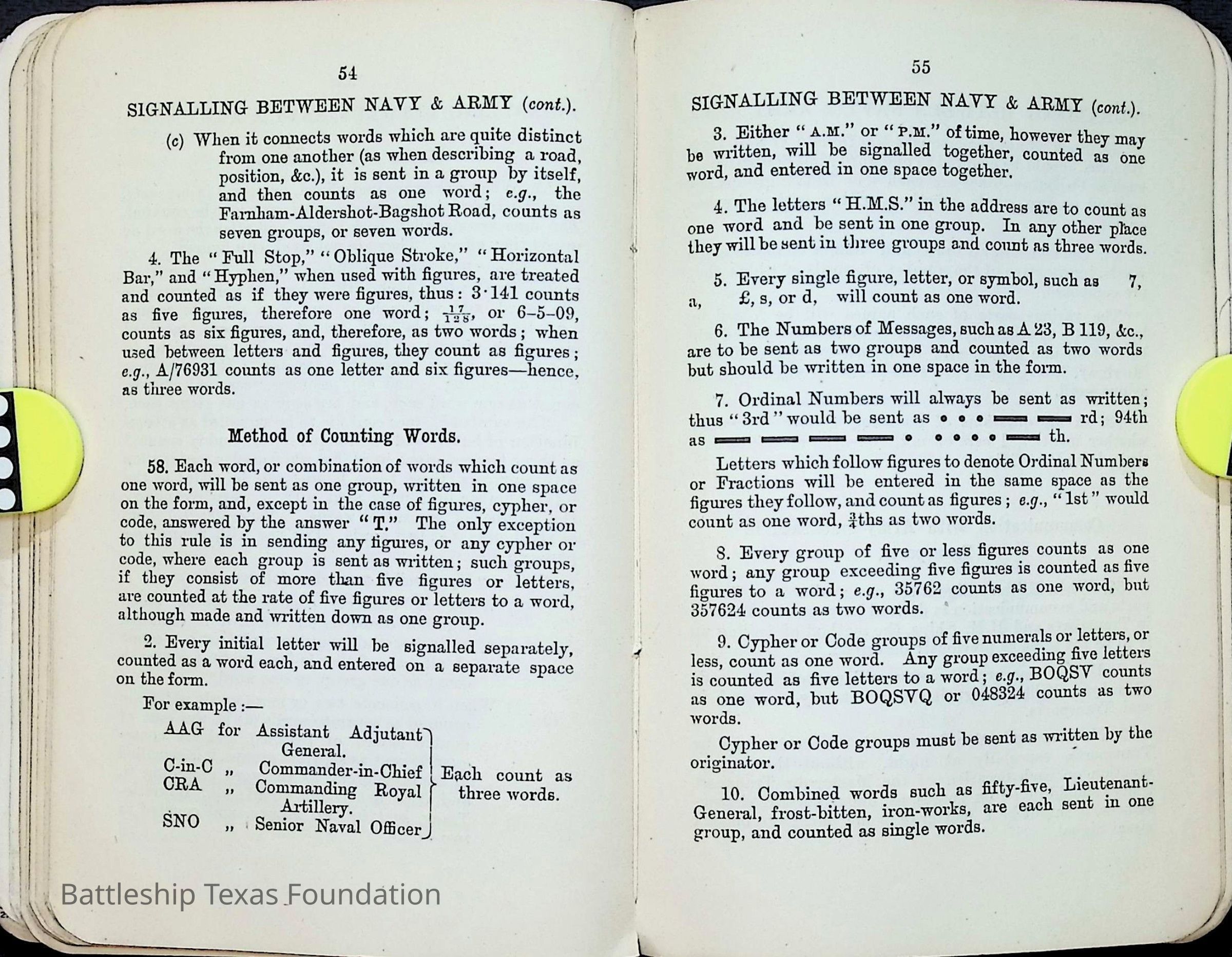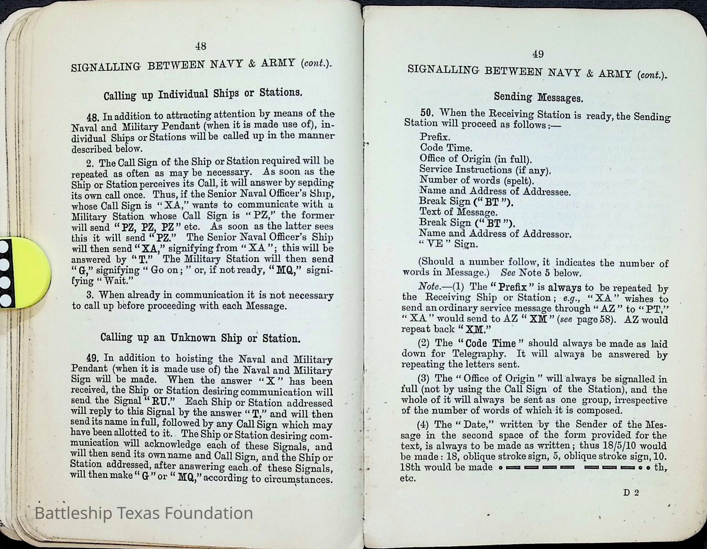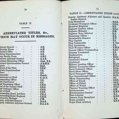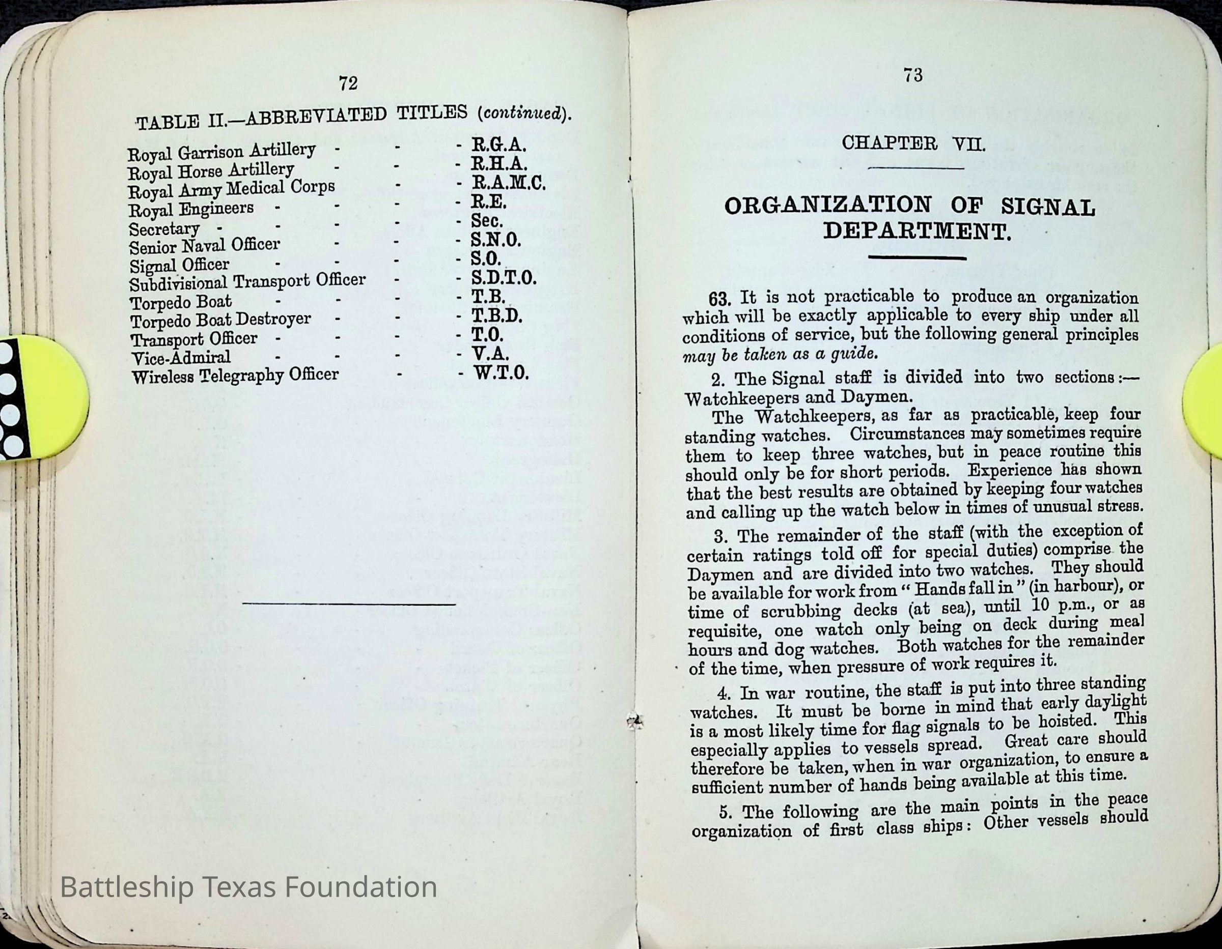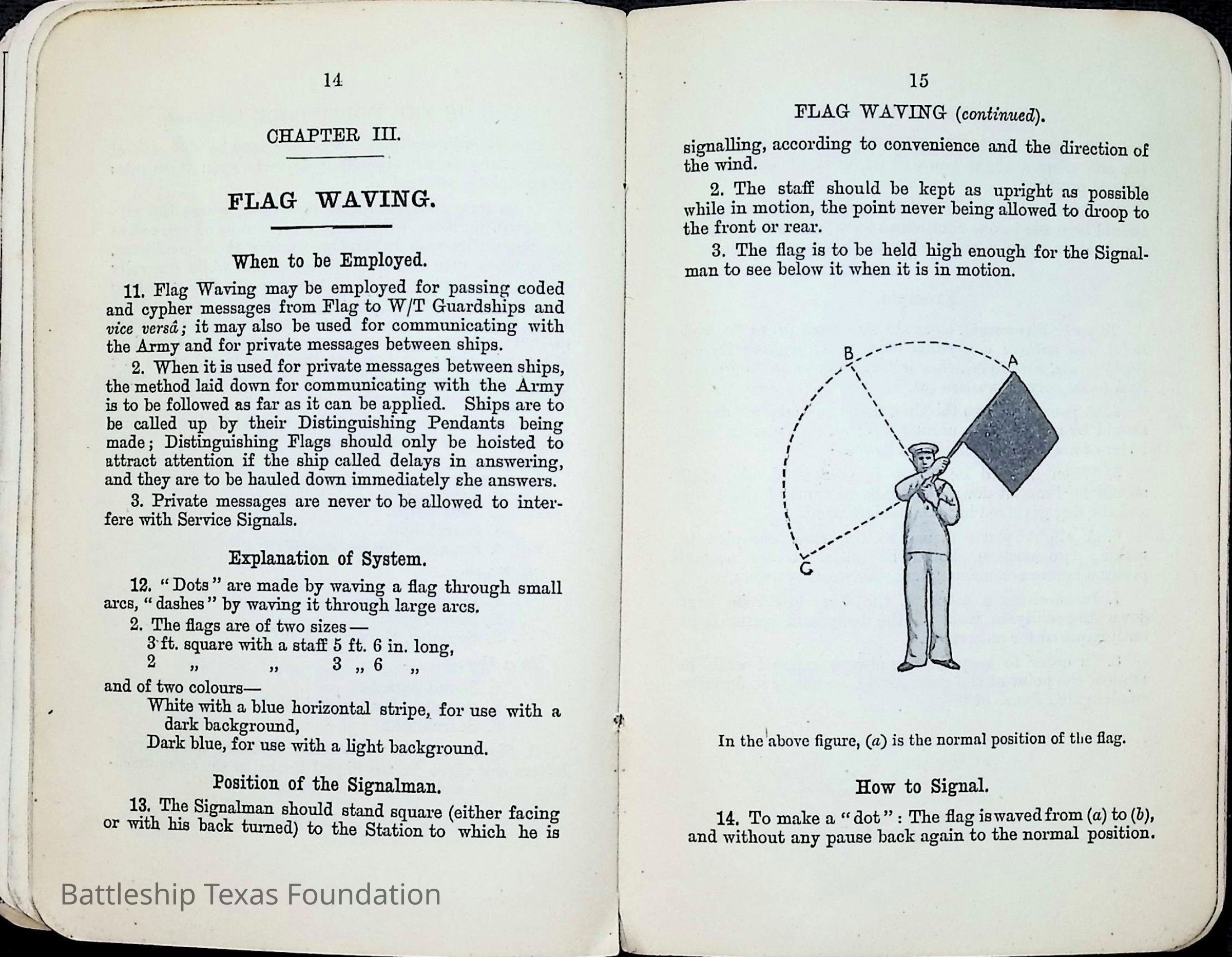 British Navy Handbook of Signalling 1913 owned by two Yeomen on USS Texas, humorously referred to as "HMS Texas" in the inside cover. Handbook was used during action with British Grand Fleet during World War One. Handbook received by crew members shortly after arriving in European waters in February 11. Dated February 24, 1918.Context