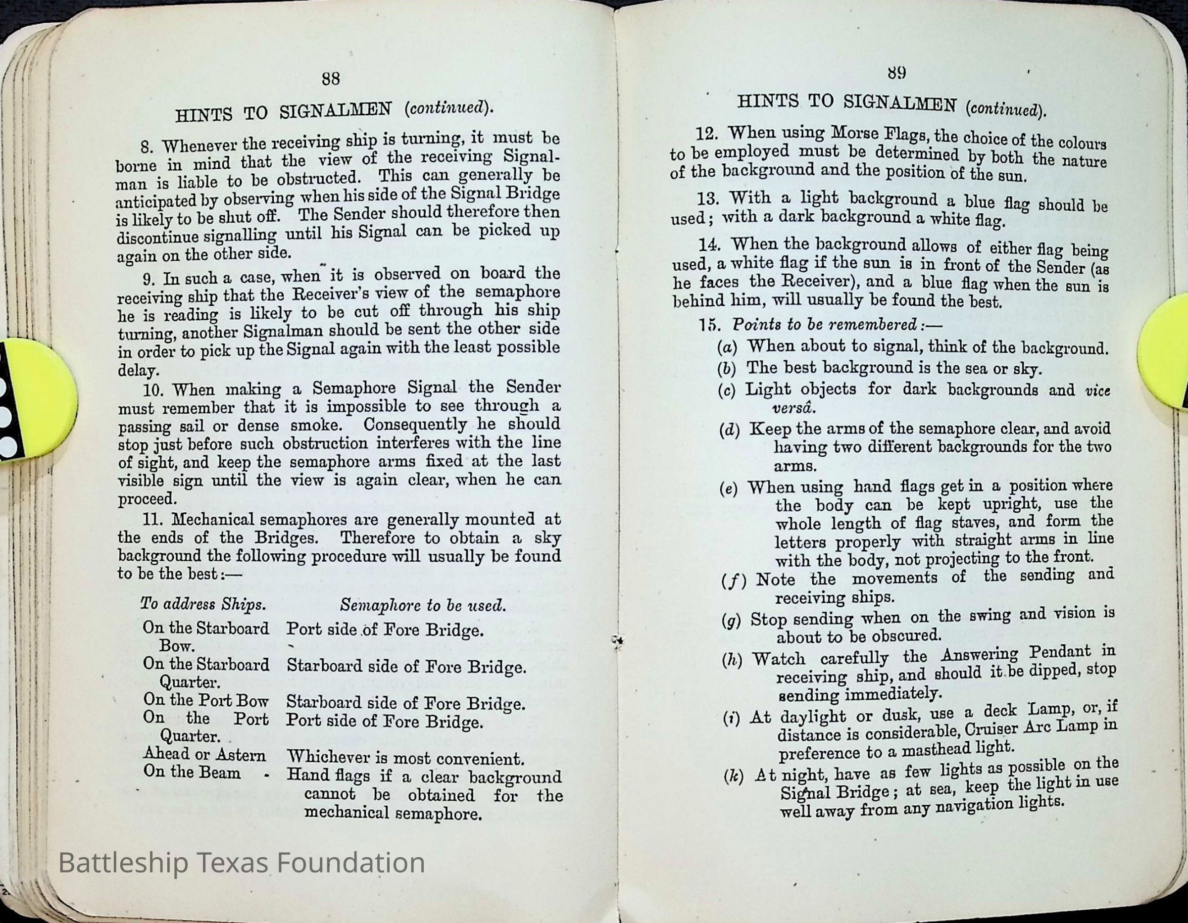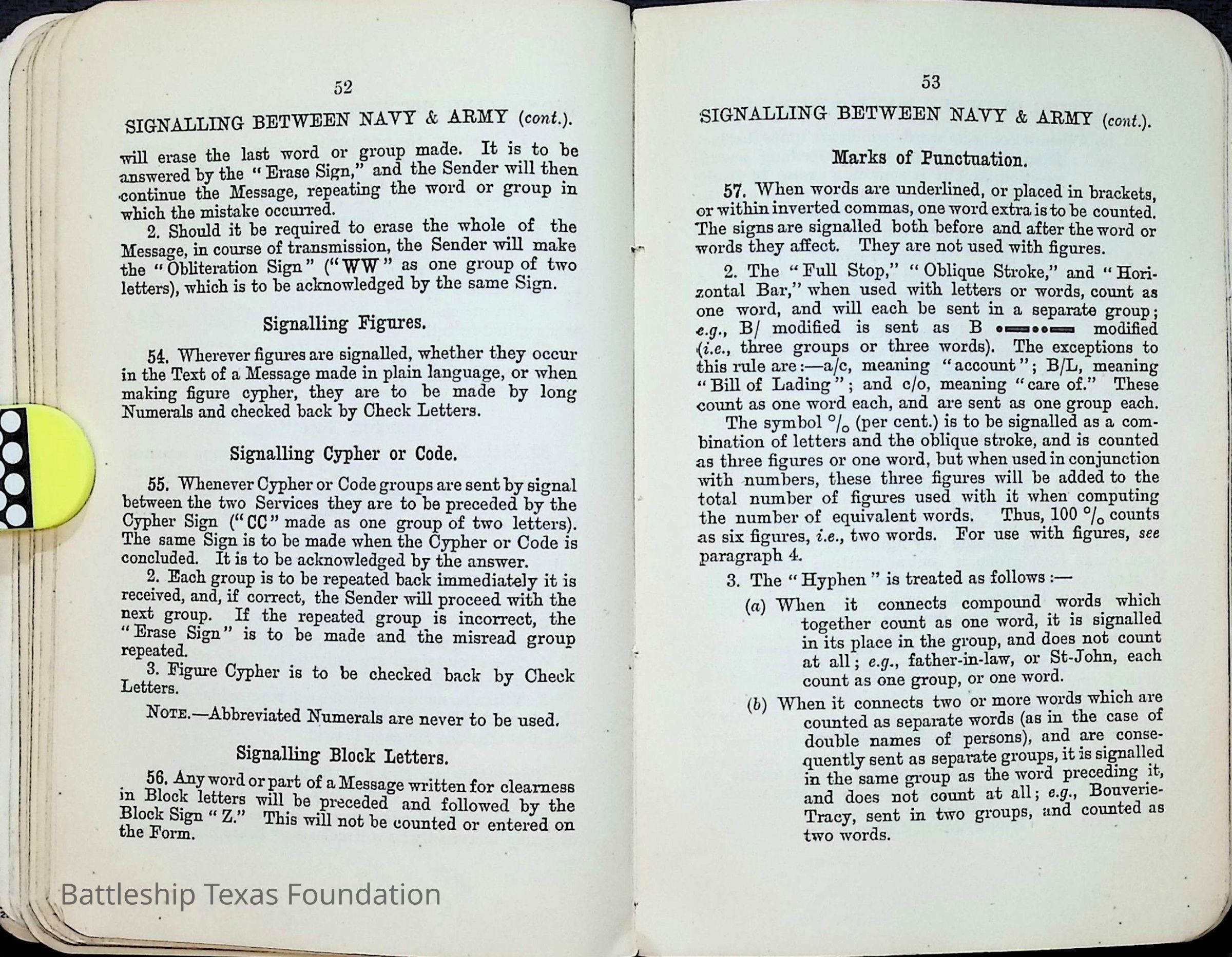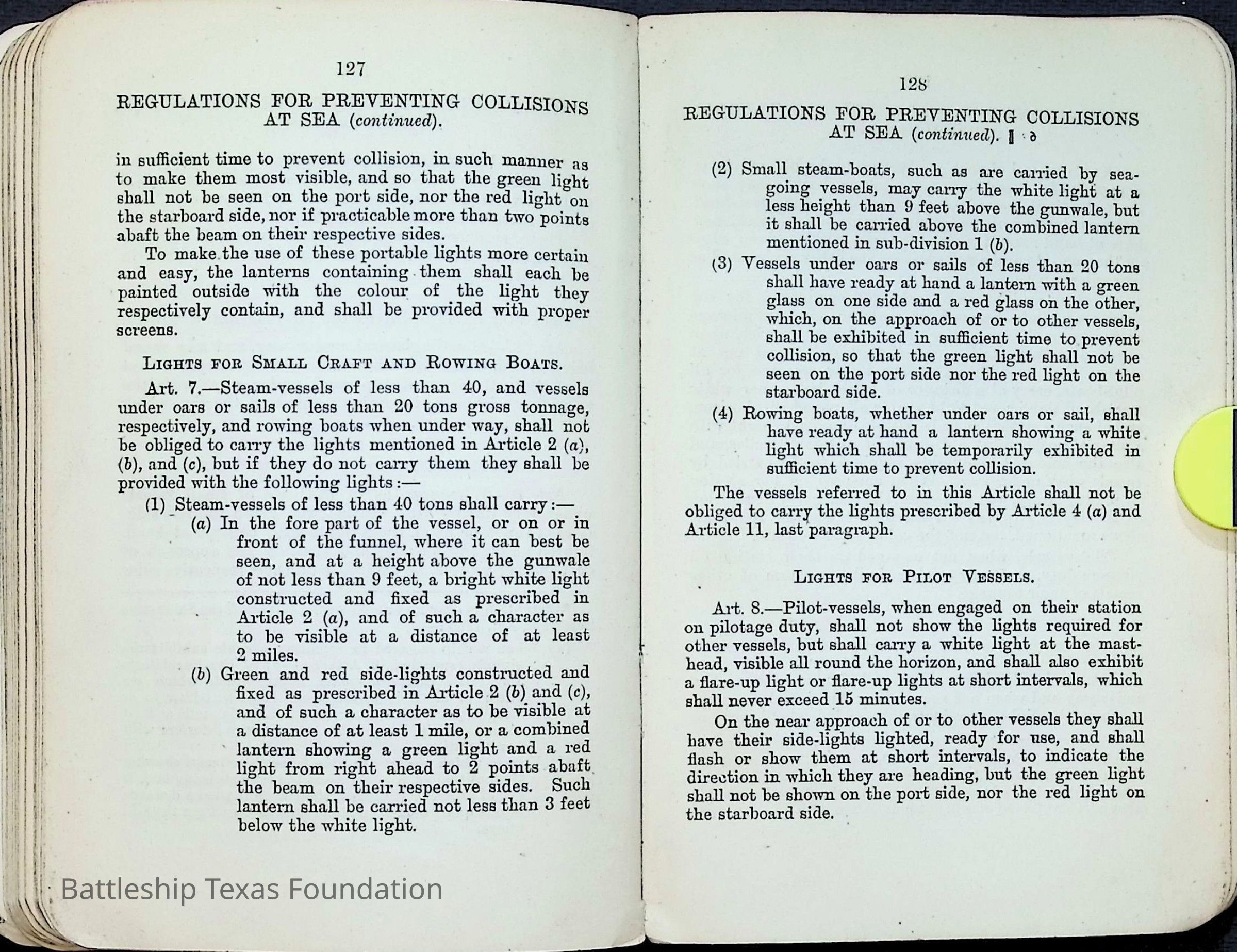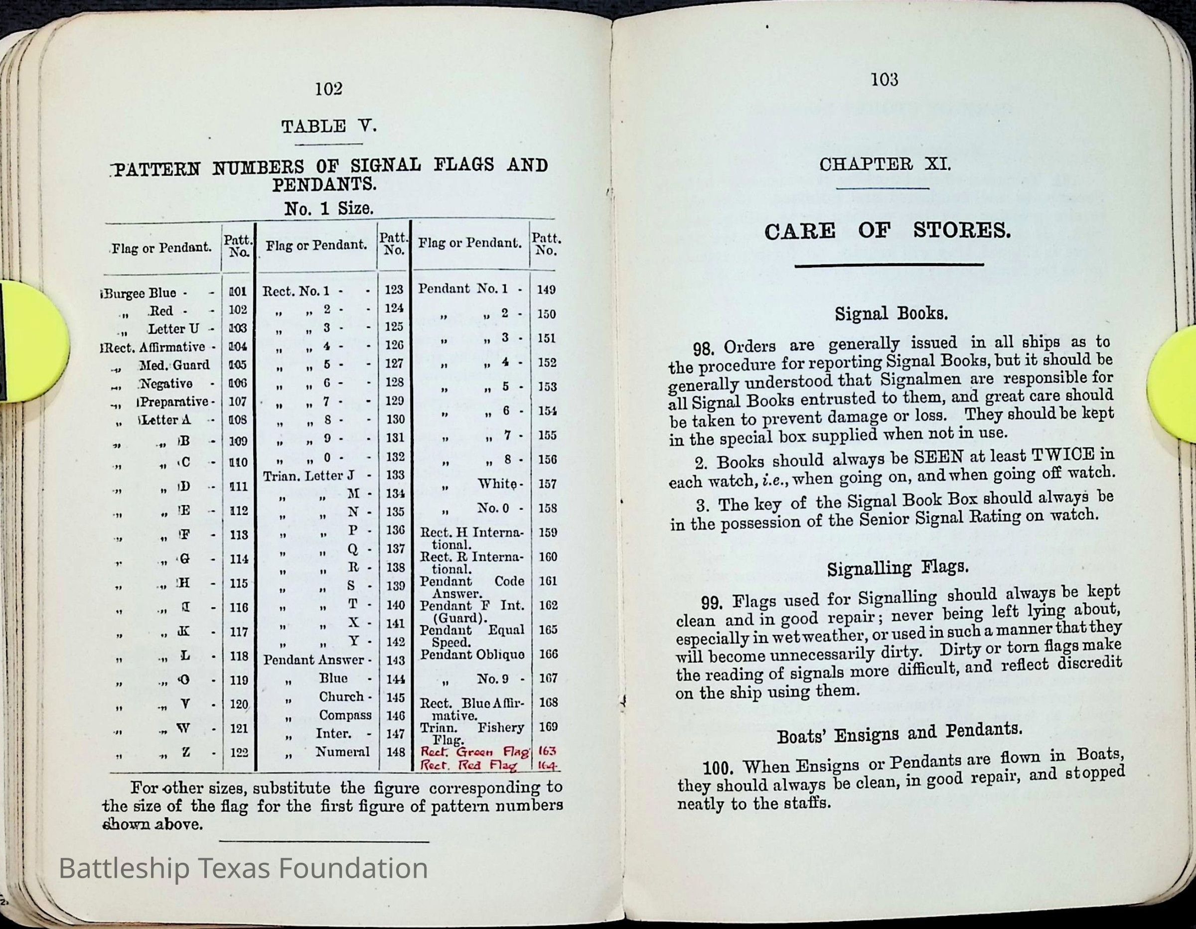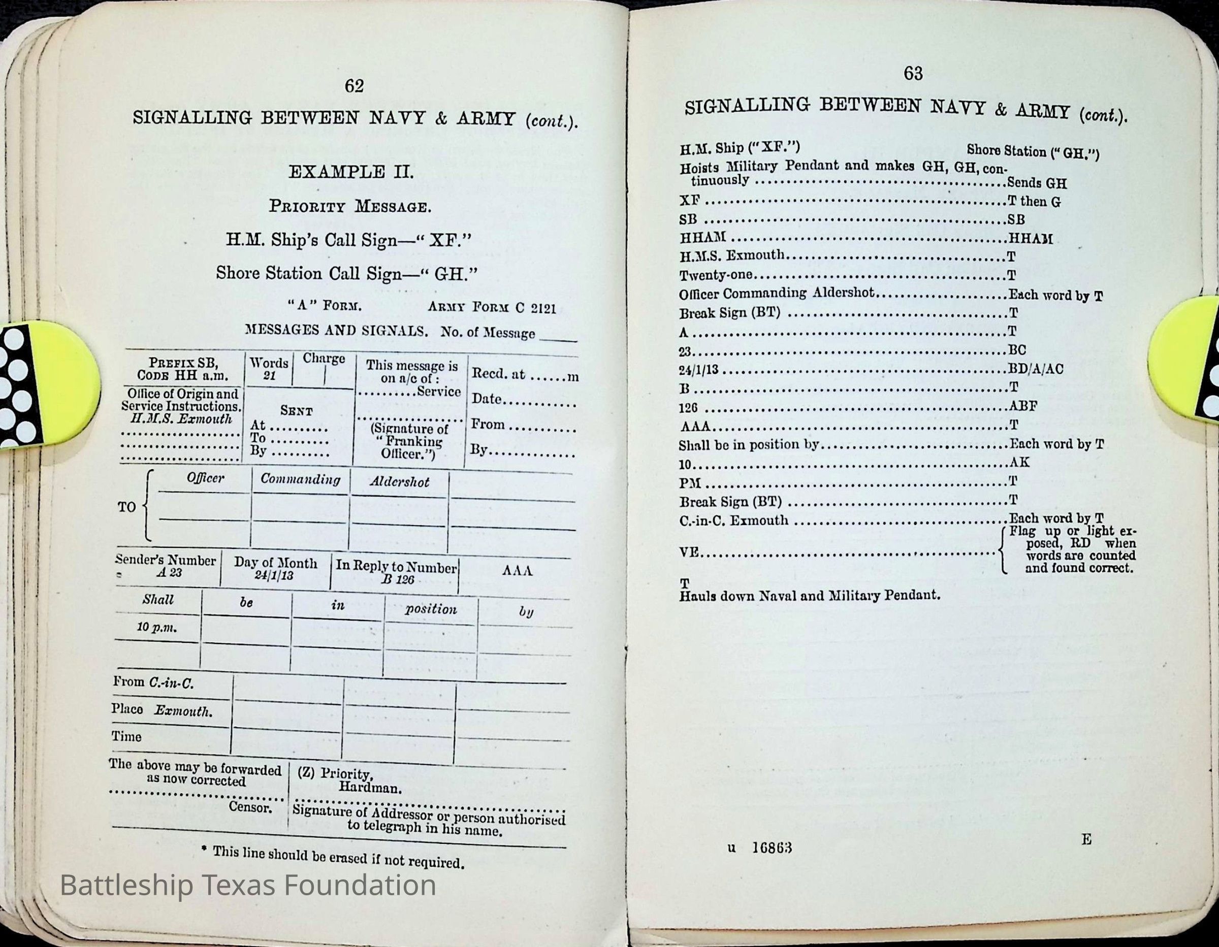 British Navy Handbook of Signalling 1913 owned by two Yeomen on USS Texas, humorously referred to as "HMS Texas" in the inside cover. Handbook was used during action with British Grand Fleet during World War One. Handbook received by crew members shortly after arriving in European waters in February 11. Dated February 24, 1918.Context