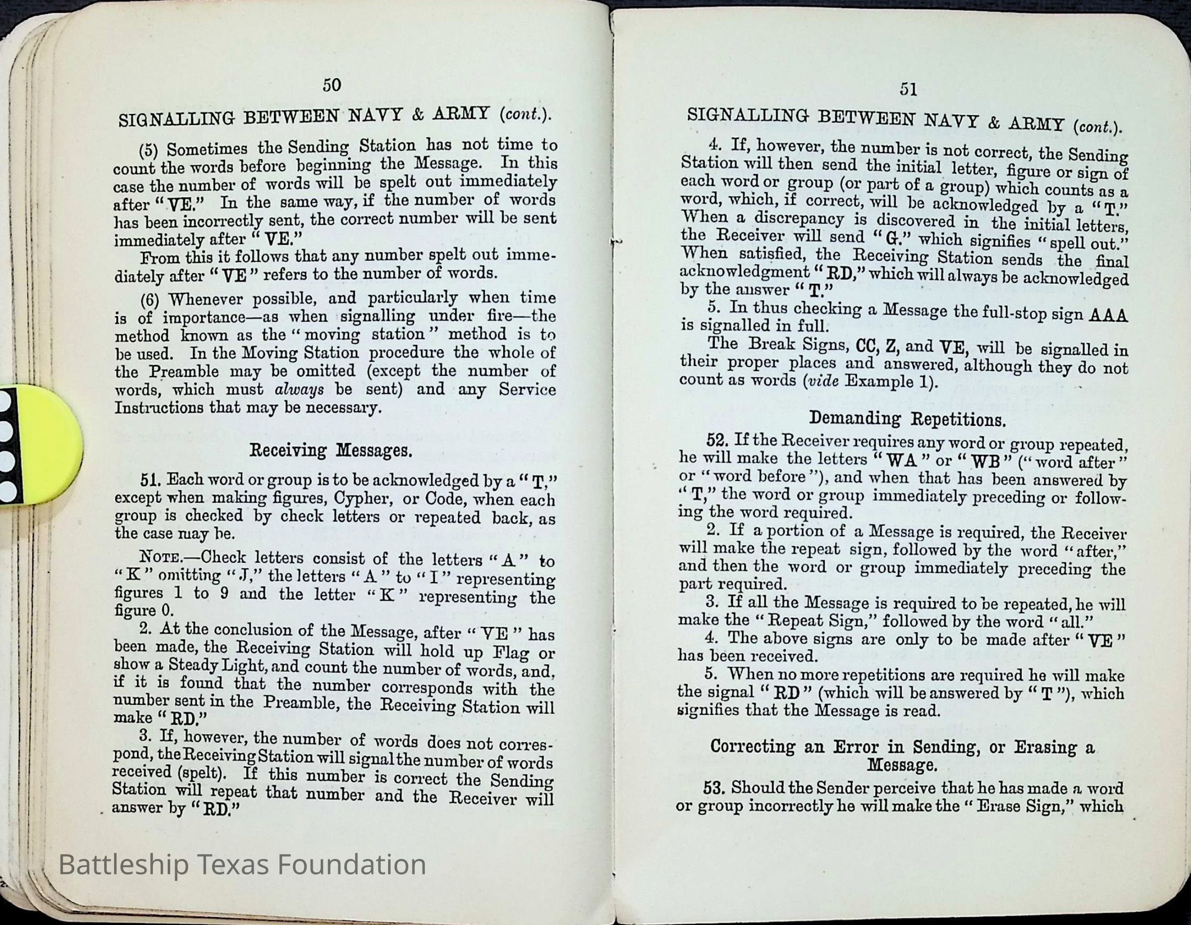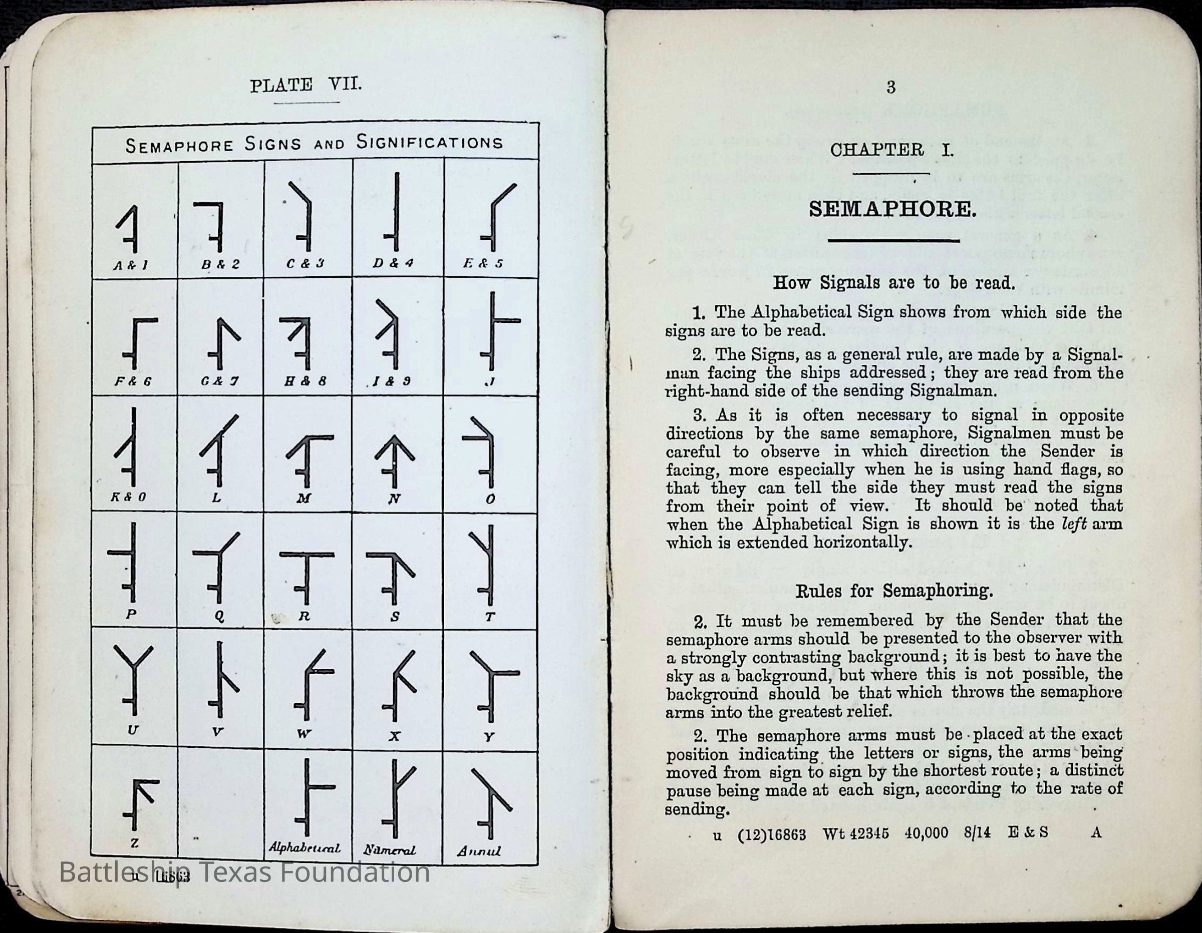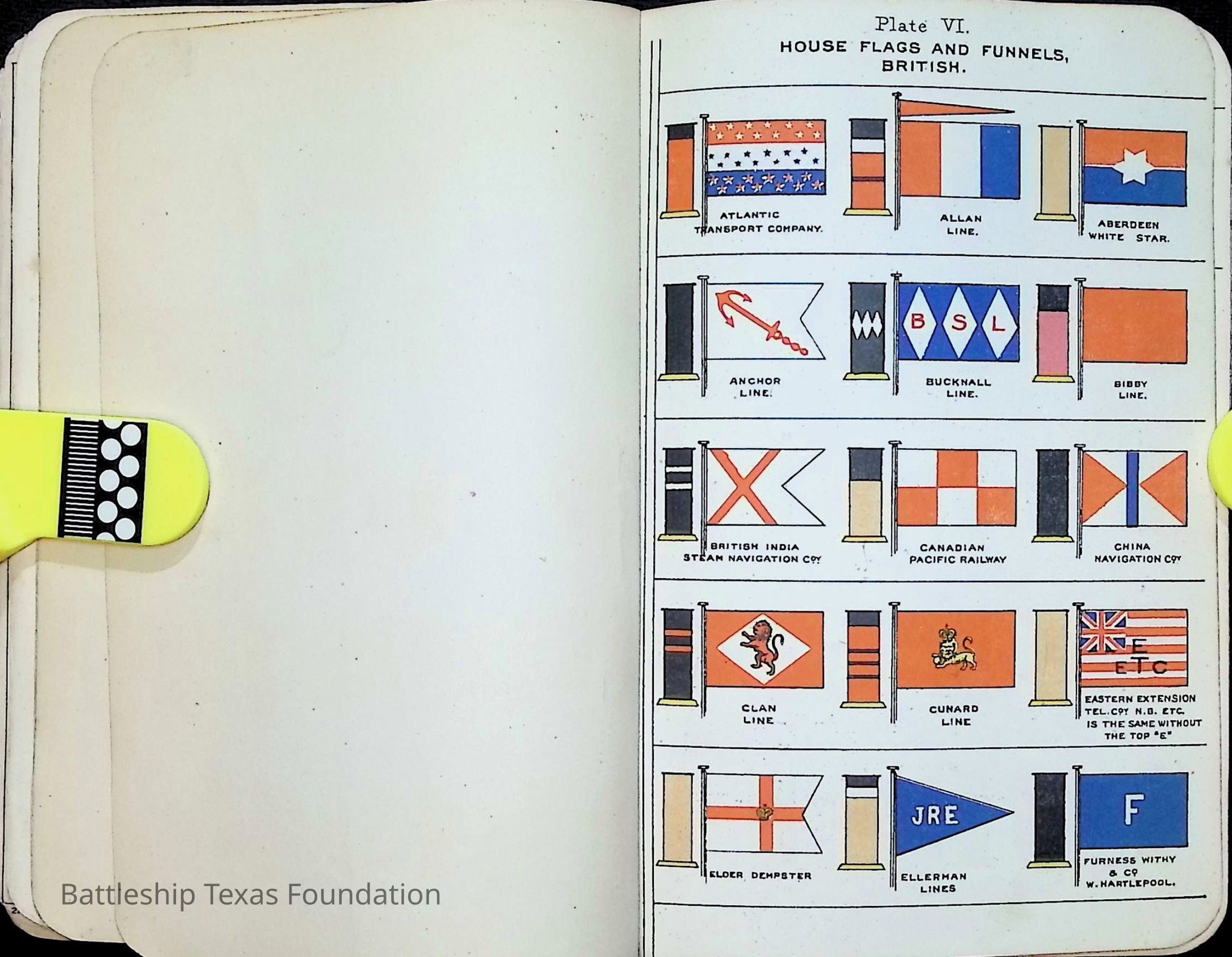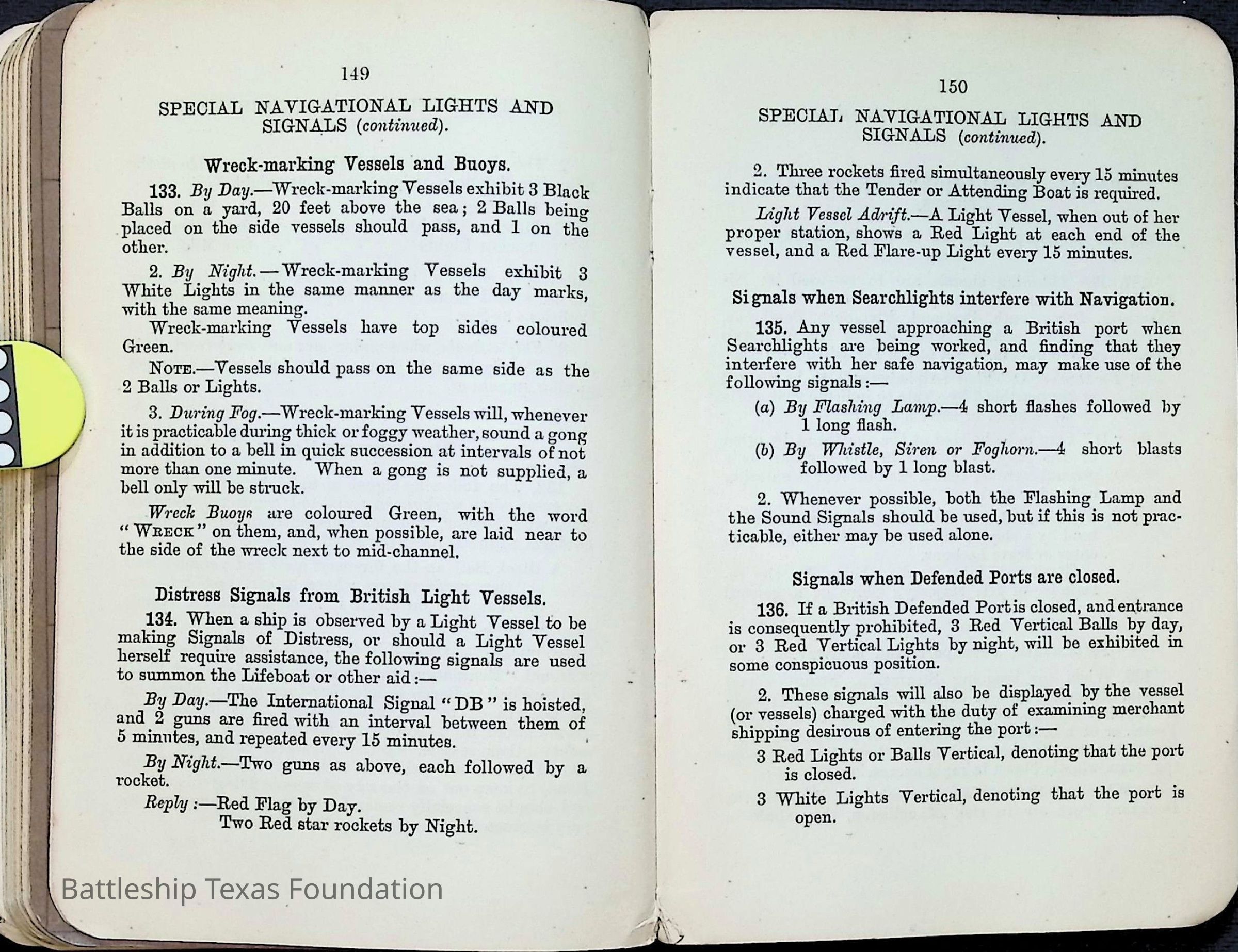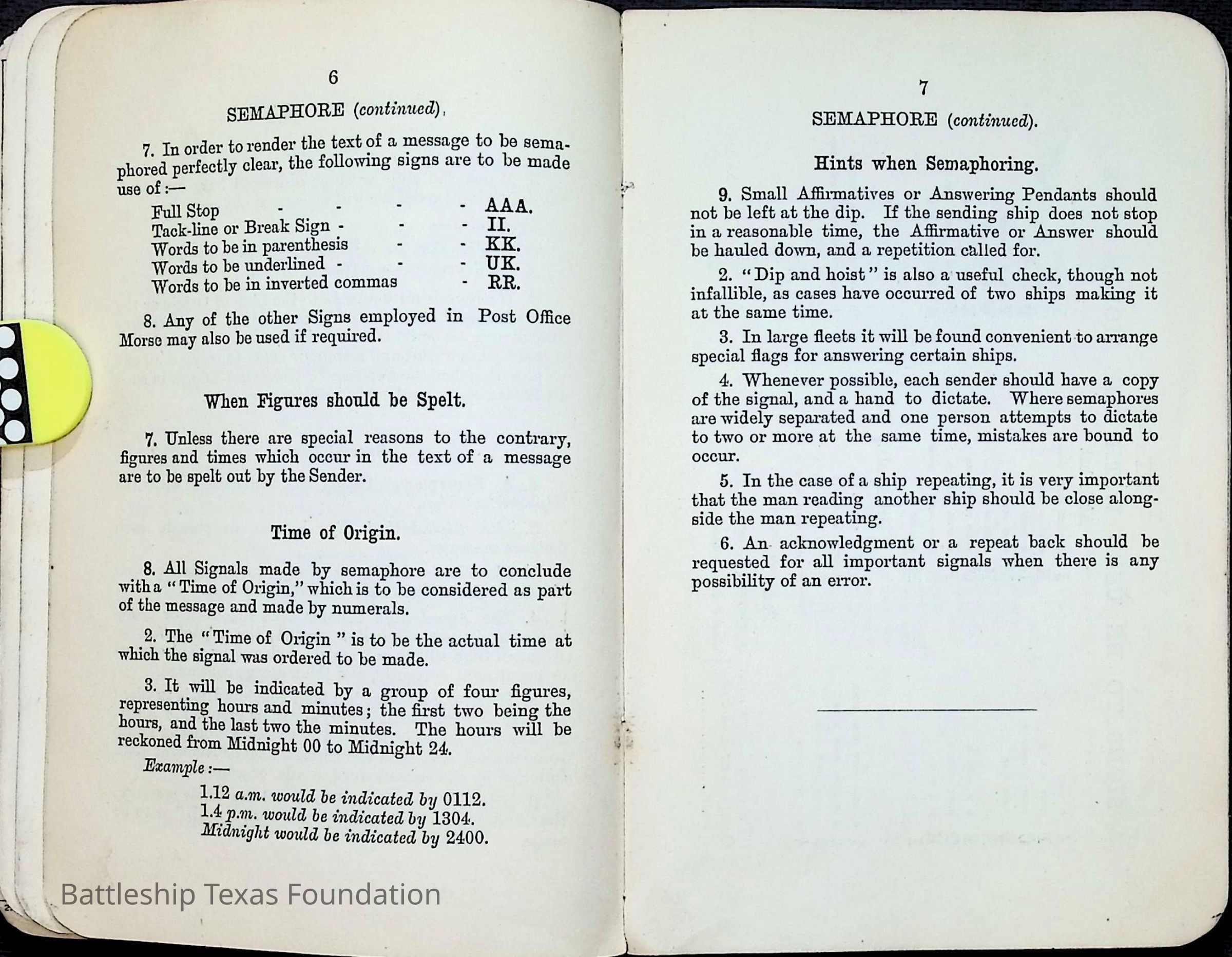 British Navy Handbook of Signalling 1913 owned by two Yeomen on USS Texas, humorously referred to as "HMS Texas" in the inside cover. Handbook was used during action with British Grand Fleet during World War One. Handbook received by crew members shortly after arriving in European waters in February 11. Dated February 24, 1918.Context